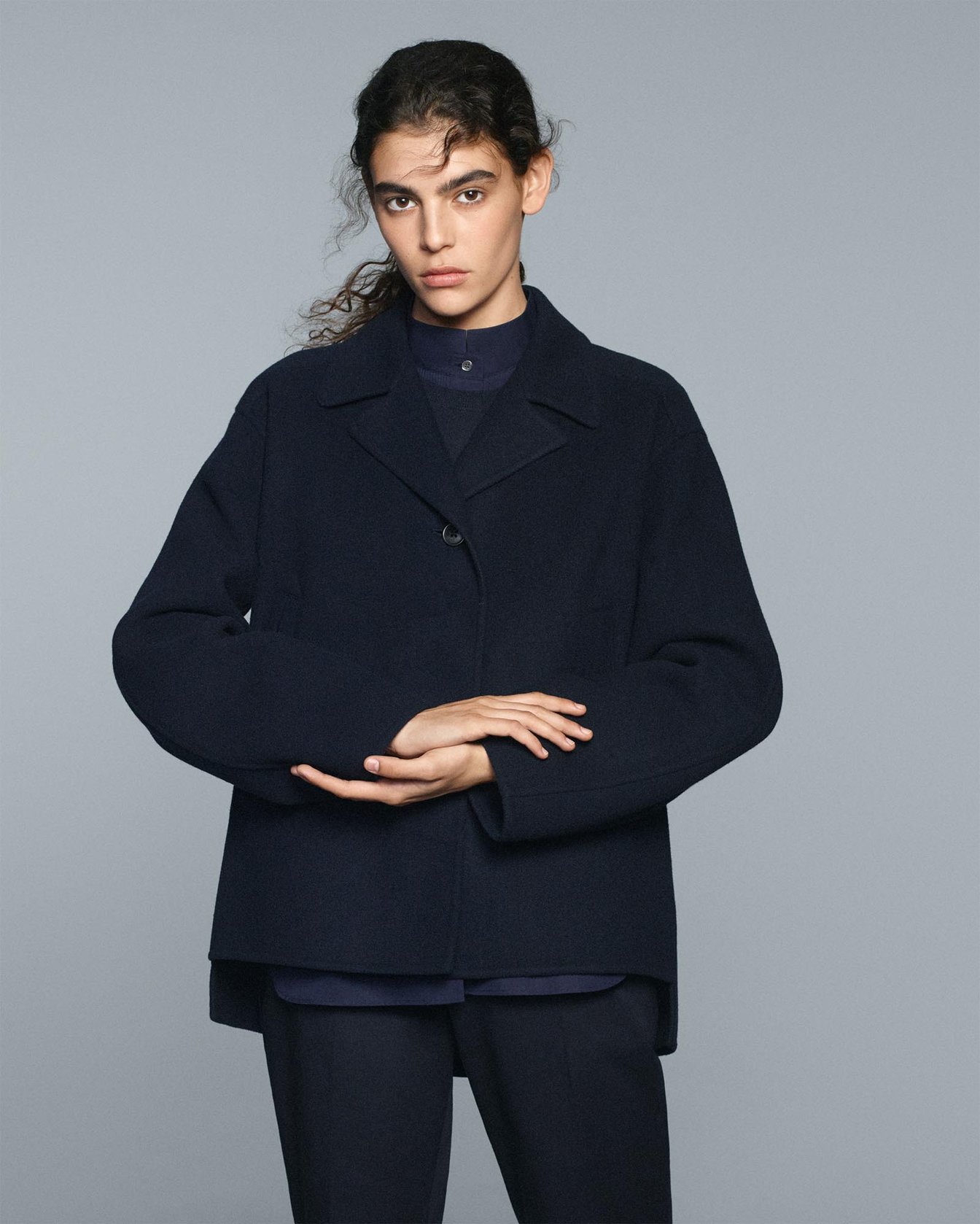 カシミヤブレンドのダブルフェイス素材で、前身頃に生地の分量があるため独特な生地の落ち感が特徴の「カシミヤブレンド ノーカラーコート」(2万4900円)を着用。