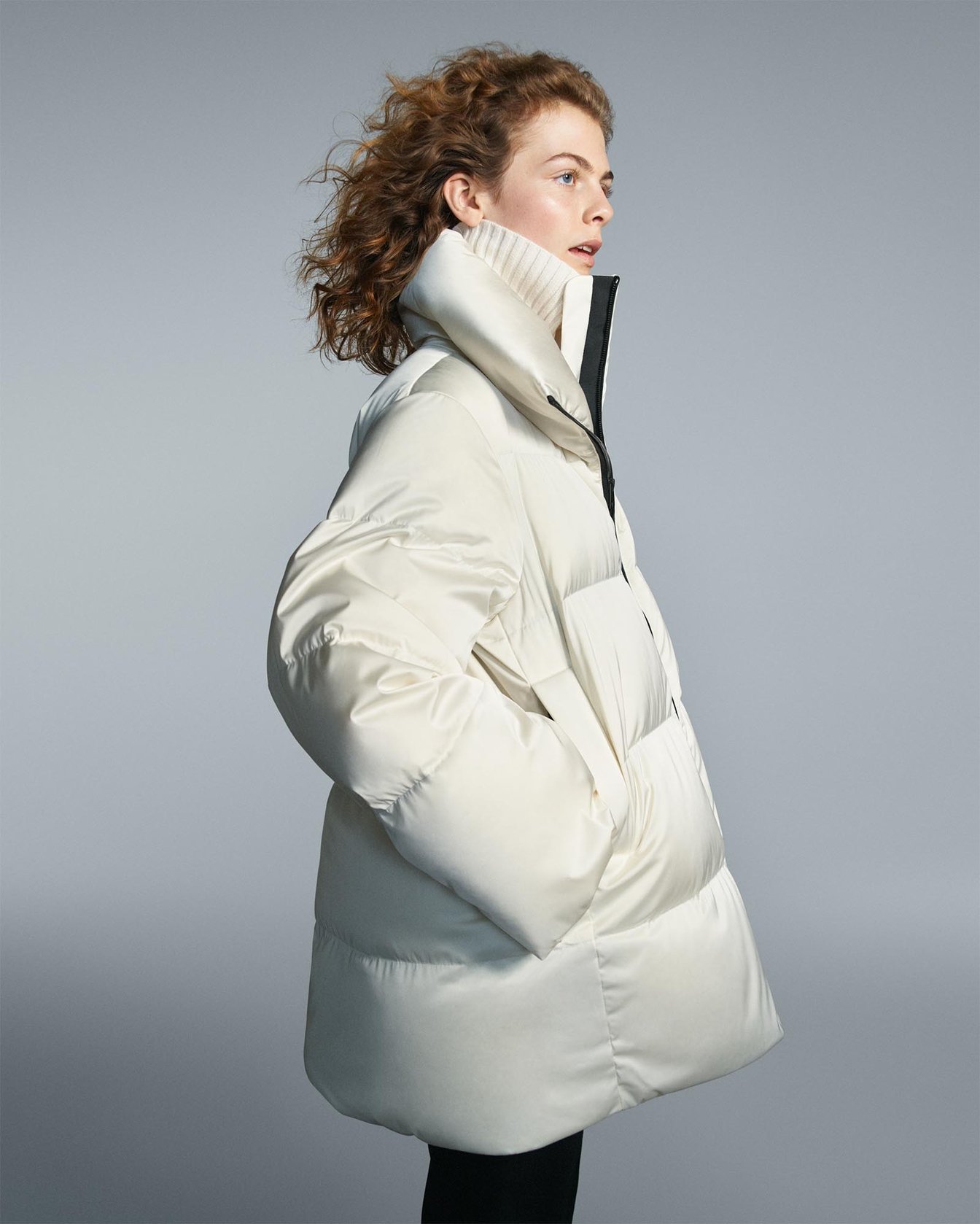 襟が高く、小顔効果が期待できる「ダウンボリュームジャケット」(1万4900円)は、肩まわりや袖をコンパクトに仕上げたオーバーサイズデザイン。裾を絞ればトレンドのコクーンシルエットにアレンジ可能です。インナーは肉厚な「ミドルゲージカシミヤブレンドタートルネックセーター(長袖)」(1万2900円)で、パンツはウエストがゴムでリラックスシルエットの「ウールブレンド タックテーパードパンツ」(9990円)を着用しています。