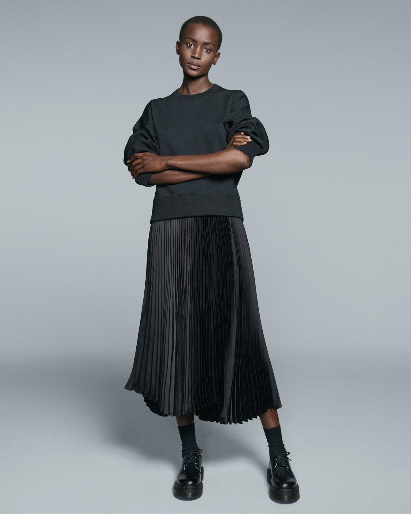 着丈が短く、袖にパッチのディテールを配した「ドライクロップドスウェットシャツ(長袖) 」(3990円)は、ソフトで上品な風合いが特徴。ボトムスは、上品な光沢とドレープ性のあるサテン素材で製作した「プリーツラップロングスカート」(7990円)を着用。前後に差を付けたランダムな丈や裾幅の広さは、動くたびに揺れるプリーツの動きに注目したデザインとなっています。