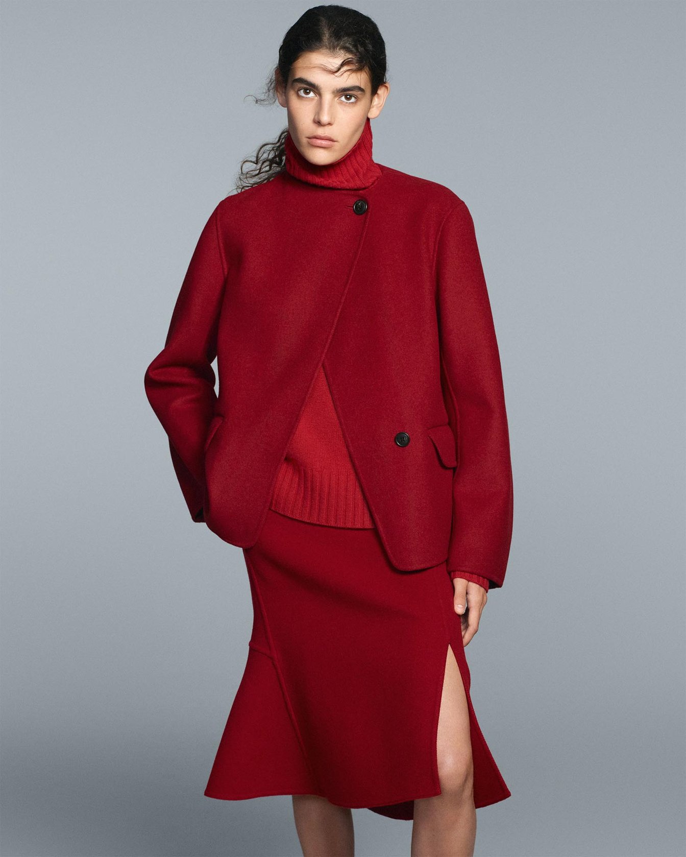 トップのボタンの開け閉めによって2パターンの着こなしができる「ダブルフェイスノーカラージャケット」(1万4900円)。丸首の上品なデザインに、同系色の「ミドルゲージカシミヤブレンドタートルネックセーター(長袖)」(1万2900円)を合わせています。ボトムスは「ダブルフェイススカート セットアップ可能」(7990円)を着用。