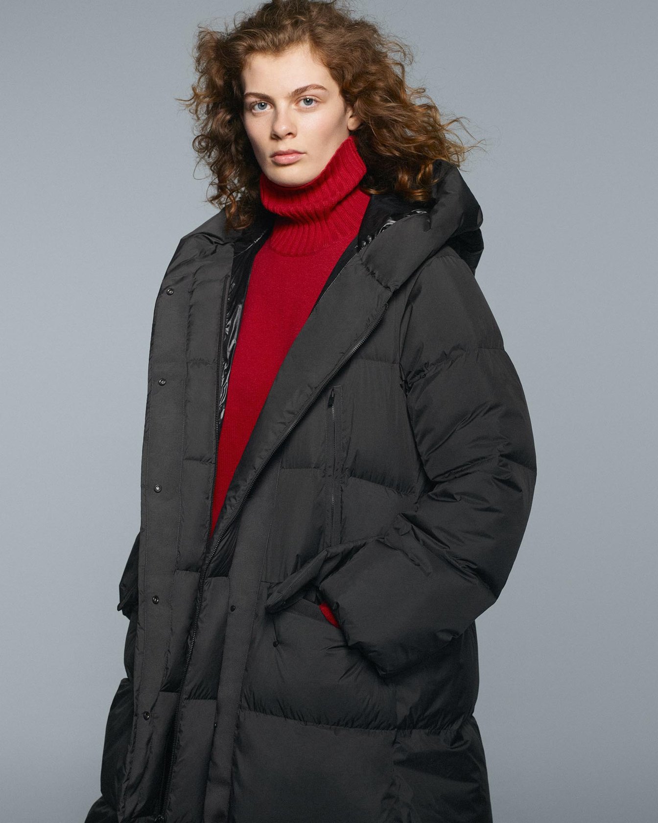 マットでハリ感のある表地と、光沢感のある裏地のコントラストが特徴の「ライトダウンロングコート」(1万7900円)は、フードを立てると首元を包み込むようなデザインに。インナーは「ミドルゲージカシミヤブレンドタートルネックセーター(長袖)」(1万2900円)のレッドです。