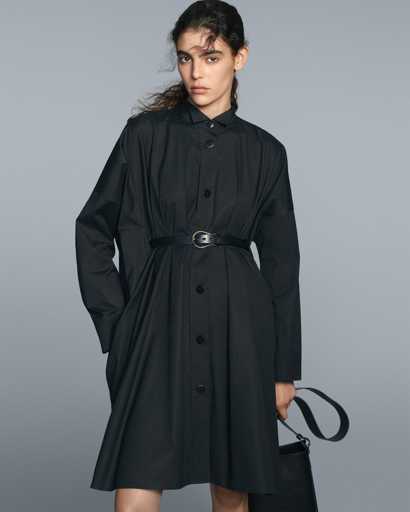 KURABO社のコットンポリウレタン素材を使用した「ドルマンスリーブシャツワンピース(長袖)」(7990円)。コート感覚で着られるビッグシルエットで、ウエストにベルトが付いていますが、ルックでは上から「レザーバックルベルト」を着用しています。左手に持っているのは「レザーショルダーバッグ」(1万2900円)です。