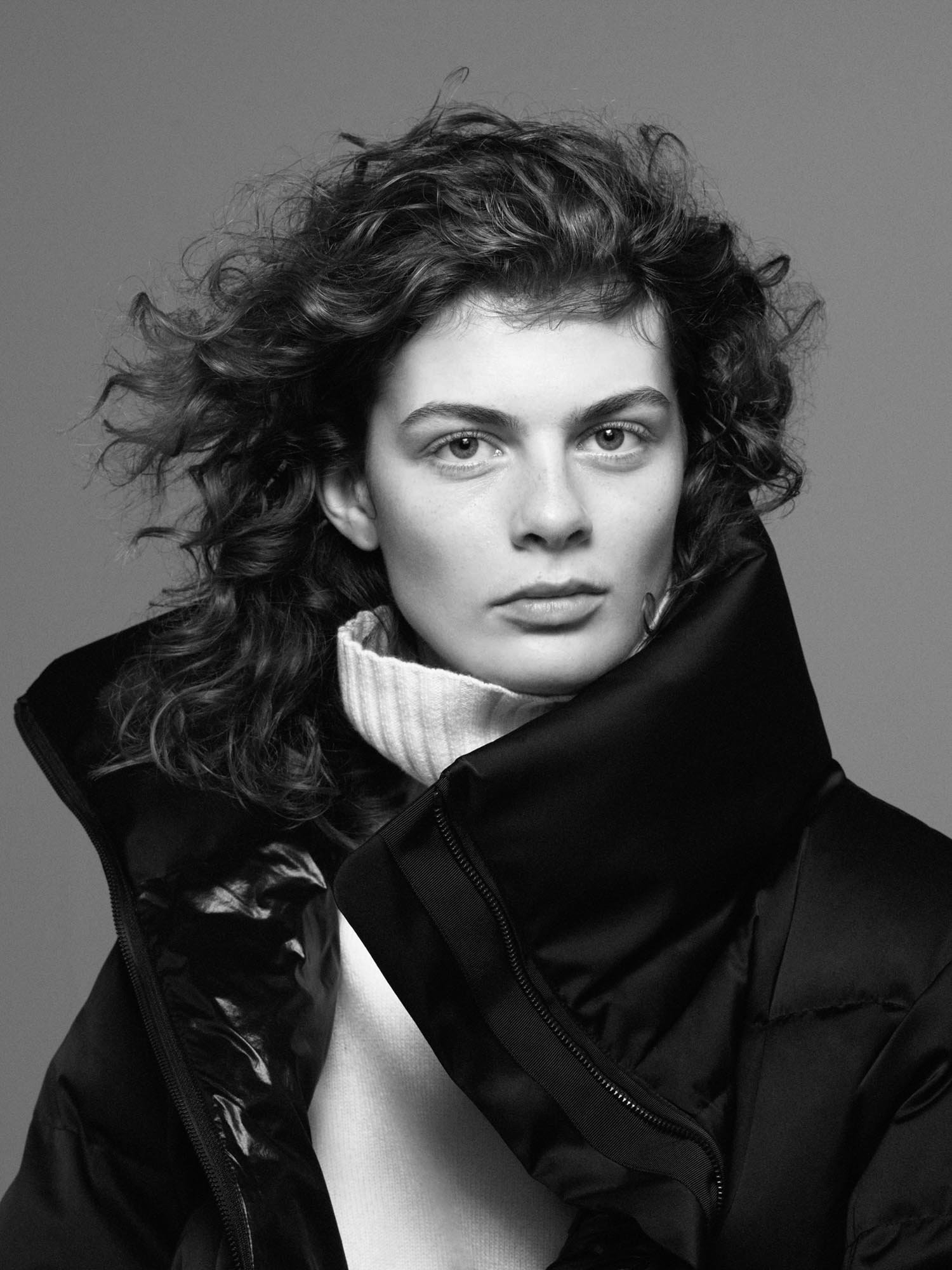 保温性に優れたAラインシルエットのミリタリーコート「ダウンショートコート」(1万9900円)は、上品な光沢と柔らかな風合いが特徴。パンツは「セルビッジ ストレートジーンズ」(5990円)を着用しています。