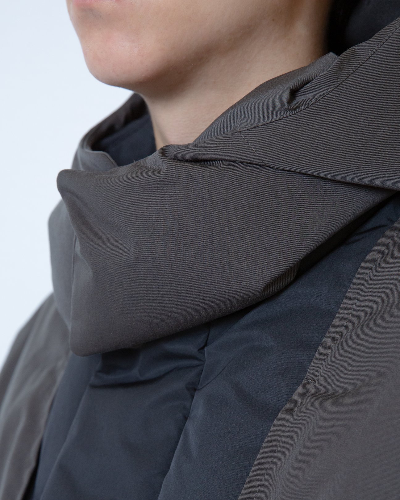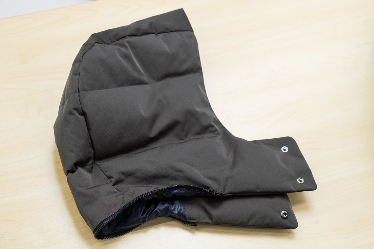 編集B:ネック部分がやや曲線的なフォルムになっているので、フードを外して着るとまた違った印象に。気分に合わせて着方が楽しめそう。