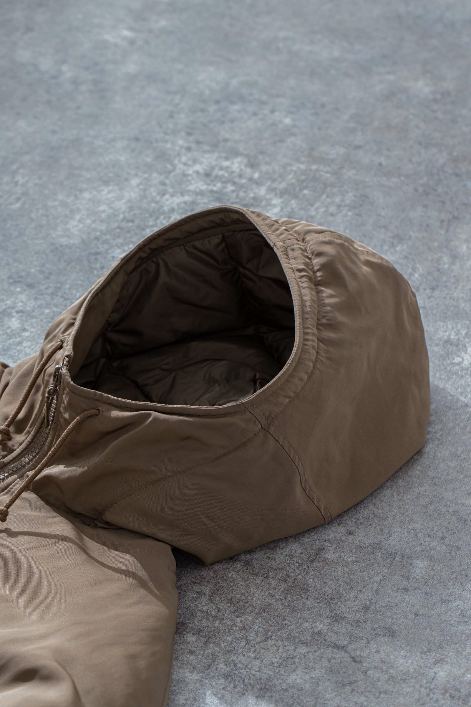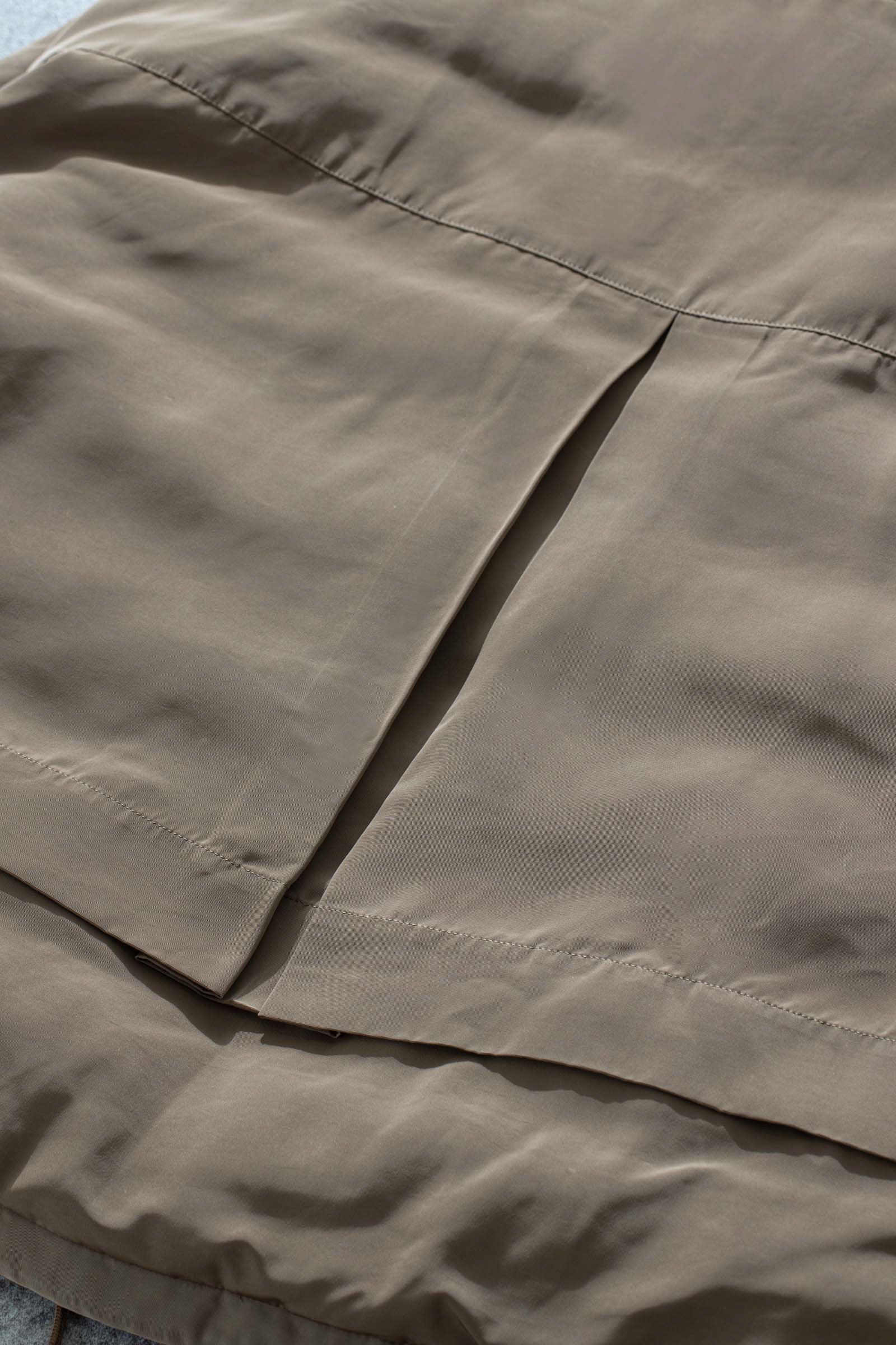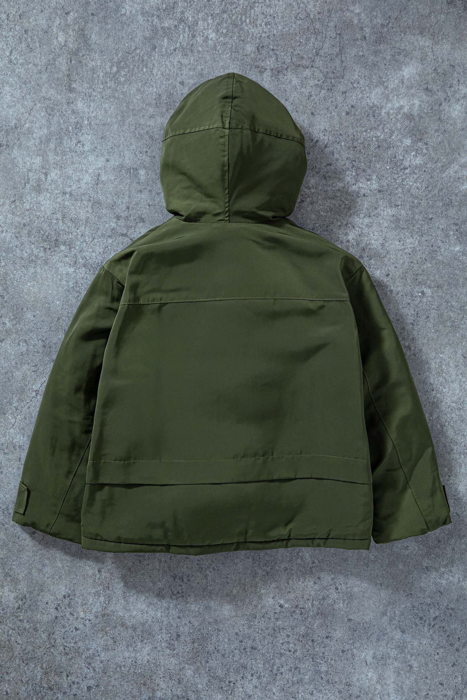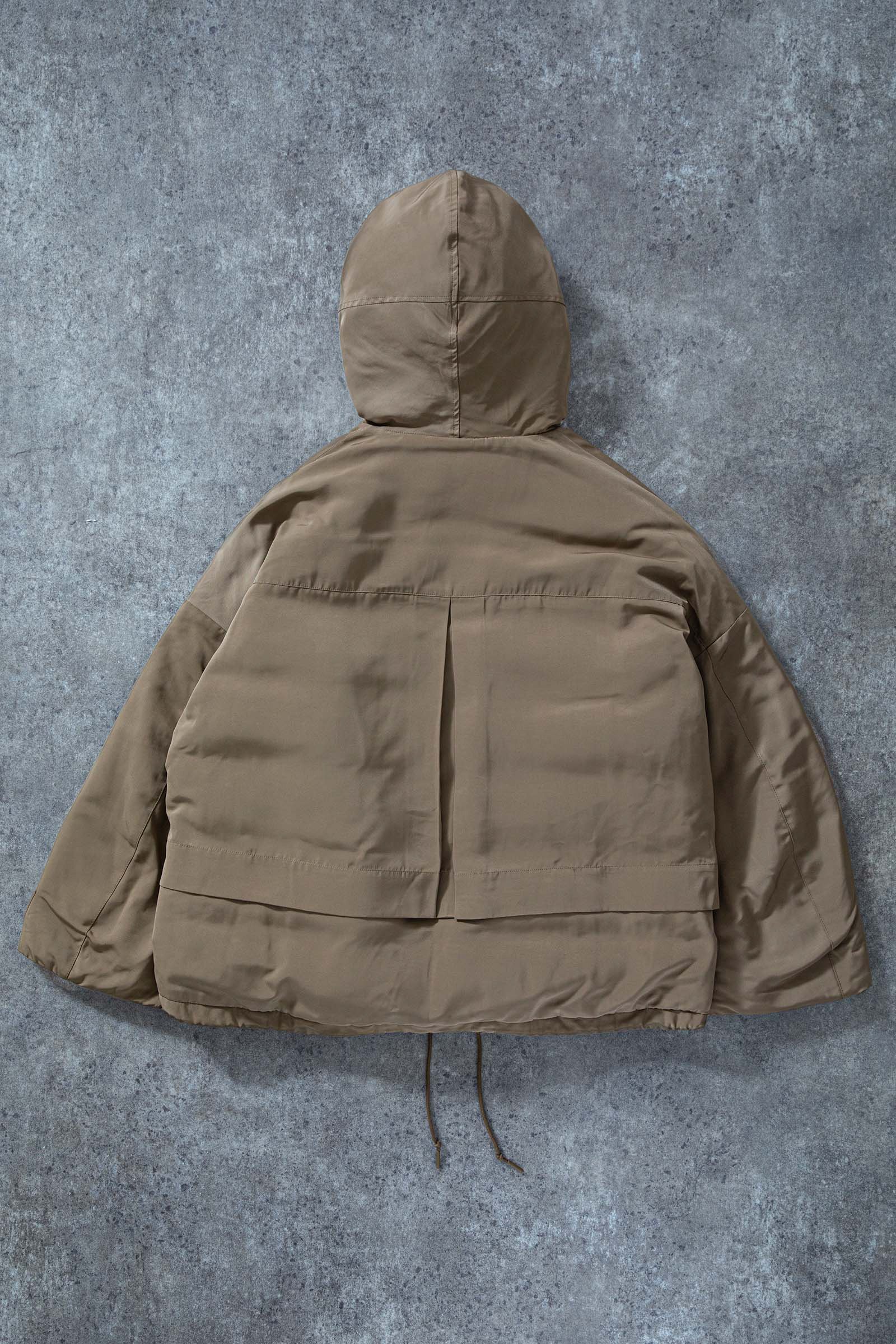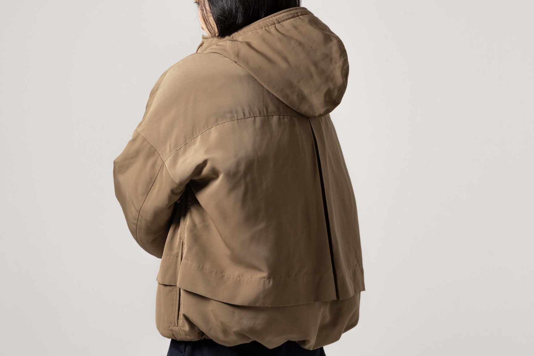 編集K:置いて広げるとボックスに近い形だけど、着てみるとかなり印象が変わりますね。ゆとりのあるサイズ感で少し裾が広がって、とくにボリュームが出るのが背中。裾のドローコードを絞ると、この背中の覆い布がいい感じにシルエットを保ちつつ丸みが出るので、2通りのシルエットが楽しめます。