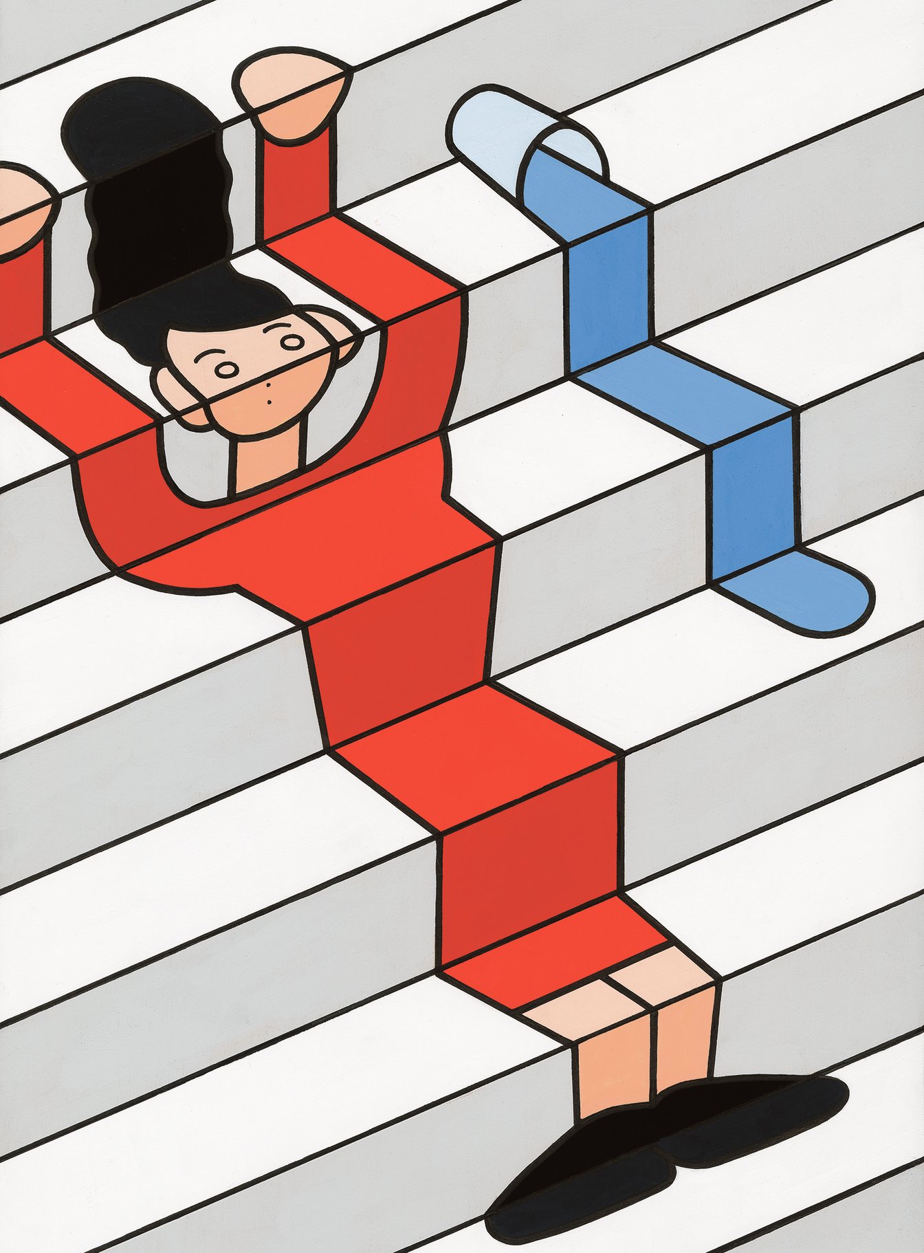 段差の上で人がウニョウニョになってしまっているこの作品も、階段で影がギザギザになっているのが面白く感じて描きました。階段は日陰と日向で色が異なっていて「見方によってはボーダーにみえるな」と思ったんです。そんなふうに単純な視覚情報からもヒントを得て描いていますね。