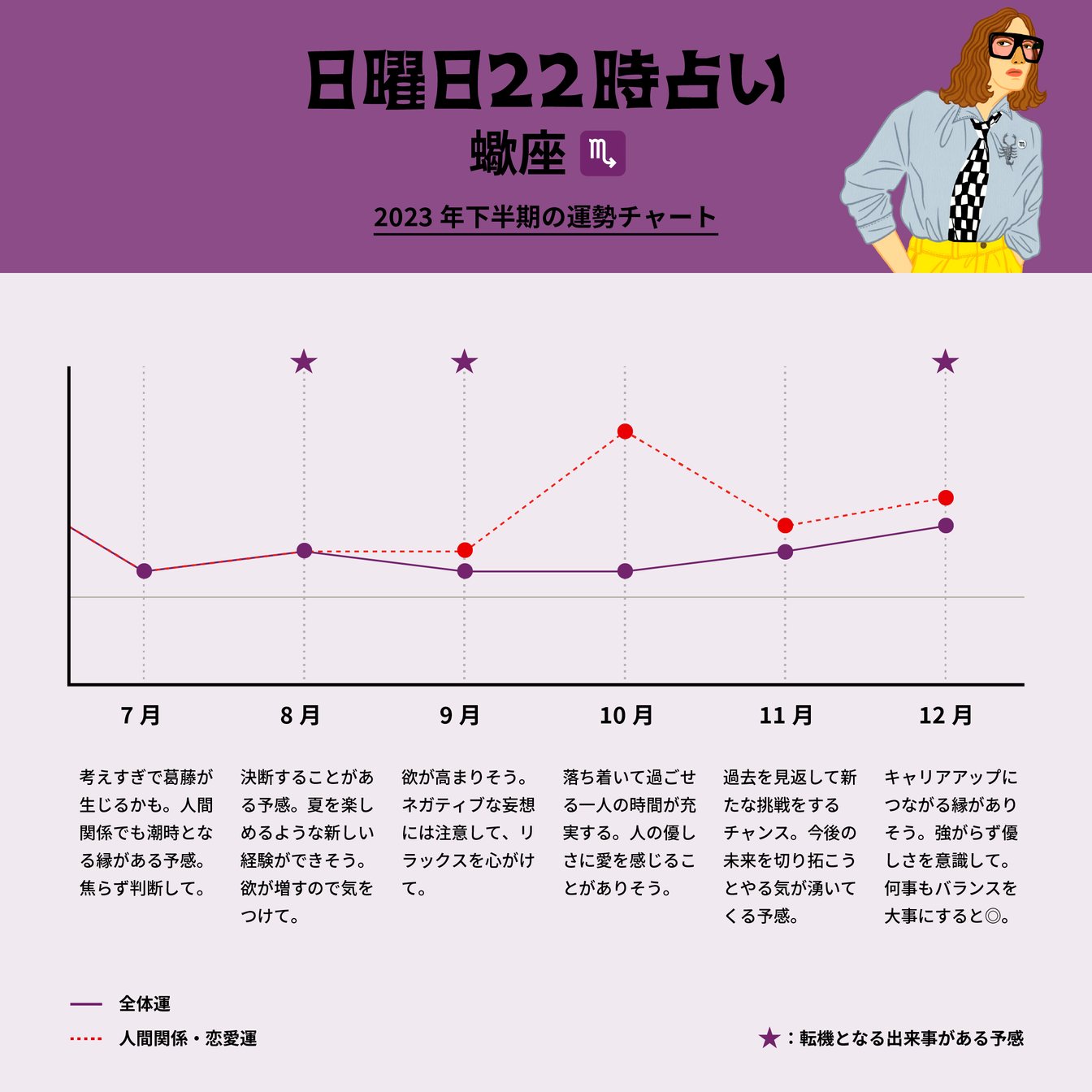 7月は新たな挑戦に向けた好奇心が湧きますが、蠍座のあなたの真面目さからくる慎重さが行動に制約をかけてしまうかもしれません。しかし、8月には欲望や冒険心が爆発的に現れ、運命を引っ張ることになるでしょう。ただし、暴走には注意を。9月から10月にかけては着実な勝利への階段を登ることになりそう!特に10月には予期せぬ人間関係の引き合わせが起こるかもしれないので、楽しみにしていてくださいね。11月はリベンジのチャンス。自身の運命を選択することになるでしょう。そして、12月にはバランスをとりながら人と支え合い、成功のキャリアを築いていくことができるでしょう。