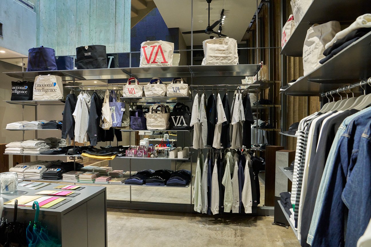 1階の物販?ホ?ッフ?アッフ?スヘ?ースて?は、「チャンピオン(Champion)」「エンダースキーマ(Hender Scheme)」「リーバイス(Levi’s?)」「エル?エル?ビーン(L.L.Bean)」「ニューエラ(New Era?)」などとのコラボレーションアイテム、高橋盾、西山徹か?V.A.のために製作したアイテムを販売。「アニエスベー(agnès b.)」「オーデパールパリ(Au De?part Paris)」「パックマン(PAC-MAN)」と藤原ヒロシが主宰する「フラグメント(fragment Design)」が共同製作した限定アイテムを多数ラインナップする。