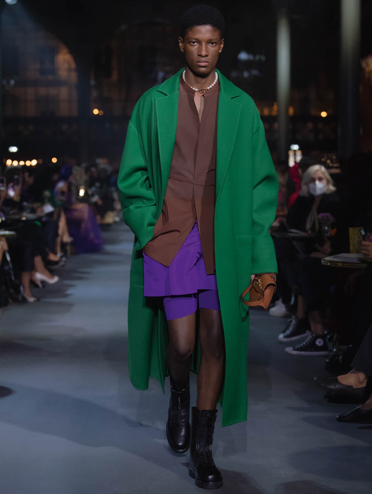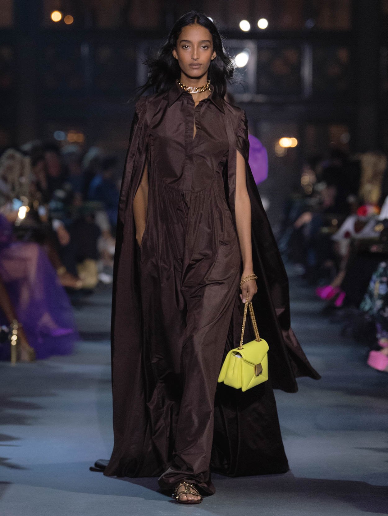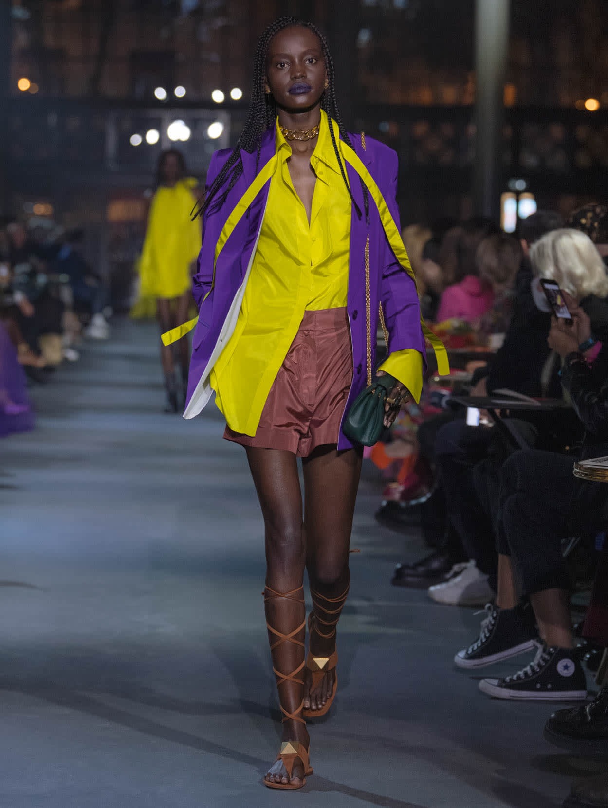 ランウェイに登場した約100弱のルックは、ほぼ黒と白で構成された前シーズンのコレクションと異なり、鮮やかなアクリルカラーがメイン。コントラストが効いたパープル、イエロー、チョコレート、グリーンなど組み合わせをスワップしながら、キーとなるカラーをより印象的に見せている。
