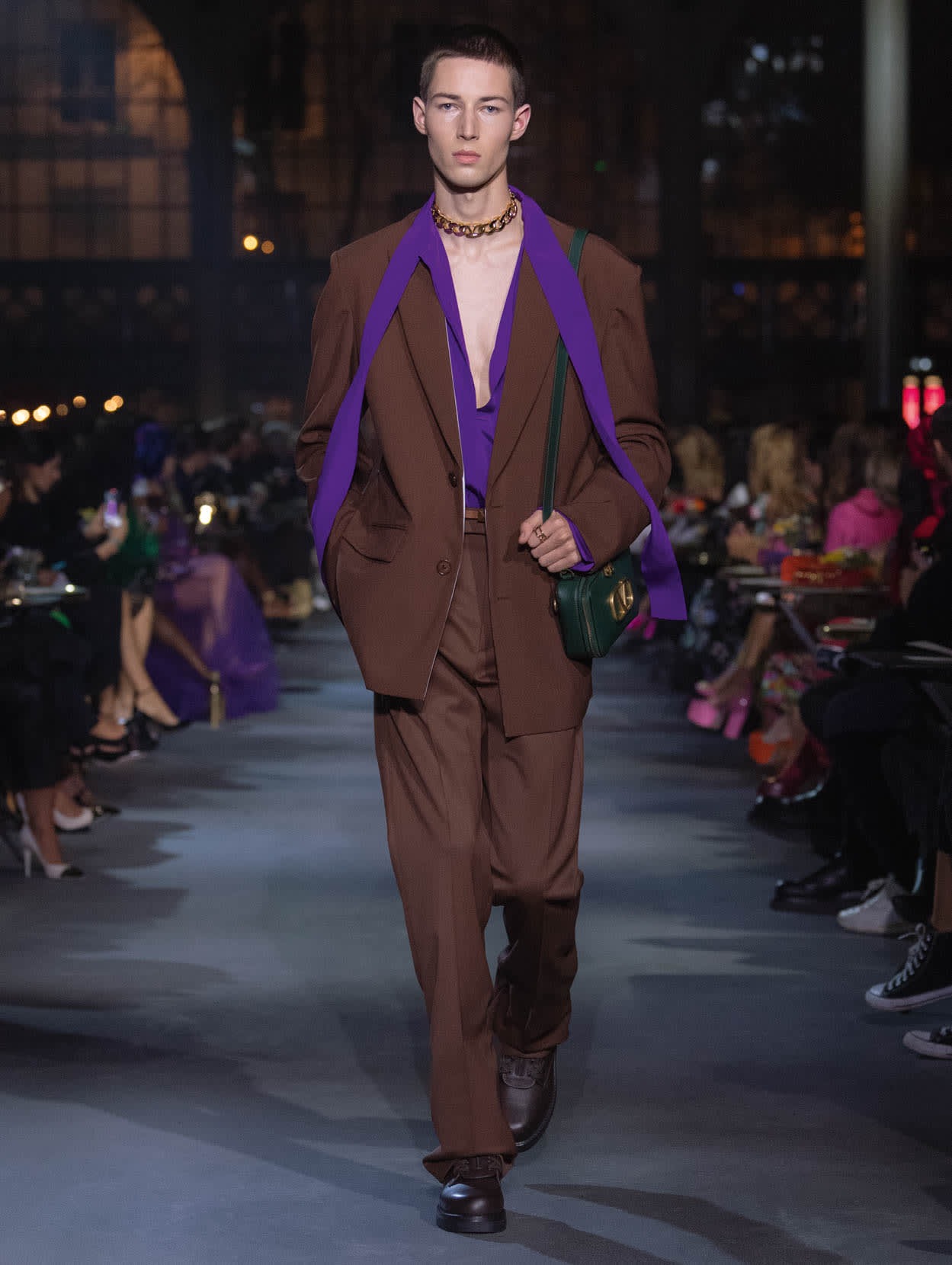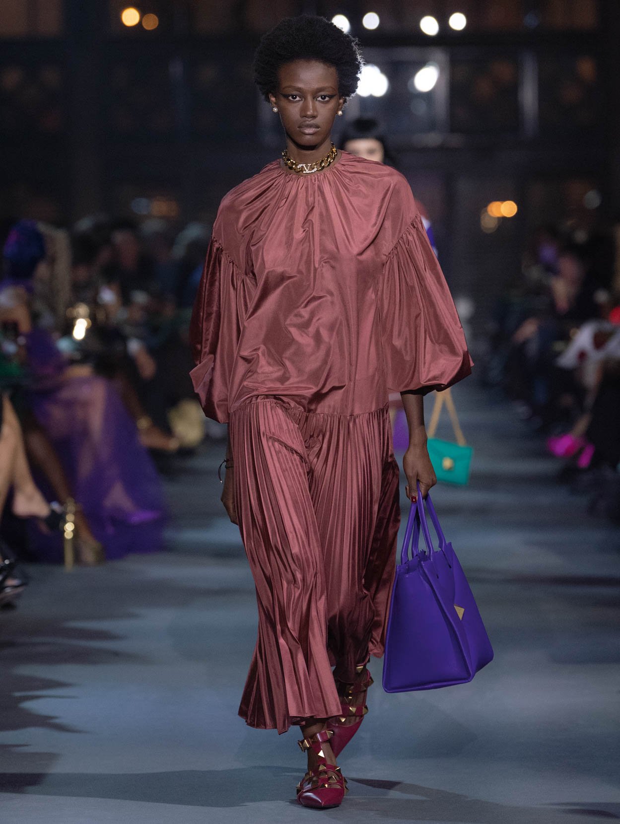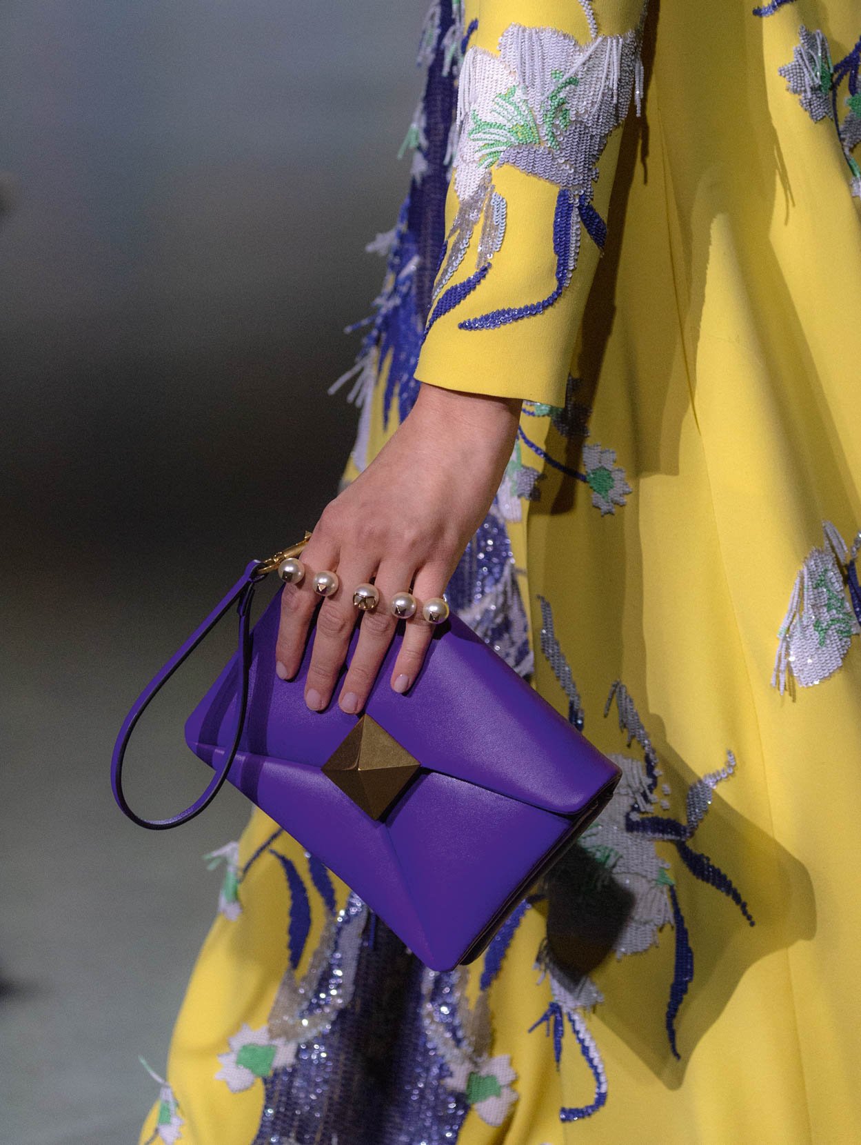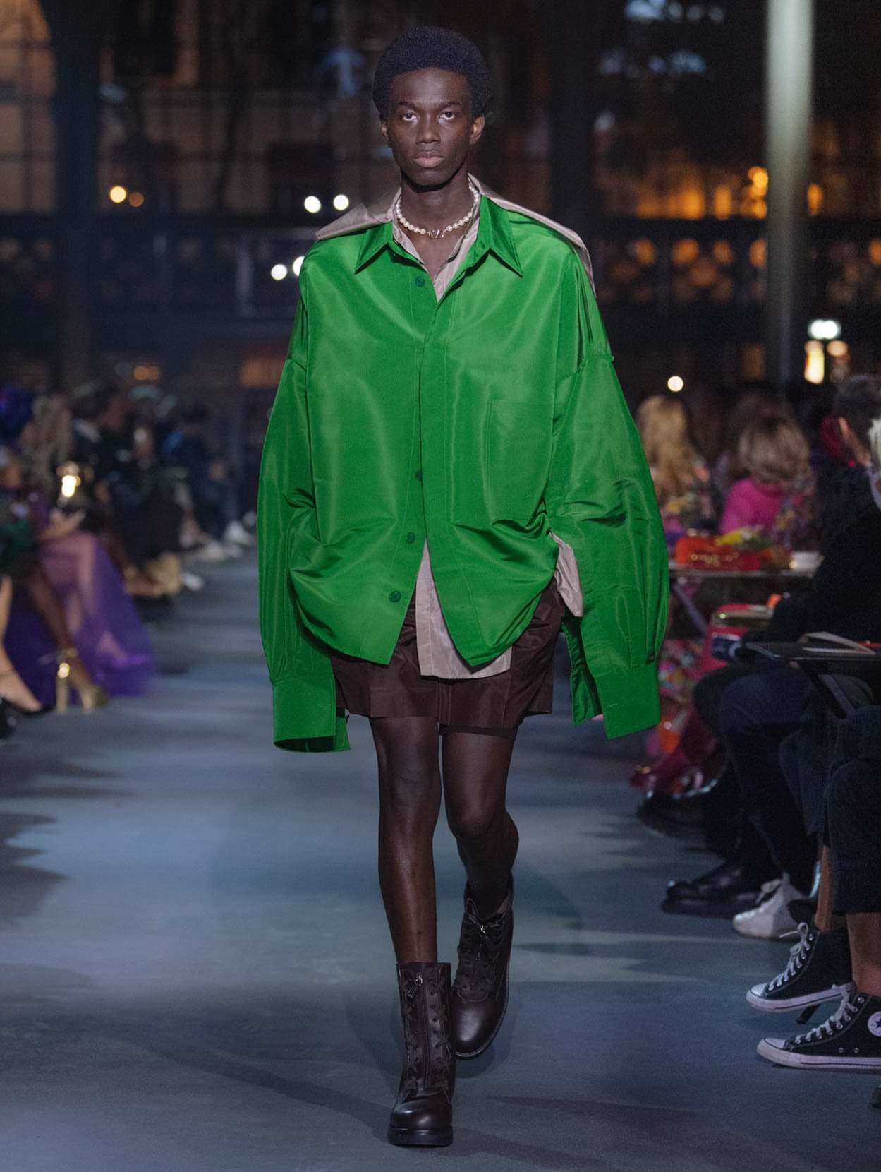 ランウェイに登場した約100弱のルックは、ほぼ黒と白で構成された前シーズンのコレクションと異なり、鮮やかなアクリルカラーがメイン。コントラストが効いたパープル、イエロー、チョコレート、グリーンなど組み合わせをスワップしながら、キーとなるカラーをより印象的に見せている。