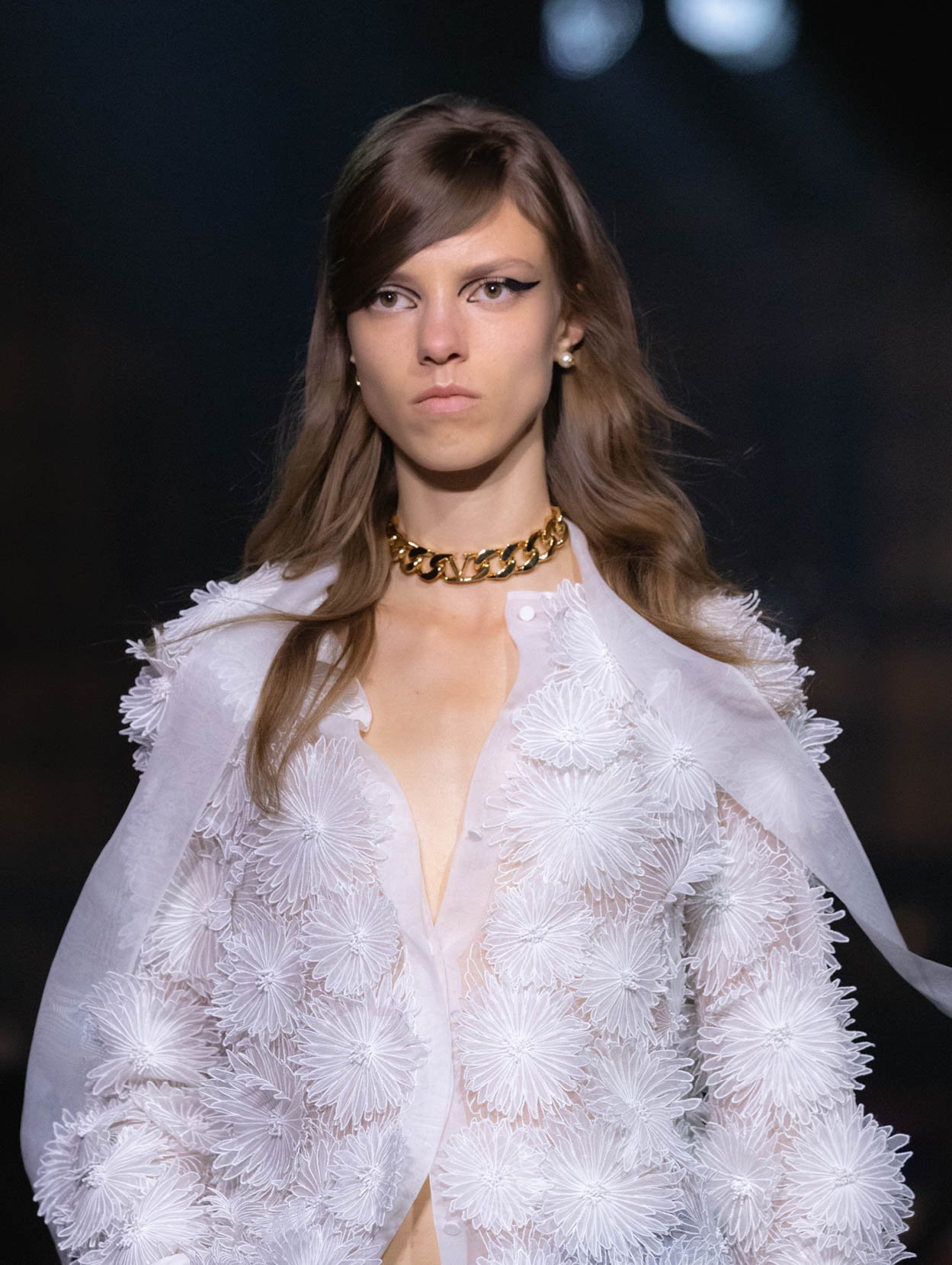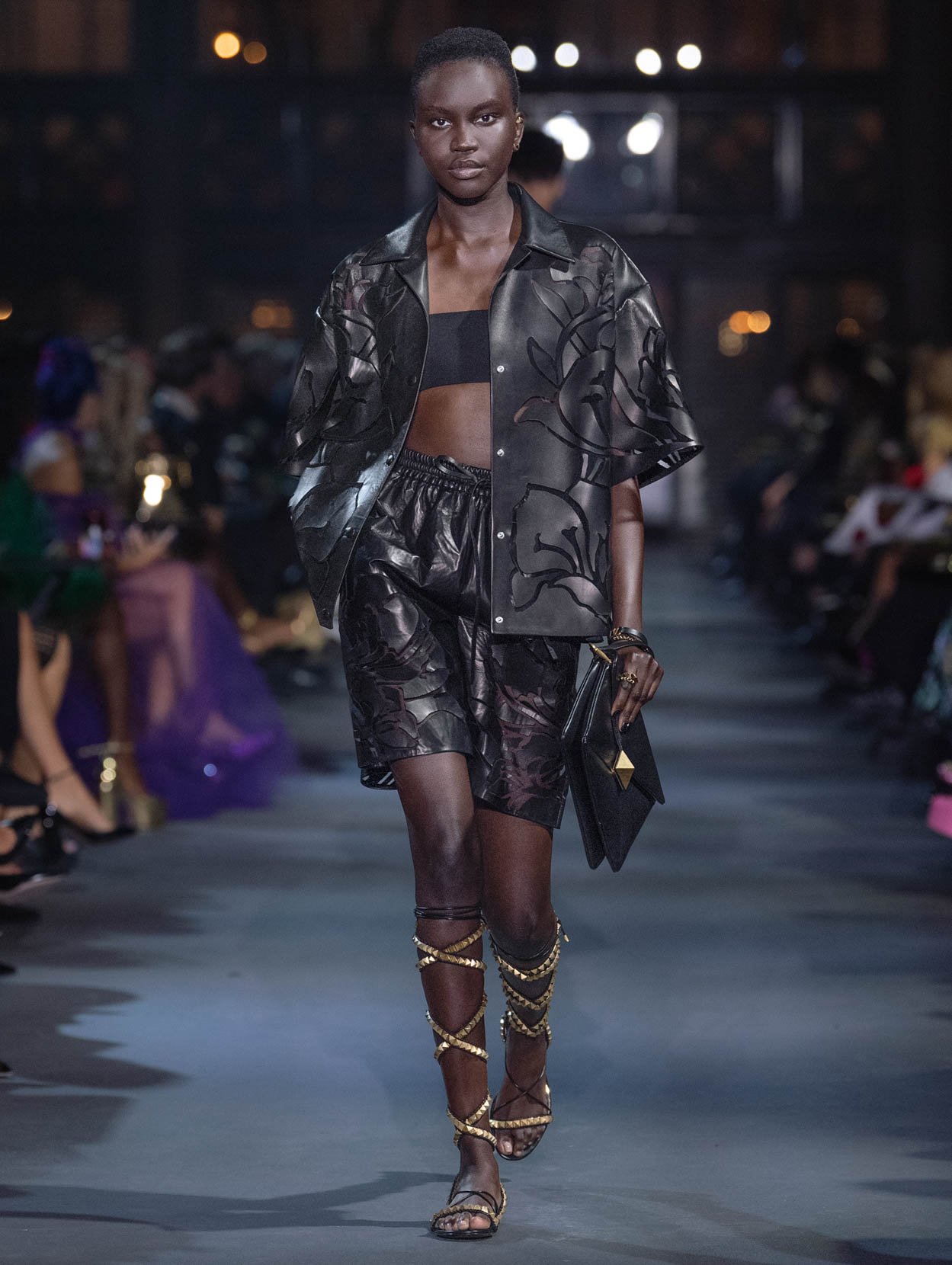 シャツやジャケット、バミューダパンツやバルーンドレスに独特な質感と光沢を与えるのは、ウォッシュやダメージ加工によってとろみを出したタフタ素材。また、フラワーのカットアウトデザインが、シャツやドレス、ジャケットのディテール、スパングルやレザーといった素材にも巧みに施され、素肌が微かに透けるセンシュアルさをまとう。