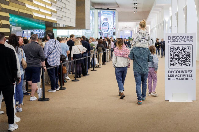 会期前半は、時計小売業者のバイヤーやジャーナリストの来場者がほとんど。それが、会期終盤4月5日土曜日から7日月曜日までの3日間はパブリックデーに設定してあり、一般の来場者も訪れます。入場チケットは70スイスフラン(約1万2000円)と、じつに東京ディズニーランドのワンデーパス以上という高額です。いっぽうで、12歳~25歳を対象としたヤングチケットを40フラン(約7000円)とし、さらにはSNSを活用した積極的な発信をするなど、展示会事務局の「次世代の顧客となる若年層の時計離れを食い止めたい」という強い思いが伝わってきます。そうした努力が功を奏して、今年度の一般公開チケットの販売数は2万3000枚と、2024年と比較して21%増と大きく伸ばしました。