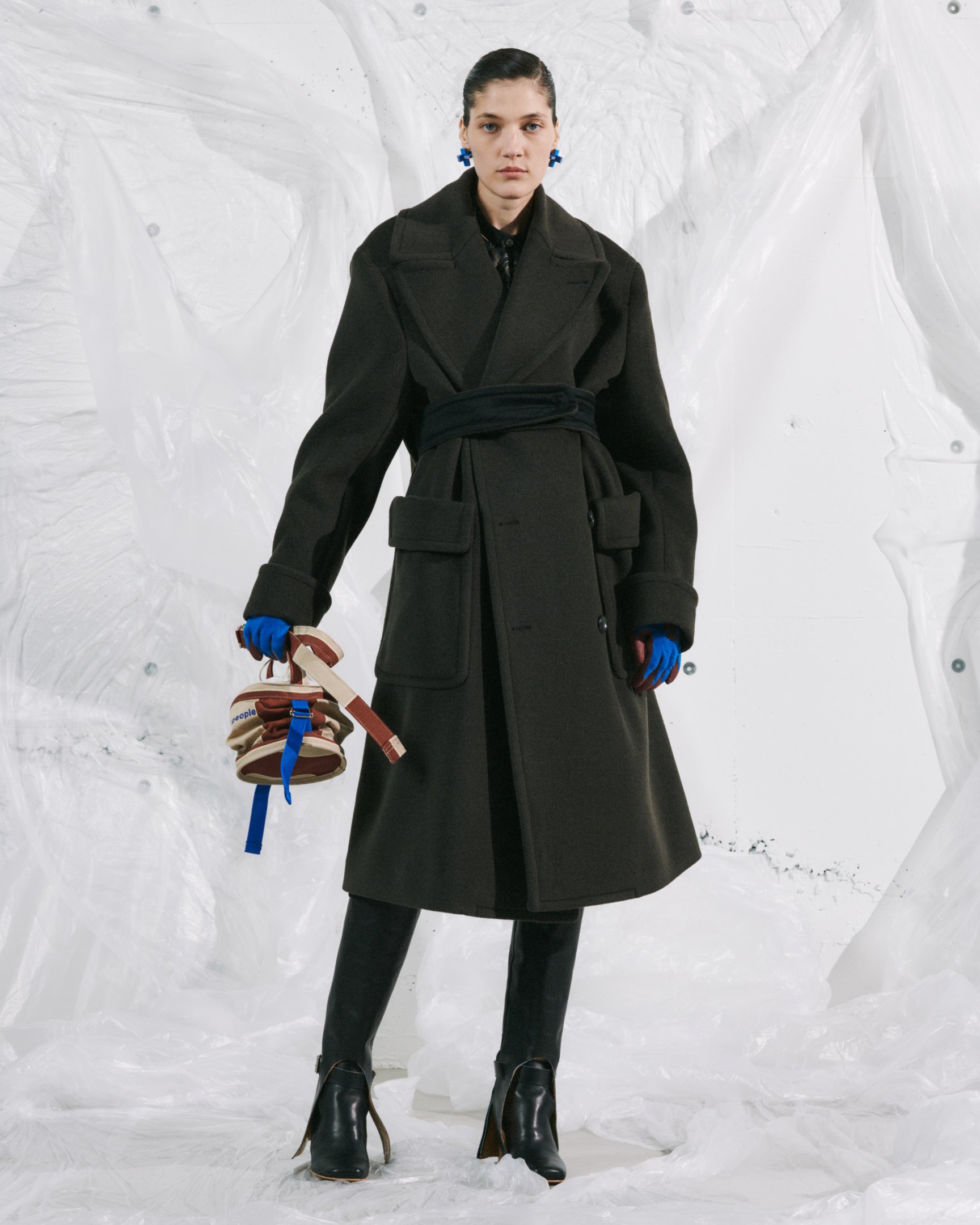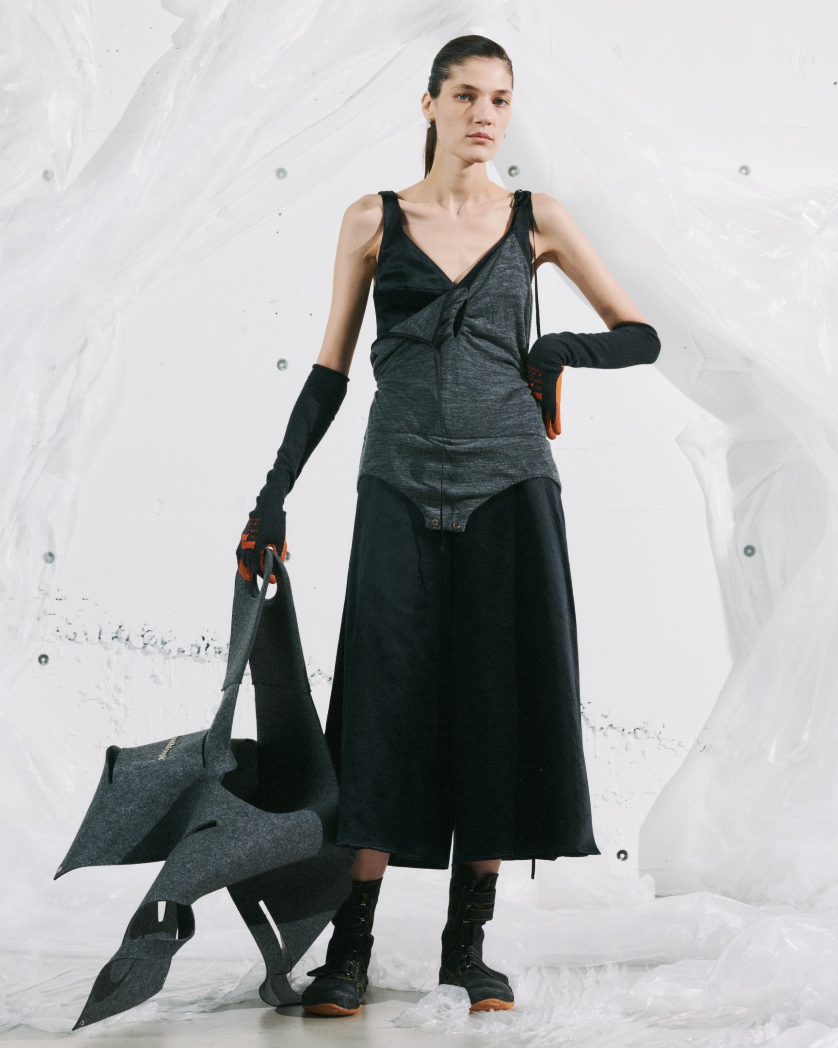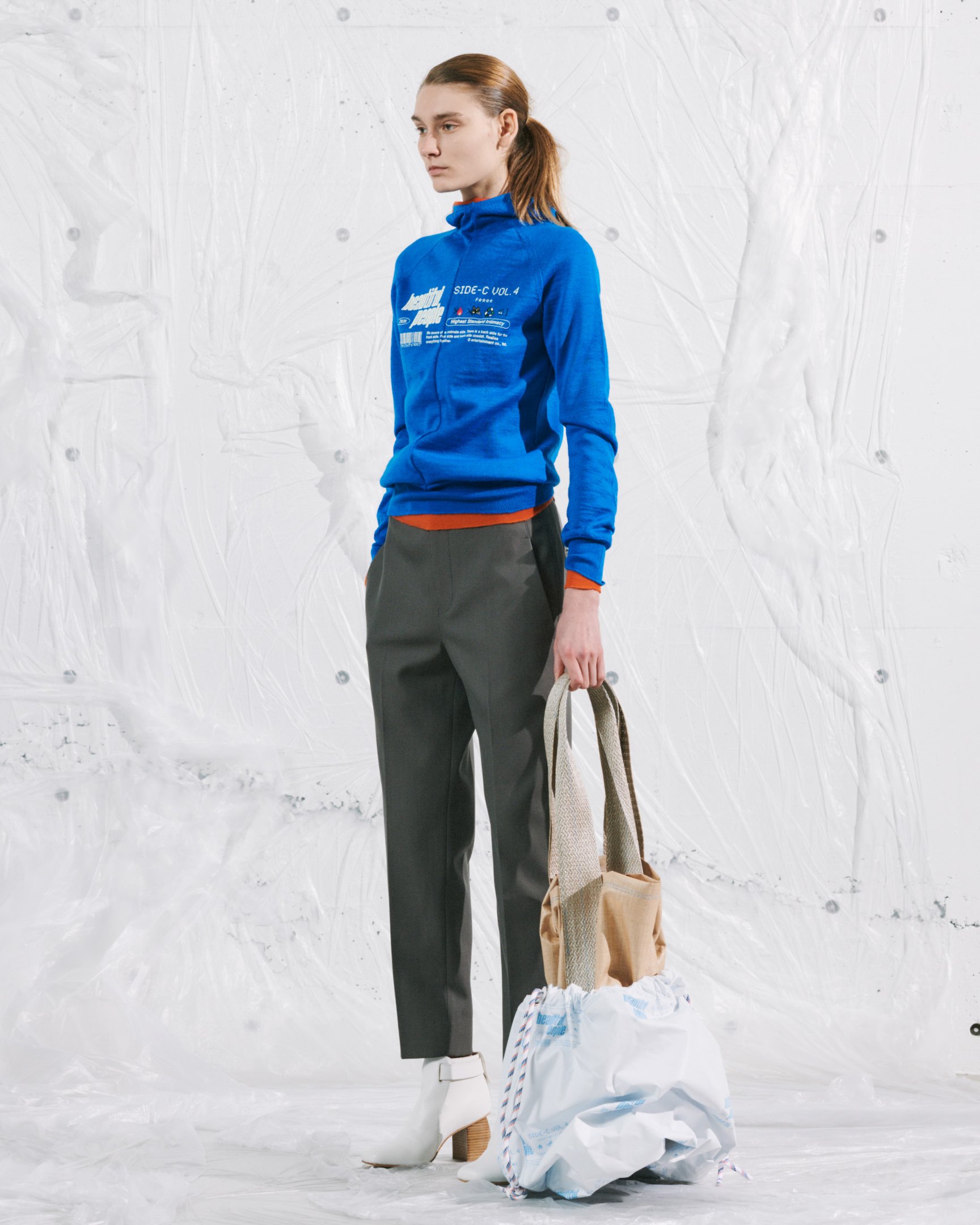 1stデリバリーでは建築資材をモチーフにしたニットや、JIS安全色を取り入れたトップス、スポンジたわしを再現したバイカラーニットなどのほか、3wayで着用できるトレンチコートを発売。背抜き軍手に着想を得たキャッチーなロンググローブや、伸縮自在のバレルバッグ、大量の廃棄物や土砂などの運搬?保管などに使われるフレコンバッグからインスパイアされた4wayバッグなど、ファッション小物も充実しています。