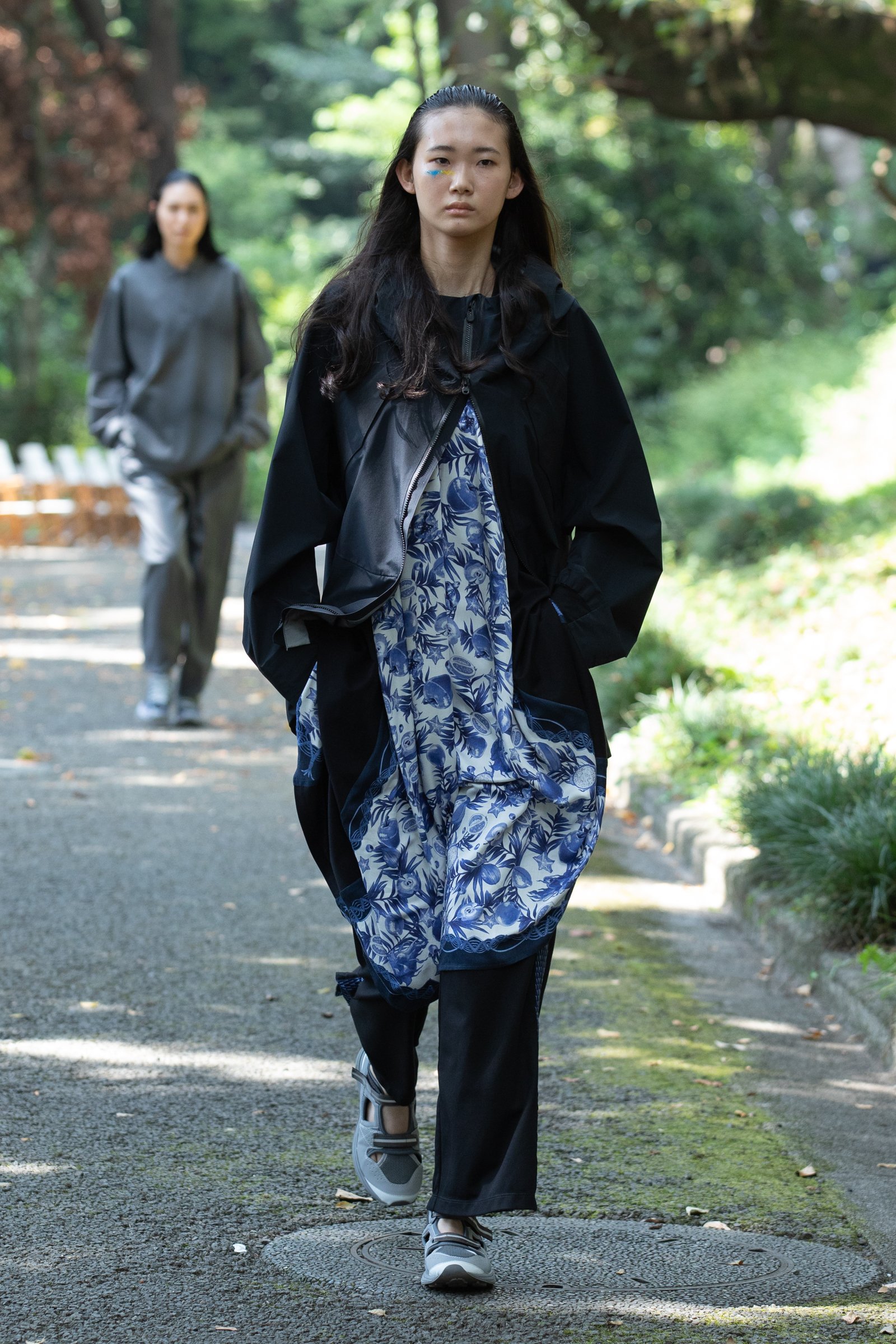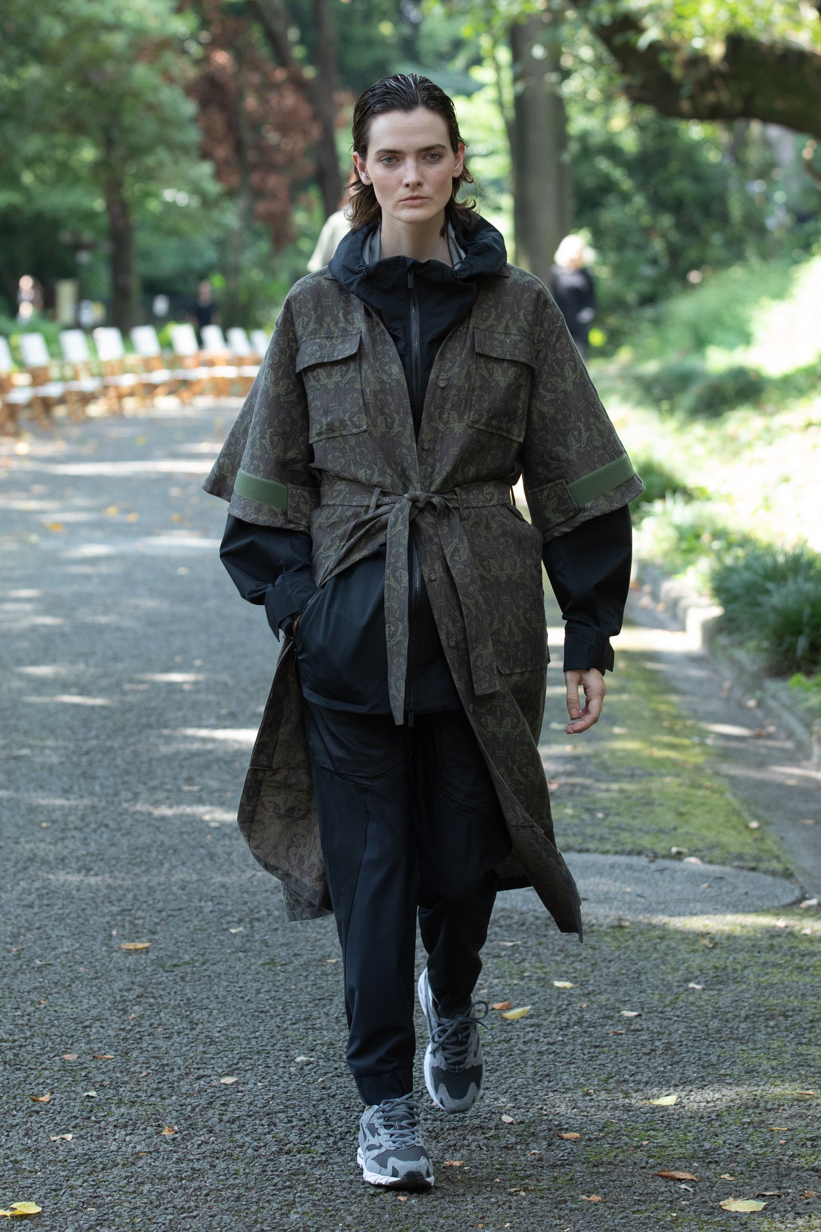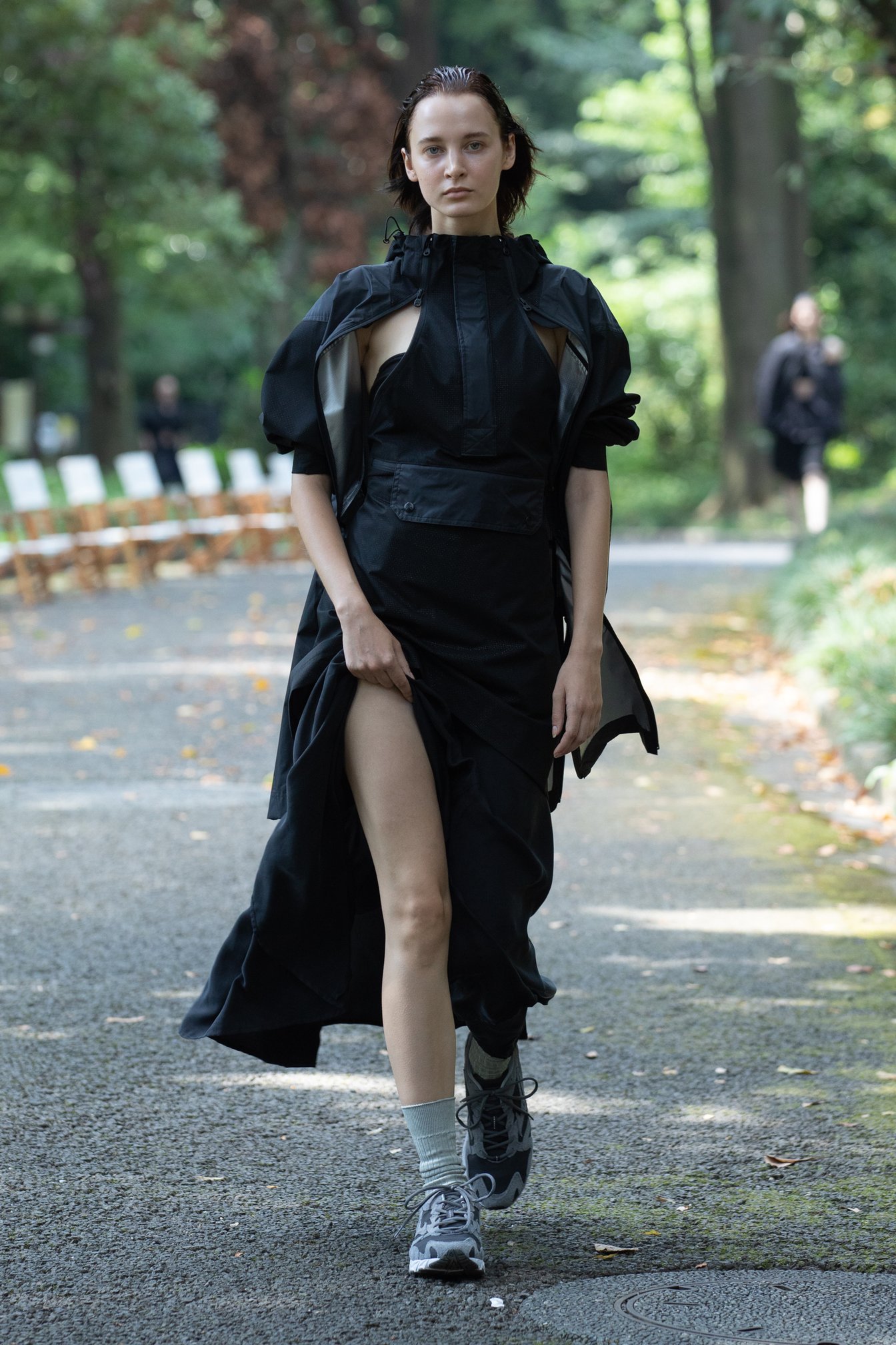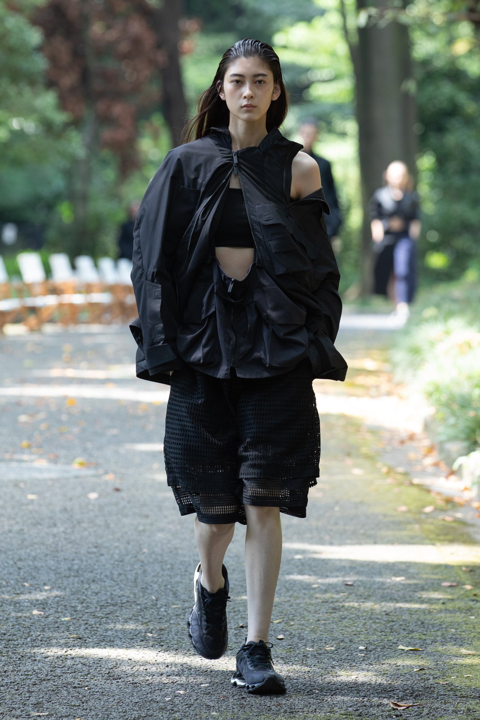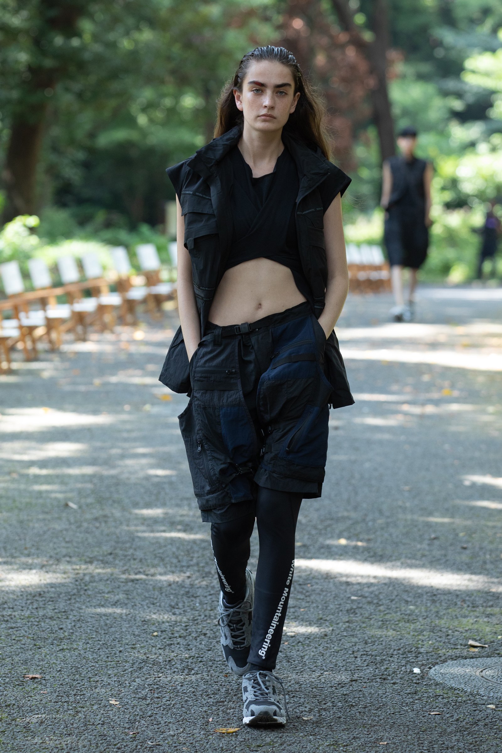 生茂る木々が真夏の日差しを遮る一本道をランウェイにして歩いてきたのは、黒一色の服をまとった女性たち。ファーストルックは、半袖のプルオーバージャケットにスリットが深く入ったスカート、そしてスニーカーを合わせている。女性モデルの起用は、メンズウェアがメインのホワイトマウンテニアリングにとって珍しく、序盤から新しい風を感じさせた。