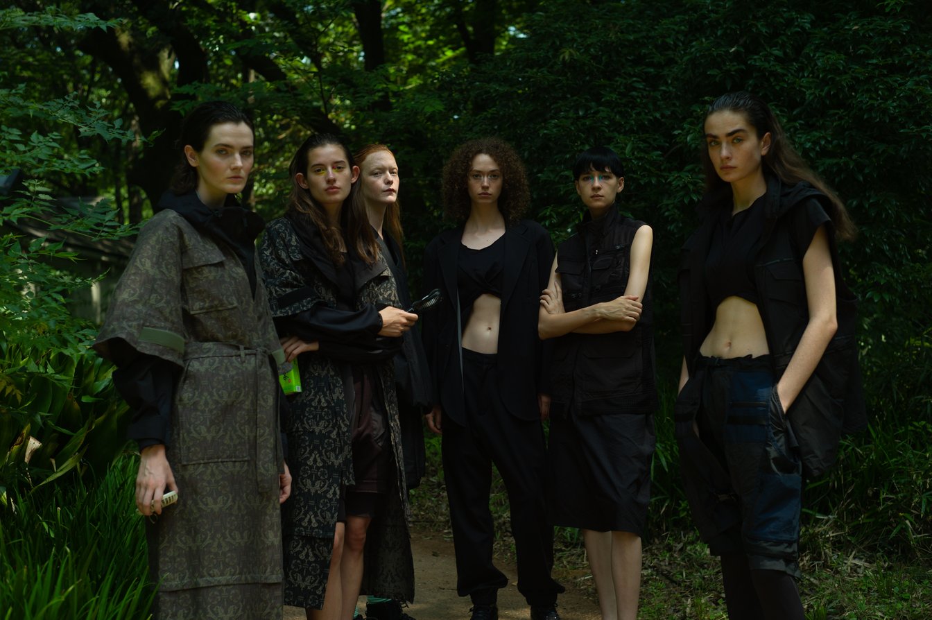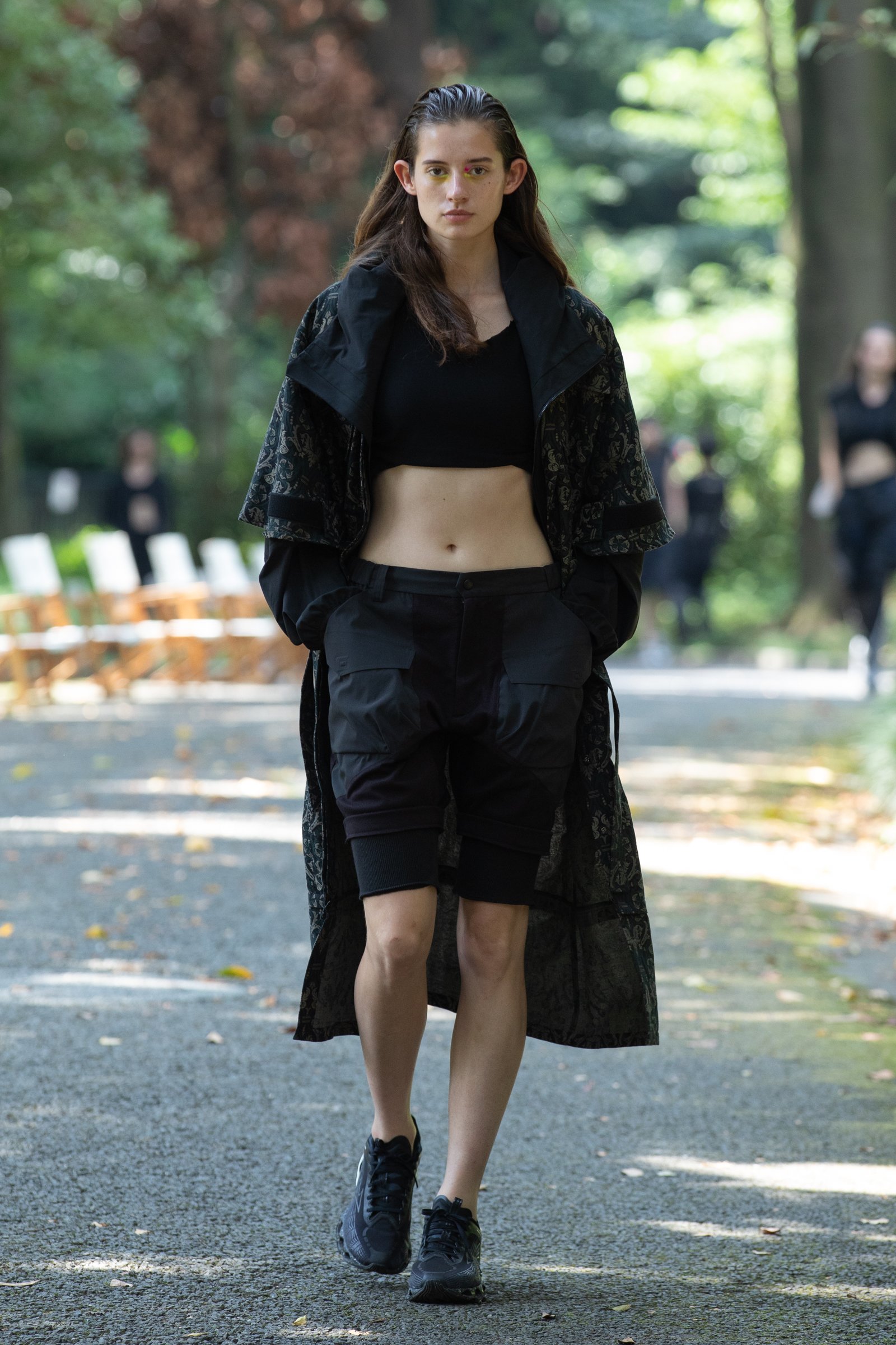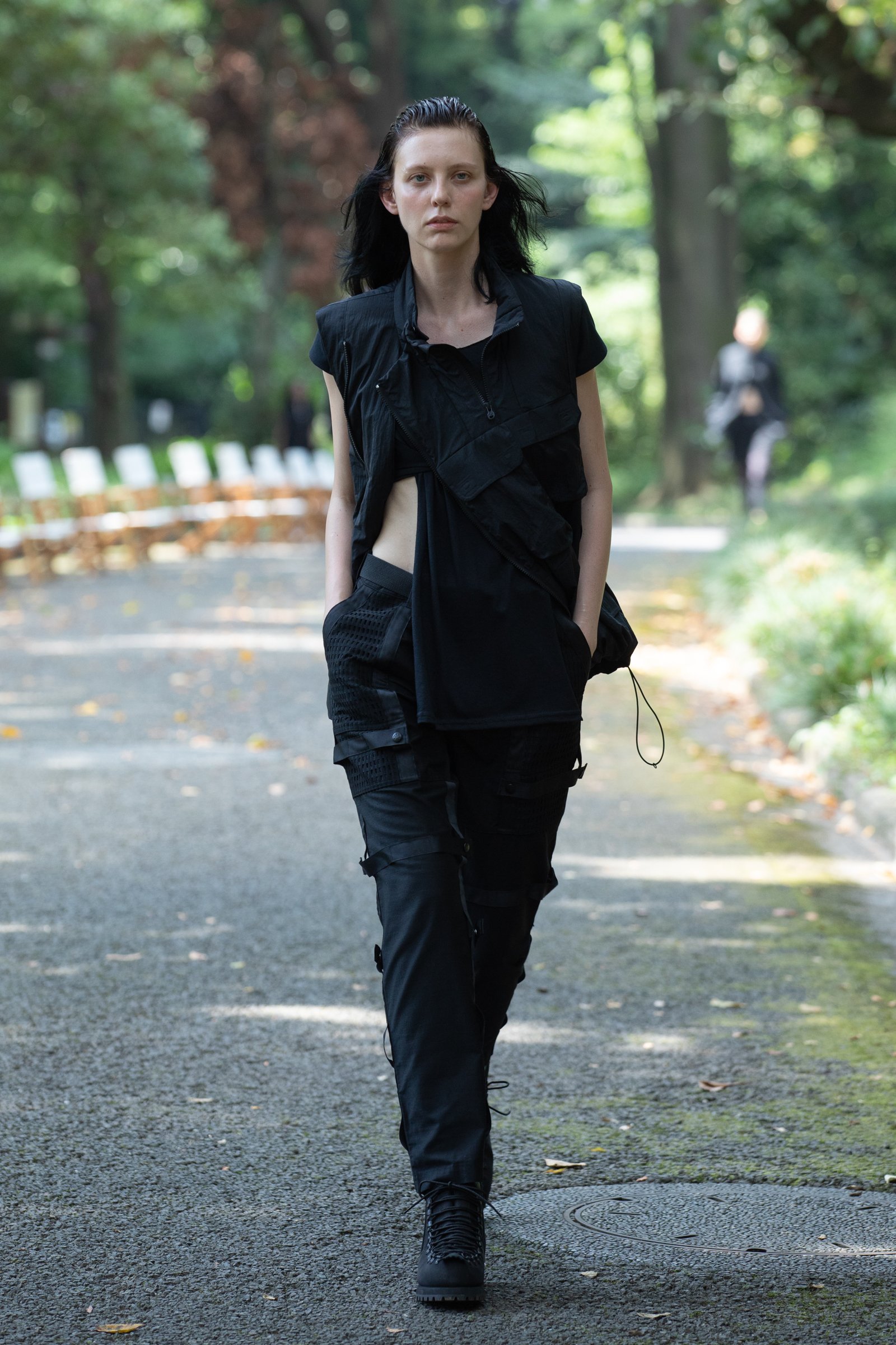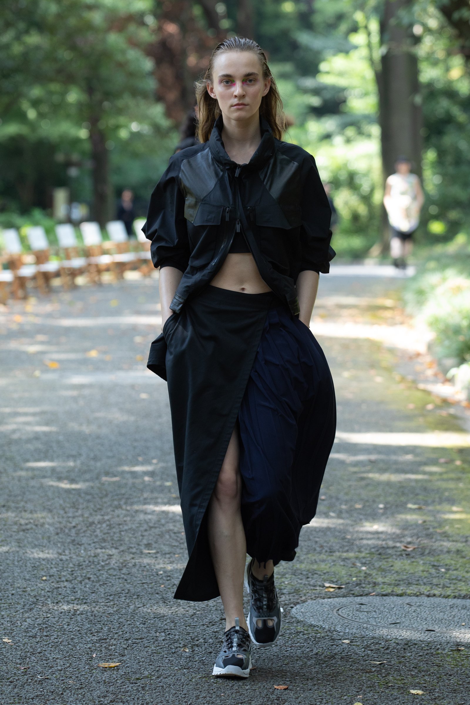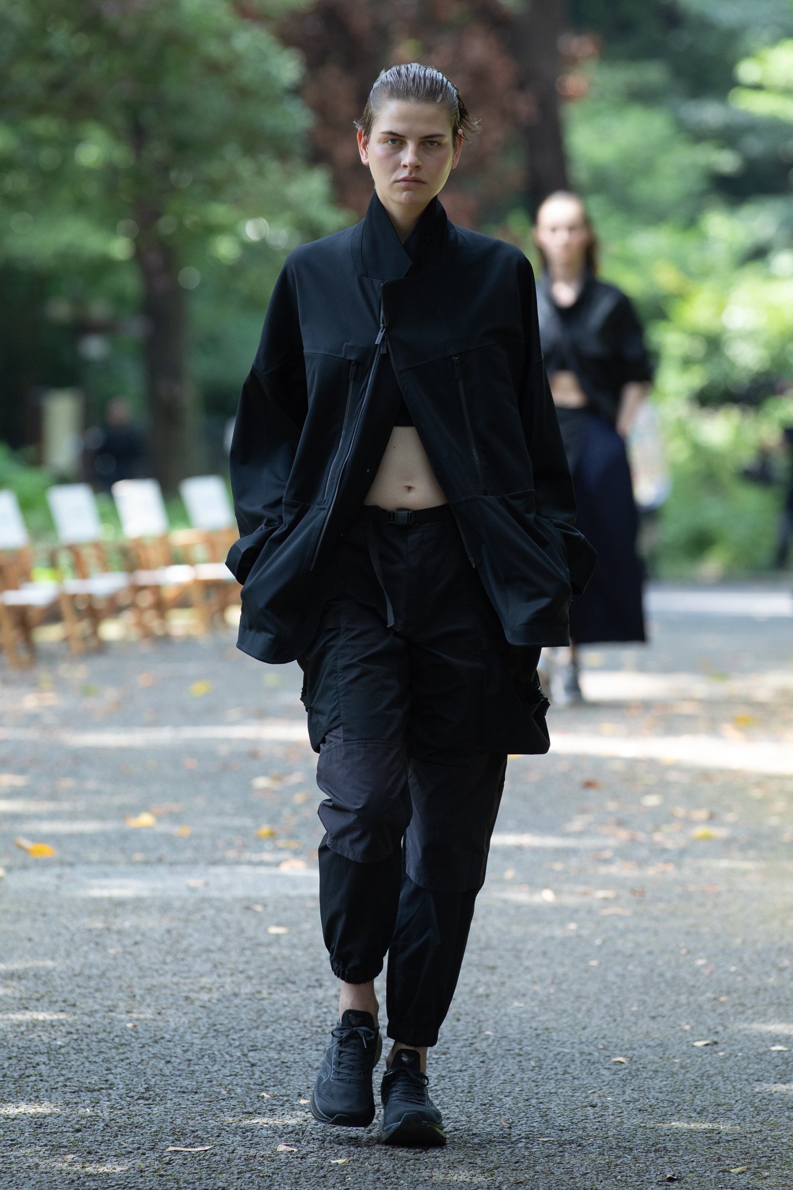 生茂る木々が真夏の日差しを遮る一本道をランウェイにして歩いてきたのは、黒一色の服をまとった女性たち。ファーストルックは、半袖のプルオーバージャケットにスリットが深く入ったスカート、そしてスニーカーを合わせている。女性モデルの起用は、メンズウェアがメインのホワイトマウンテニアリングにとって珍しく、序盤から新しい風を感じさせた。