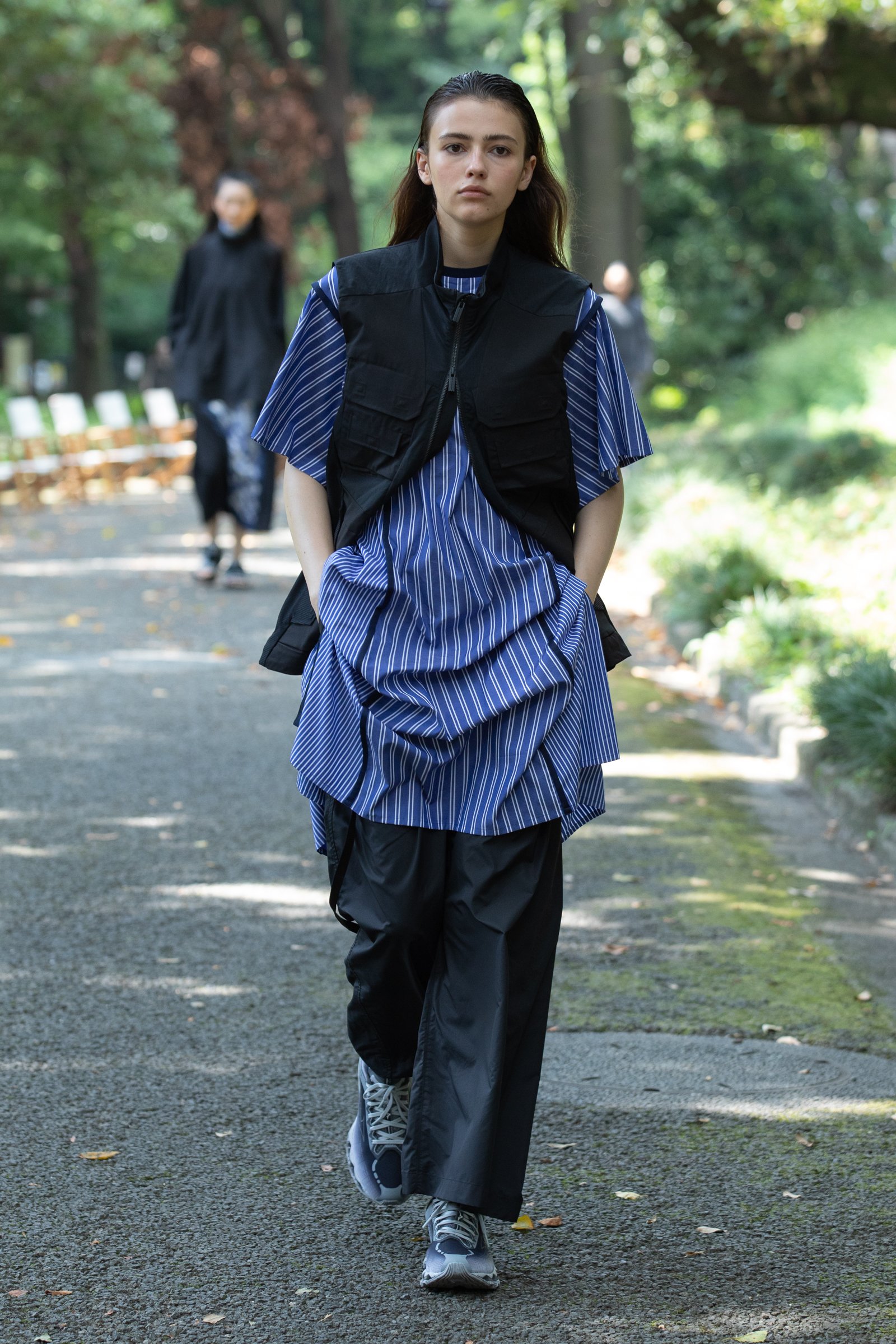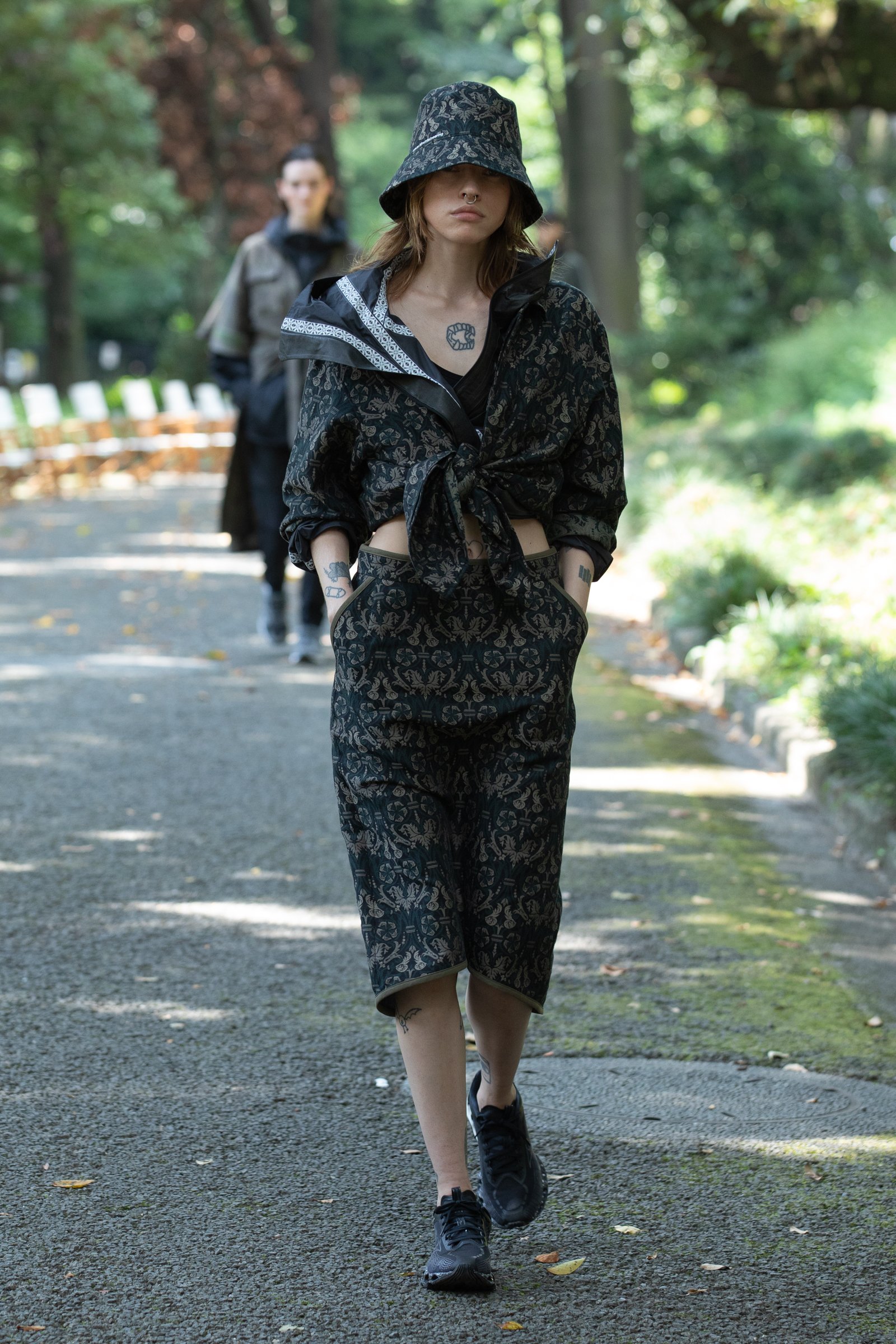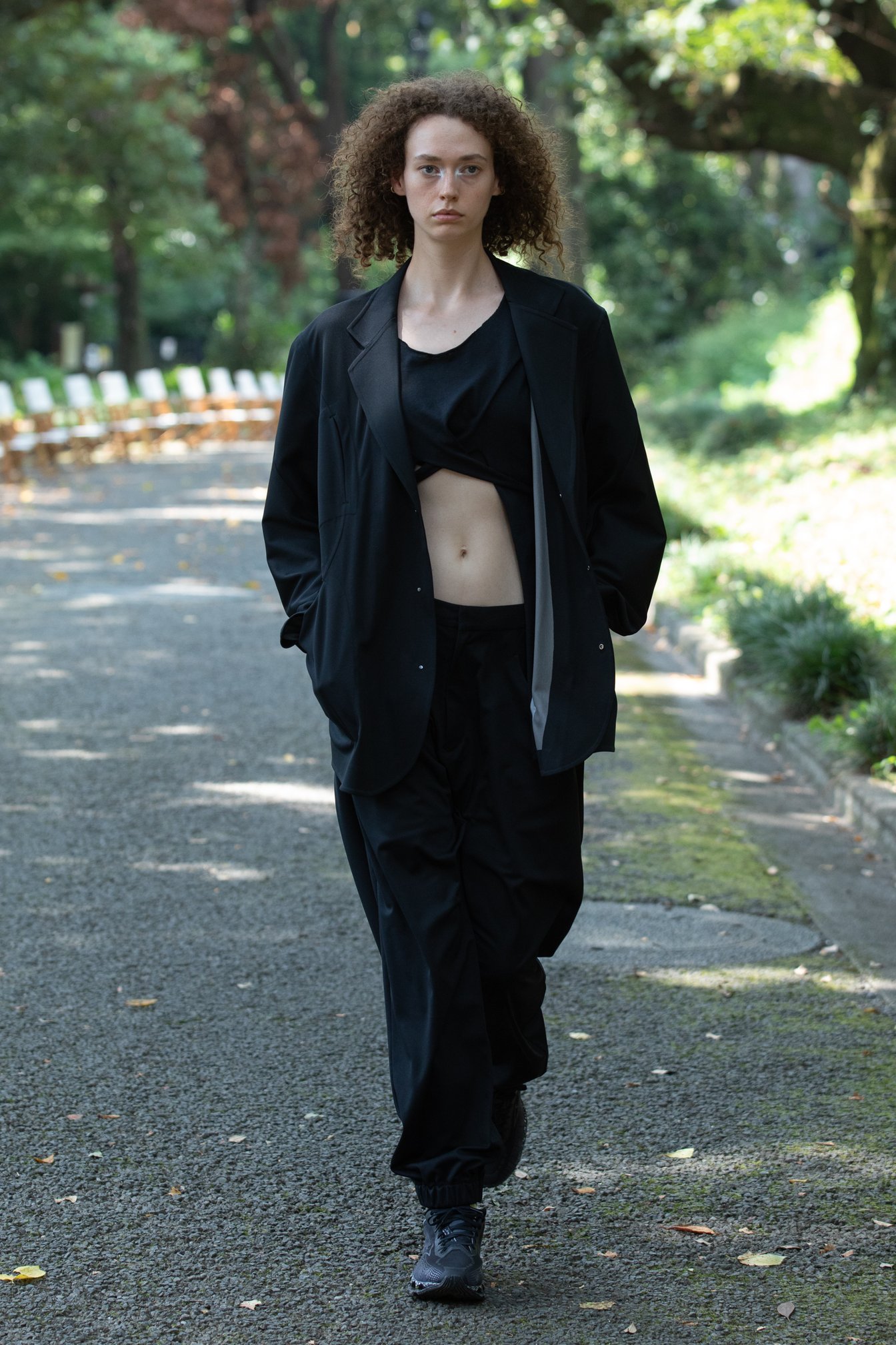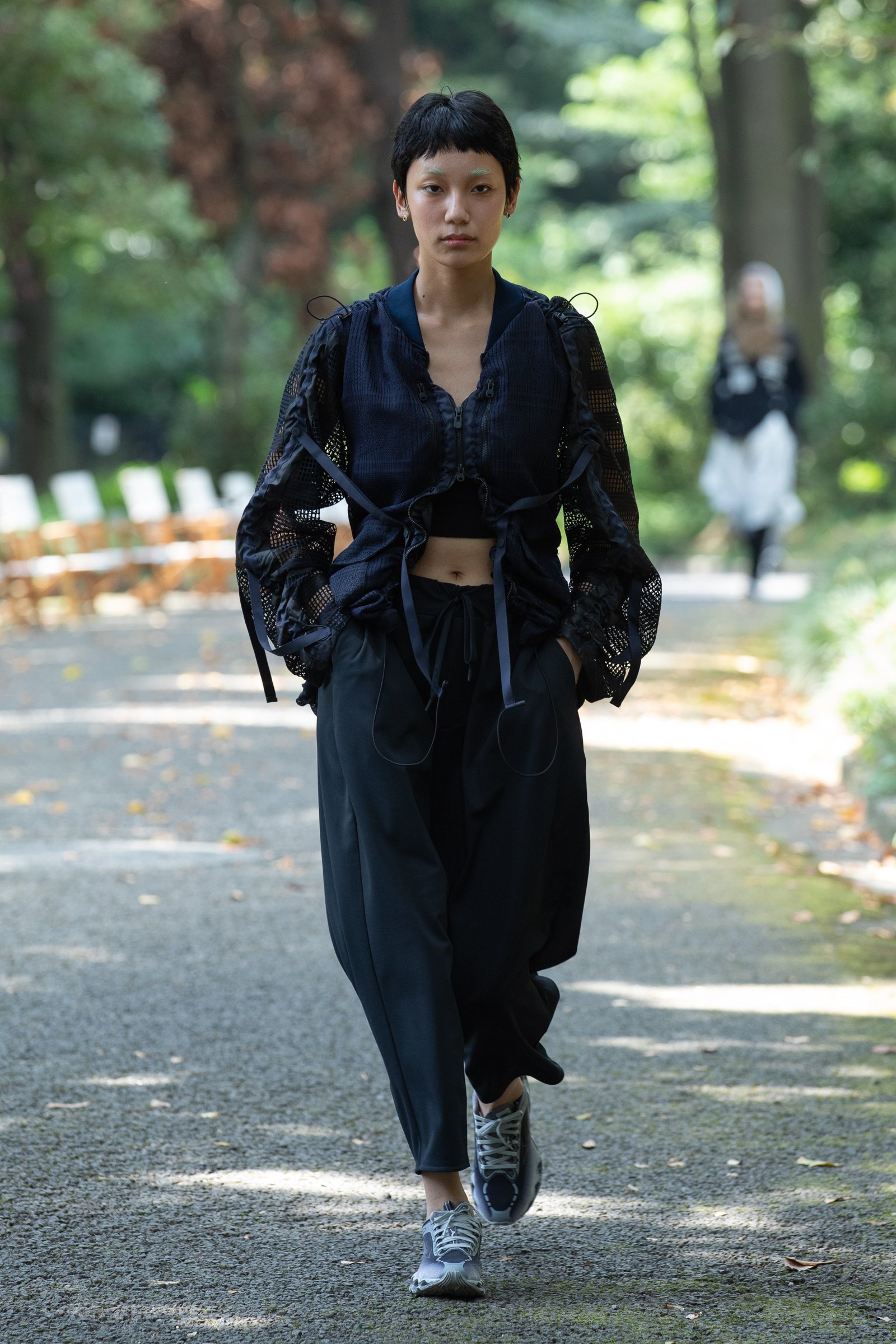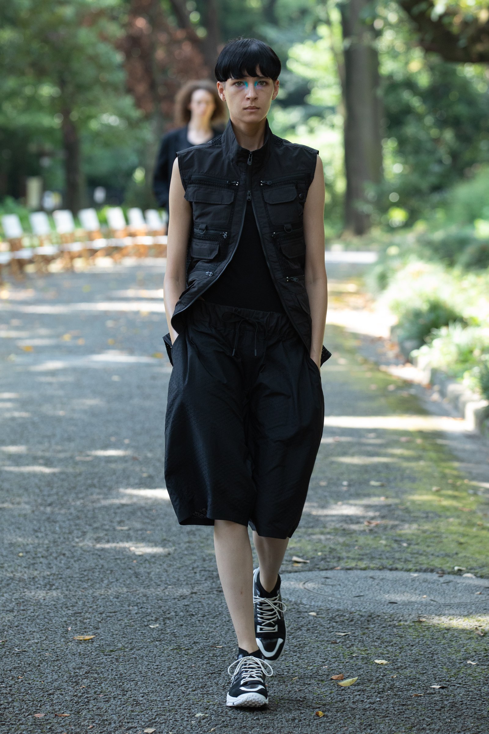 生茂る木々が真夏の日差しを遮る一本道をランウェイにして歩いてきたのは、黒一色の服をまとった女性たち。ファーストルックは、半袖のプルオーバージャケットにスリットが深く入ったスカート、そしてスニーカーを合わせている。女性モデルの起用は、メンズウェアがメインのホワイトマウンテニアリングにとって珍しく、序盤から新しい風を感じさせた。