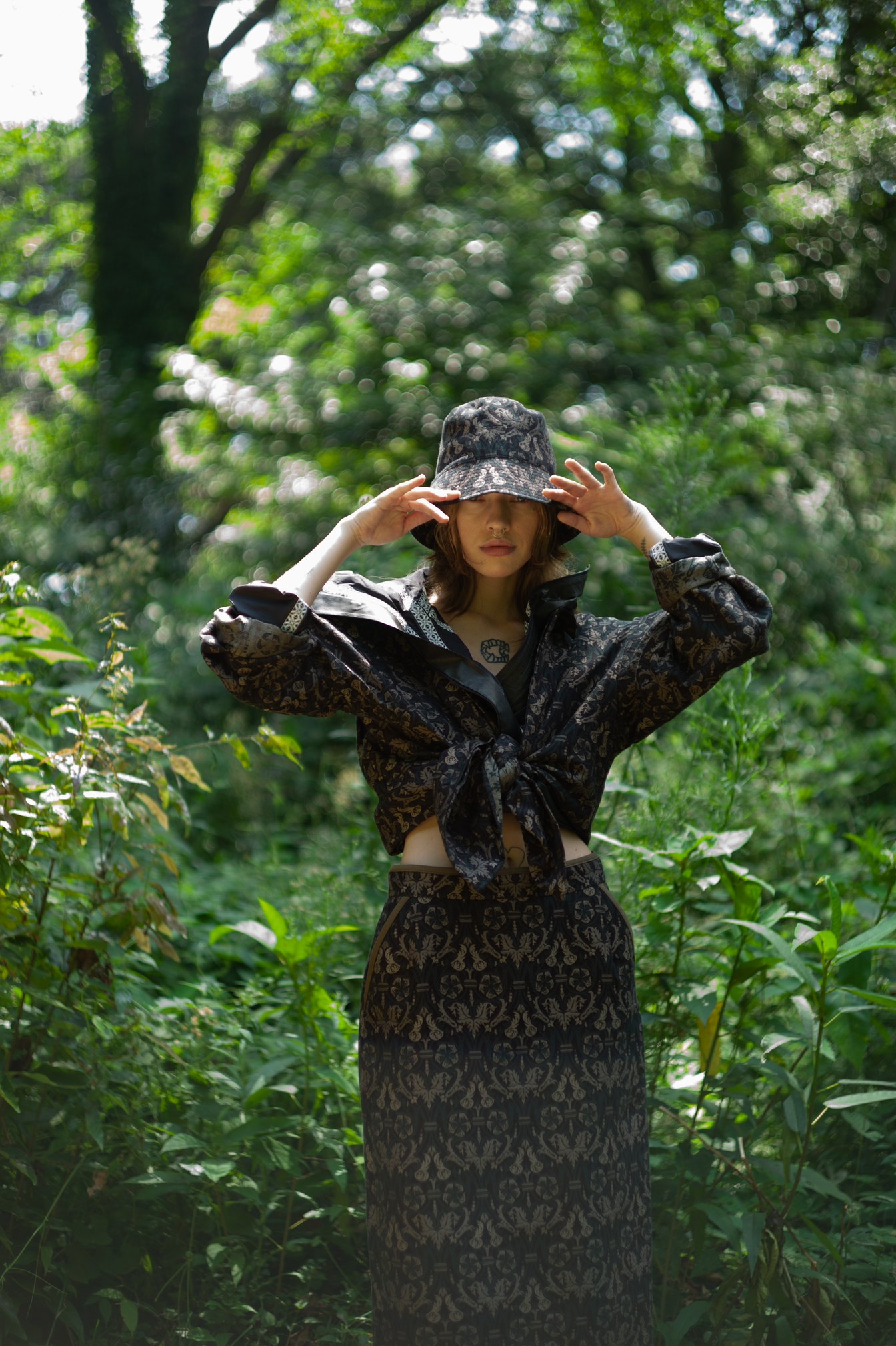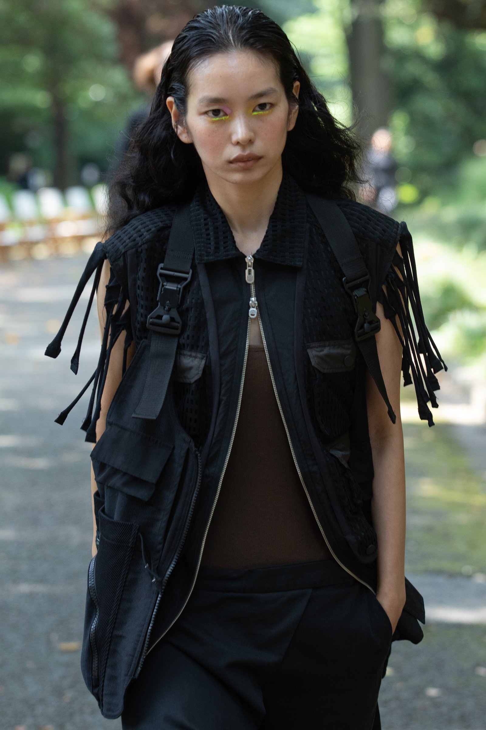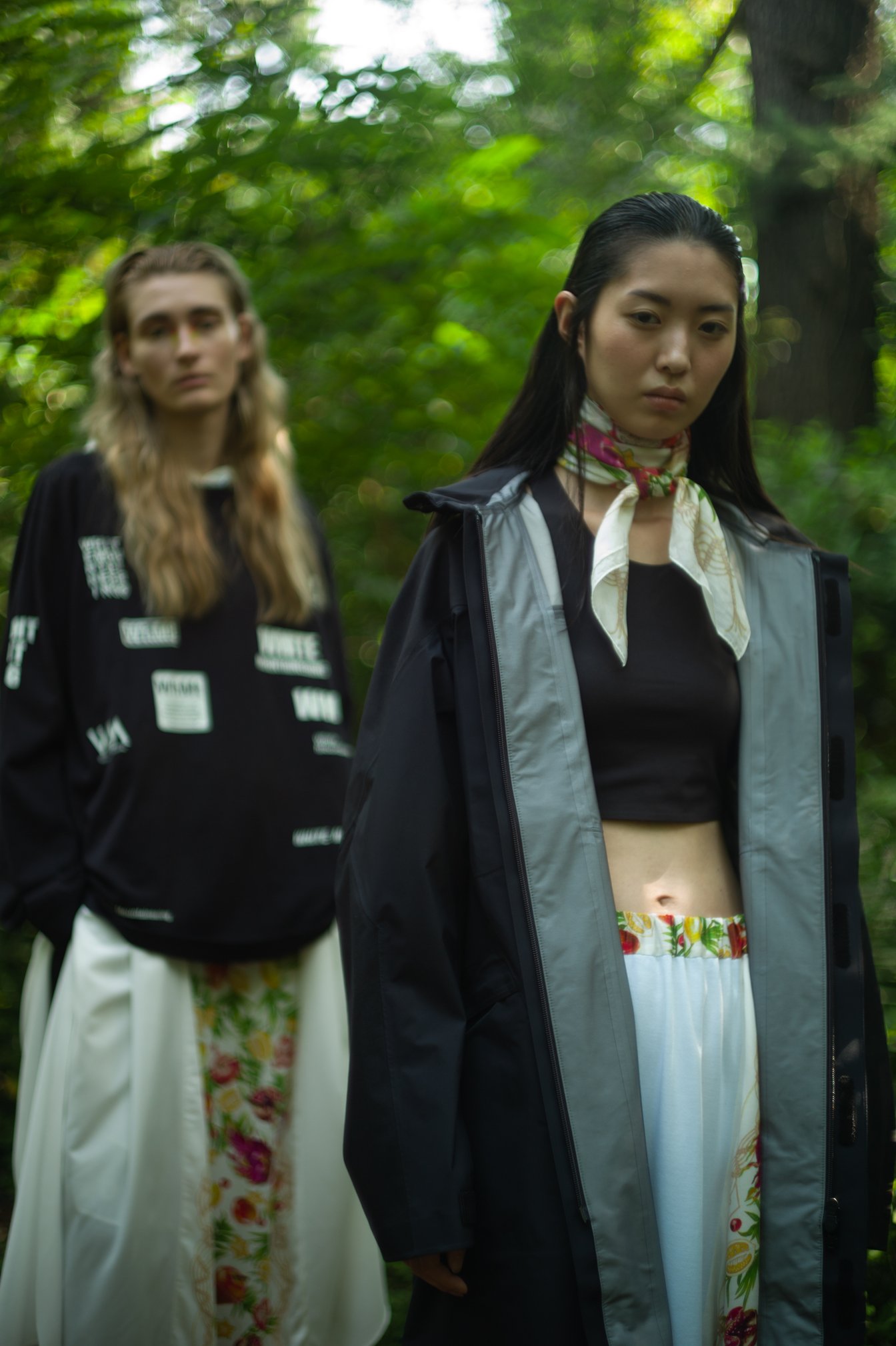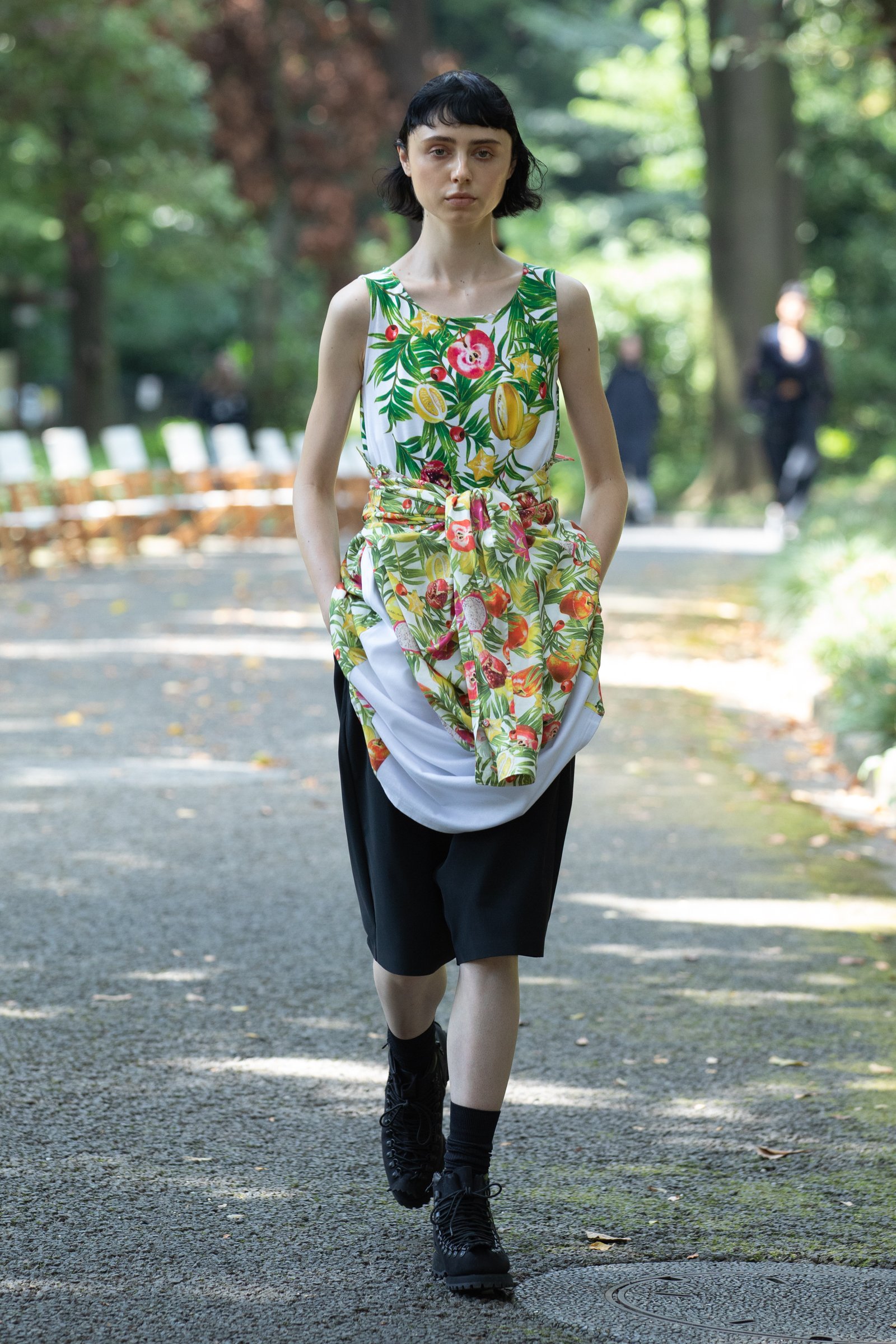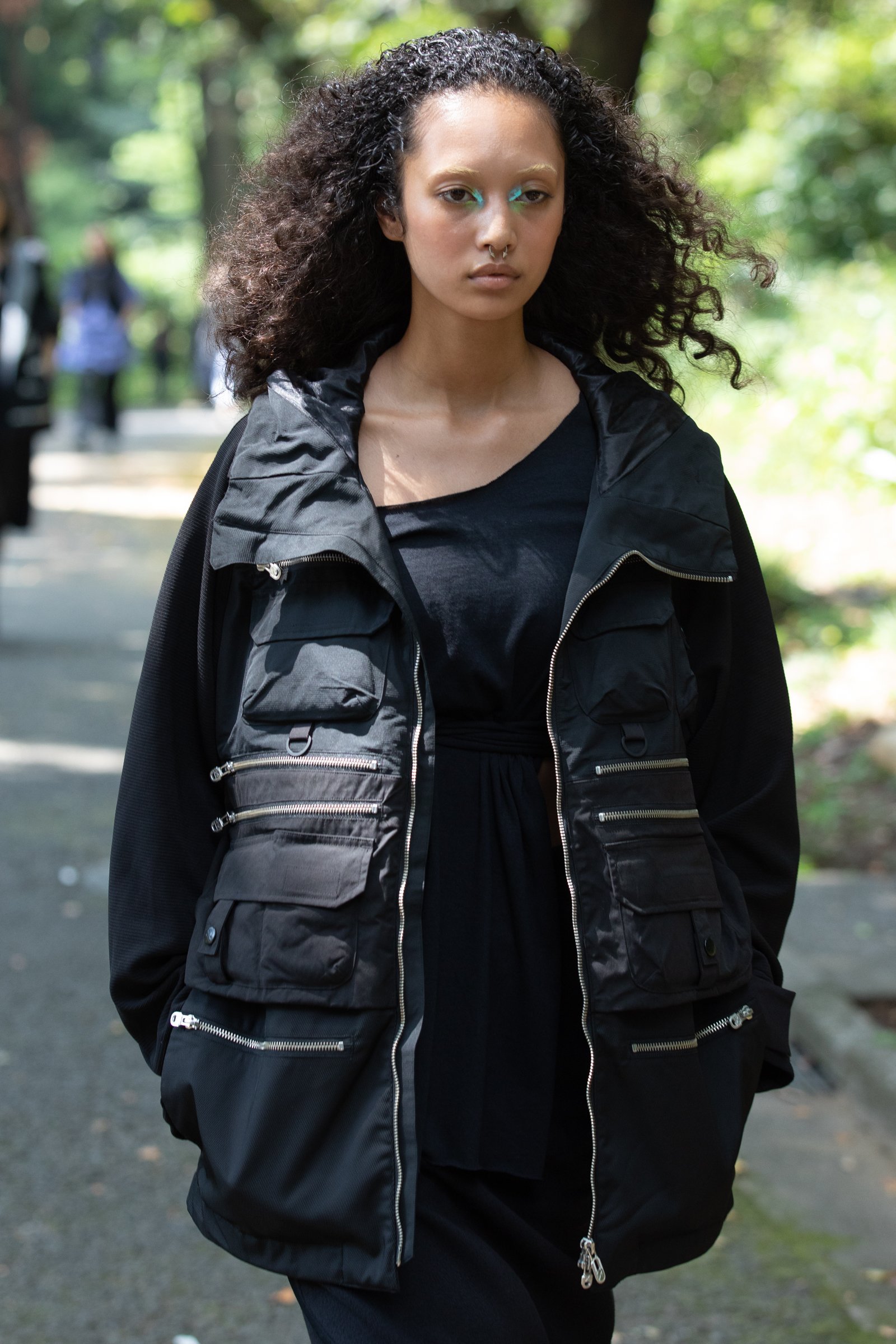 生茂る木々が真夏の日差しを遮る一本道をランウェイにして歩いてきたのは、黒一色の服をまとった女性たち。ファーストルックは、半袖のプルオーバージャケットにスリットが深く入ったスカート、そしてスニーカーを合わせている。女性モデルの起用は、メンズウェアがメインのホワイトマウンテニアリングにとって珍しく、序盤から新しい風を感じさせた。