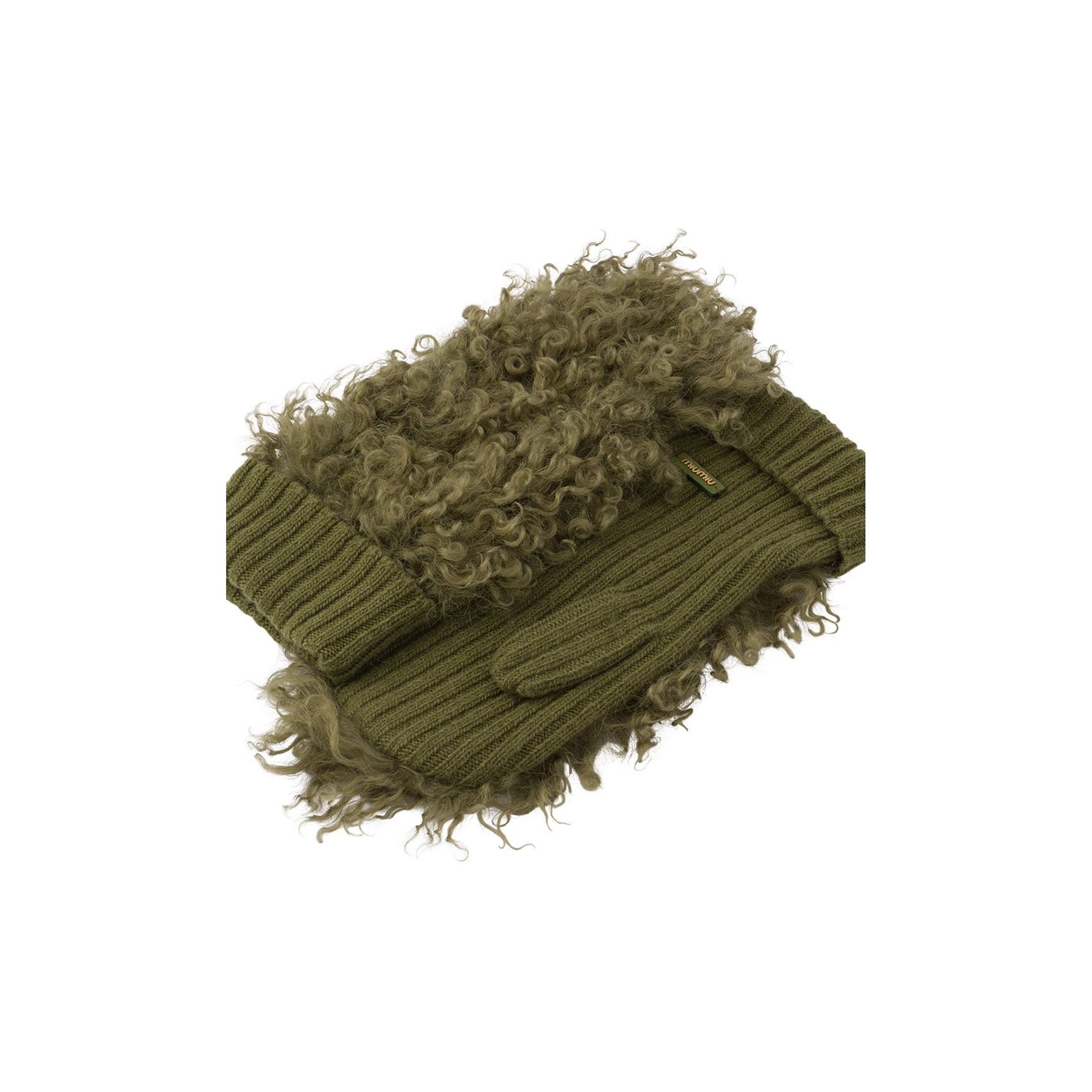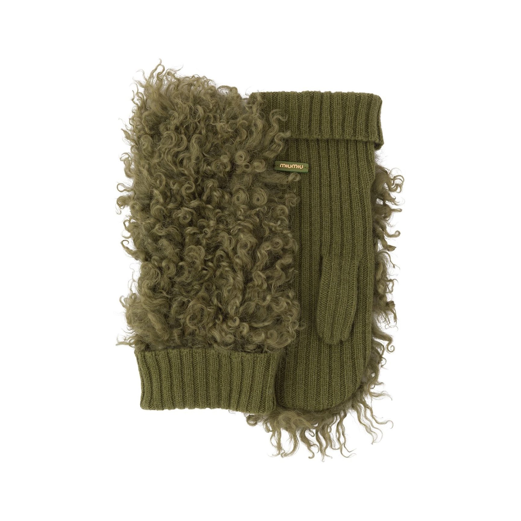 くるくるとしたウール素材の毛足の質感がかわいらしい「ミュウミュウ(MIU MIU)」のリブニットミトン。表と裏、2種類のニットの素材感の違いを楽しめます。