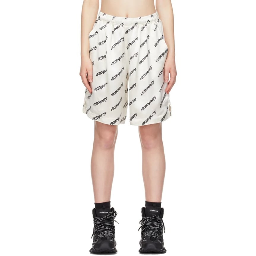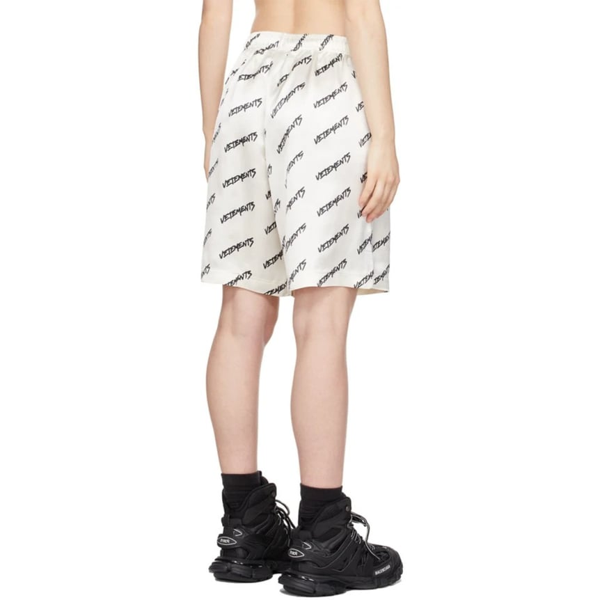 「ヴェトモン(VETEMENTS)」のブランドロゴをプリントした、ハーフ丈のショートパンツ。サラッとした肌触りのビスコースxシルク混サテン生地で、暑い夏も過ごしやすい一着です。