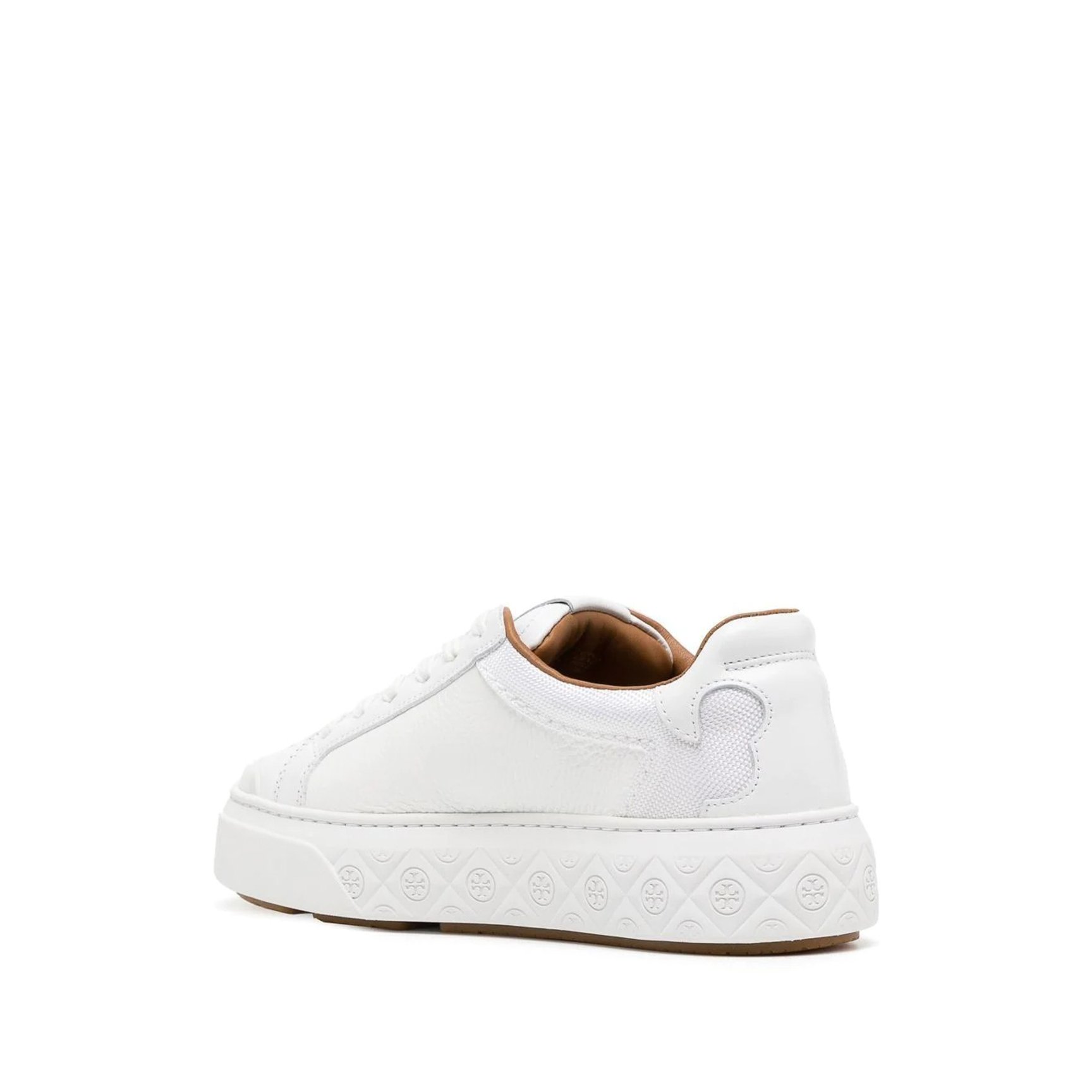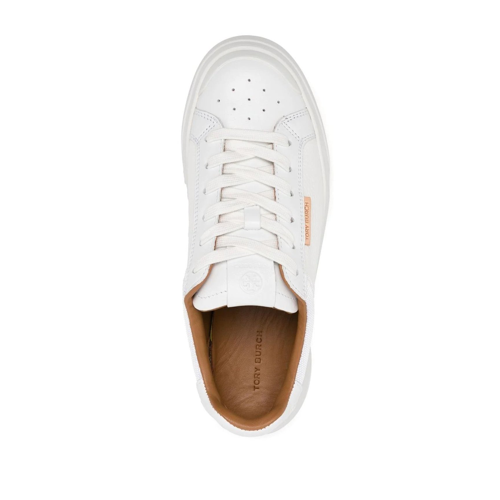 スカートなど、レディなスタイリングにも良く似合う「トリー バーチ(TORY BURCH)」のレザースニーカー。厚めのソールとシュータン、かかと部分にブランドのアイコンロゴをデザインした、丸みのある可憐なフォルムが愛らしい一足。