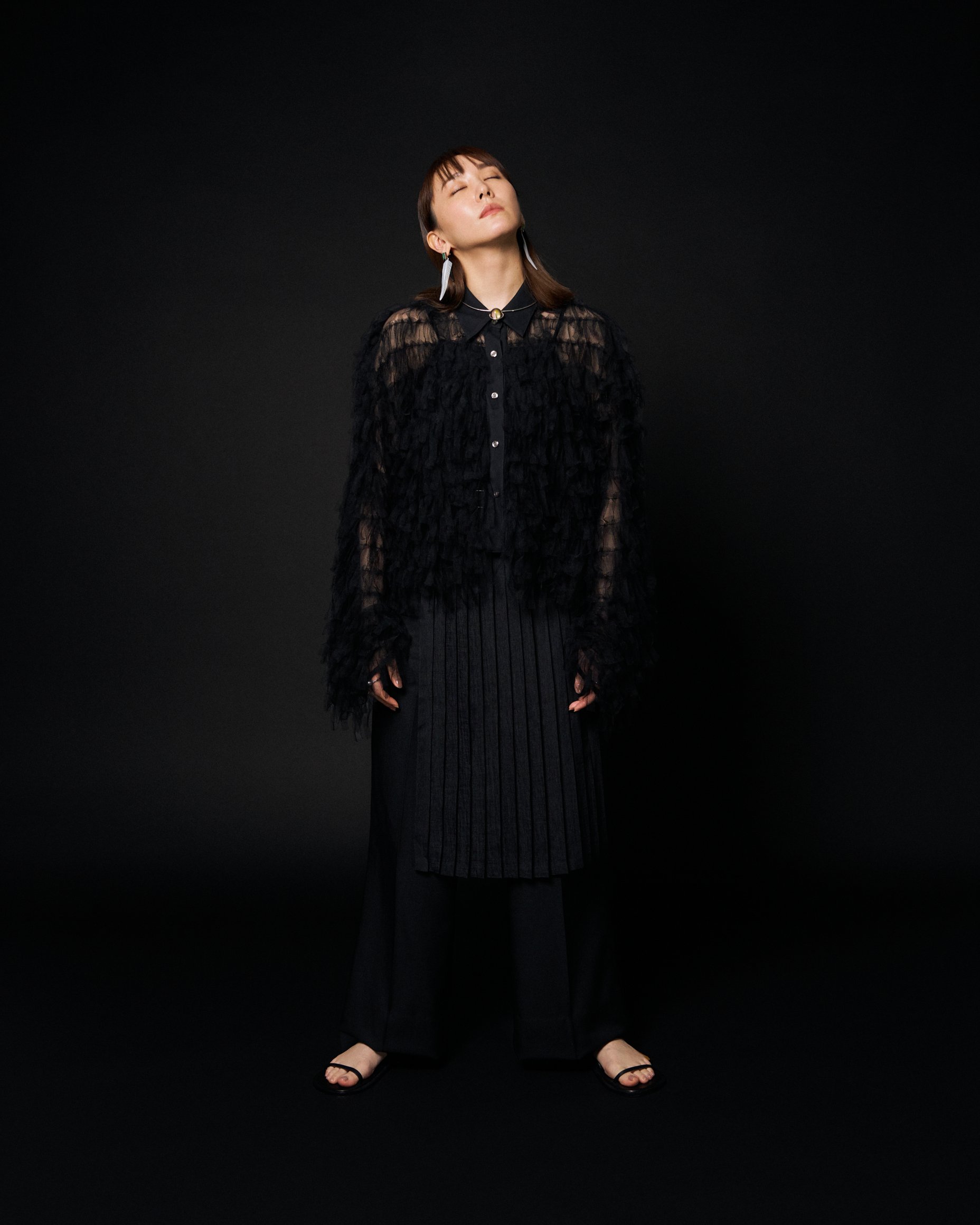 シャツ¥47,300/RUMCHE(BRAND NEWS/tel:03-6421-0870)、ラッププリーツ¥19,470/eunoia(Bshop/tel:03-5775-3266)、パンツpants¥47,300/TOGA PULLA、ピアス¥18,700/TOGA TOO(ともにTOGA 原宿店/tel:03-6419-8136)、ネックレス¥33,000/(MURRAL/http://murral.jp/)、リング[右手薬指]¥6,600[左手]¥4,950/(loni/mail:loni_info@auntierosa.com)、[右手人差し指]¥225,500/oeau(Harumi showroom/tel:03-6433-5395)、サンダル¥46,200/(AURALEE/tel:03-6427-7141)