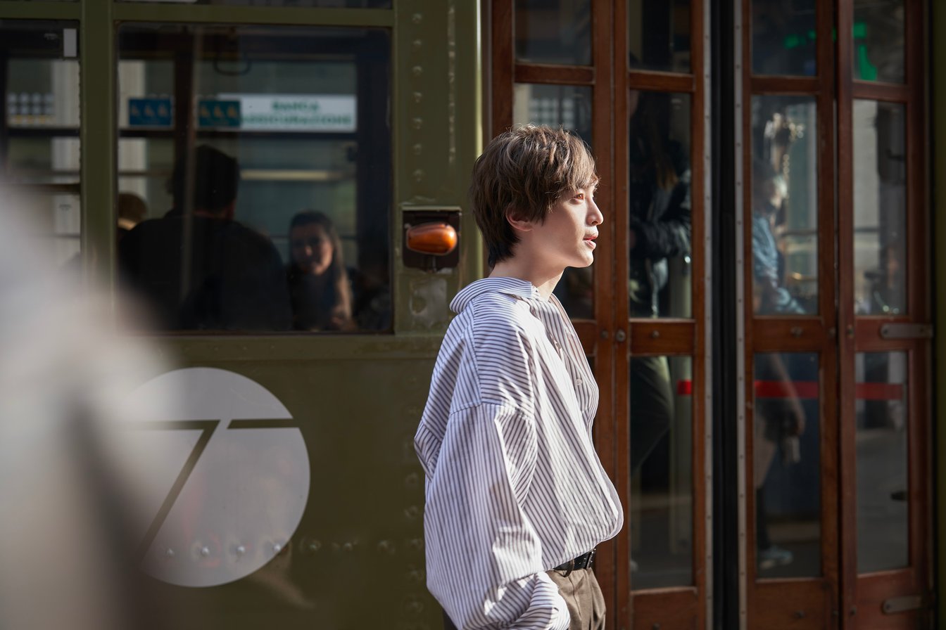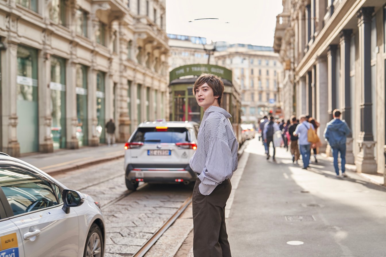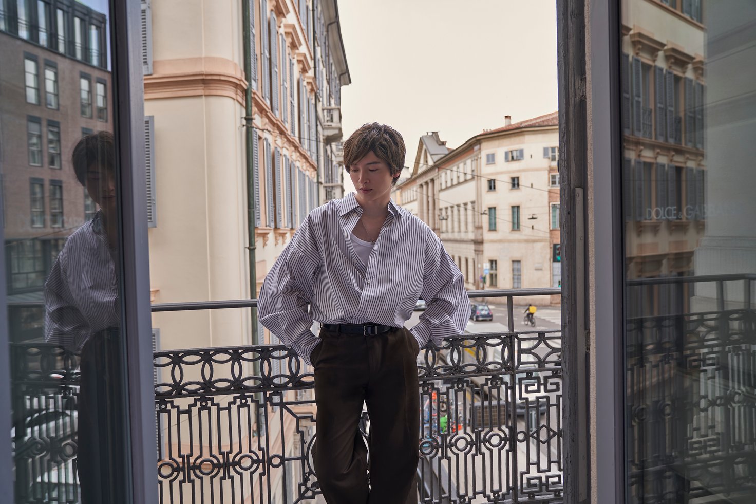 イタリア北部の大都市ミラノに到着し、一息ついてから街の中心地へ。ストライプのオーバーサイズのシャツをタックインしたリラックスした装いでミラノの街を散策します。まず訪れたのは、ミラノ随一の観光スポットで、街のシンボルでもあるドゥオモ(大聖堂)。一歩ずつ近づいていくと、世界最大級を誇る迫力のあるゴシック建築と、精巧な意匠に目を奪われます。