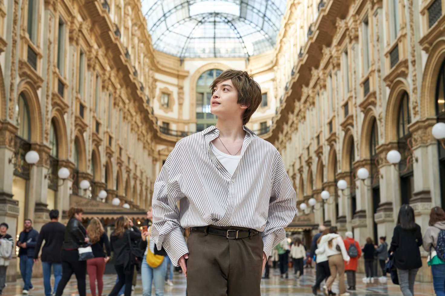 大聖堂広場に隣接する「ガッレリア」は、ドーム状の屋根や床のモザイク画、天井のフレスコ画の装飾が美しいブティックやリストランテ、カフェなどが立ち並ぶショッピングアーケード。道中、ジェラートをほおばったり、ミラネーゼに欠かせない交通手段であるトラムを背に道を歩いたり、「建物一つ一つがおしゃれで日本では見られない景色なので気分が上がります」と玉森さん。異国情緒あふれる街の景色を記憶にとどめます。