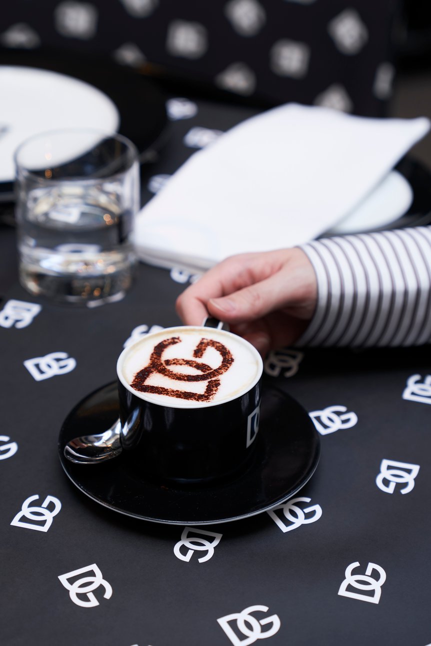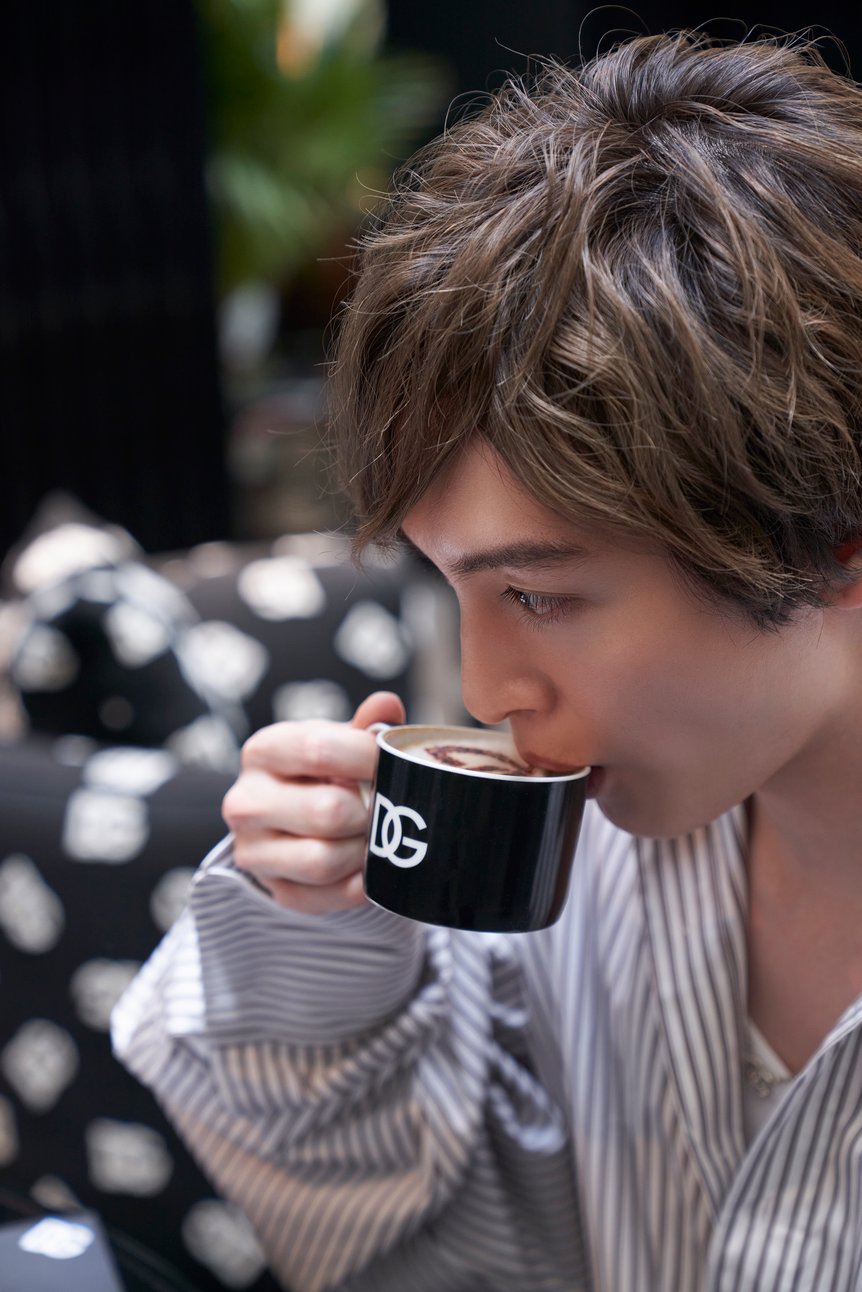 気持ちの良い自然光が差し込む屋根付きのテラス席は、地元のミラネーゼや観光客で賑わいを見せます。デザイナーの2人も常連なのだとか。コーヒー好きでイタリア人が毎日嗜むエスプレッソに興味津々だった玉森さん。ここではDGのロゴが入ったラテで一息。
