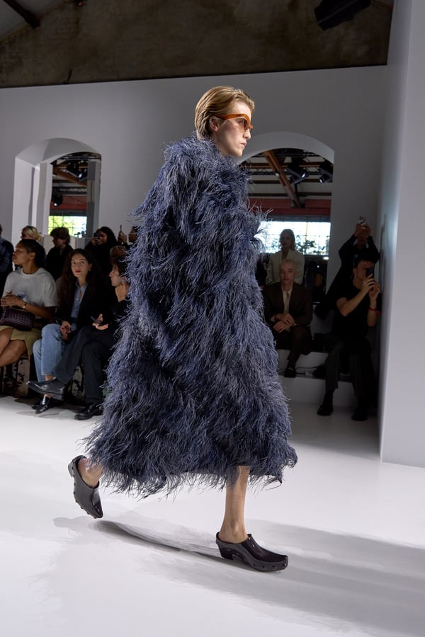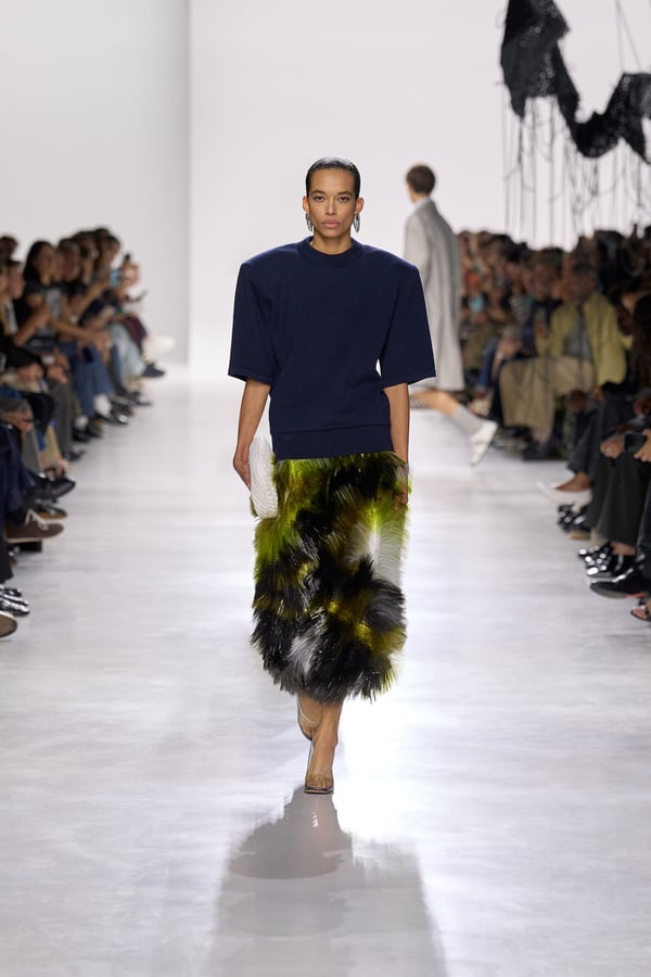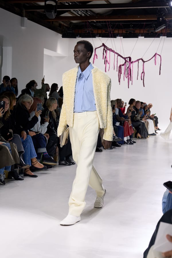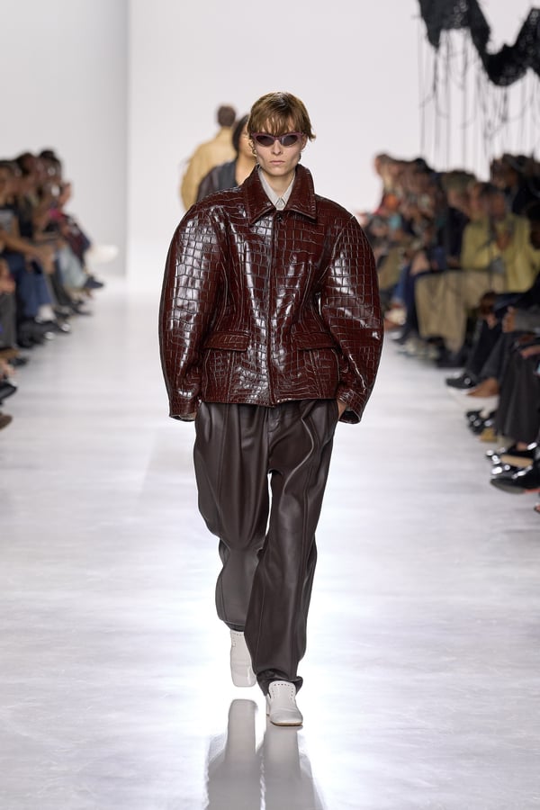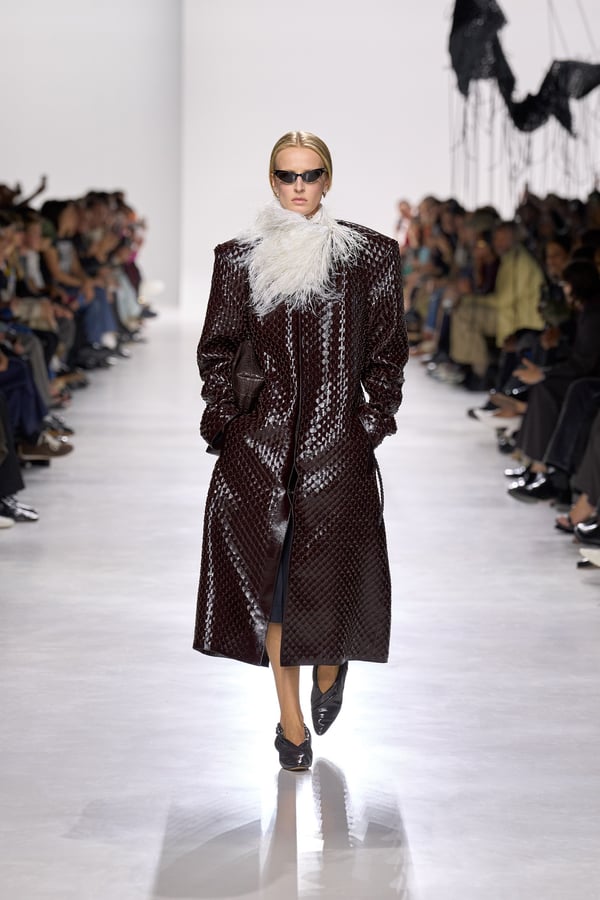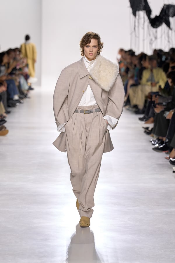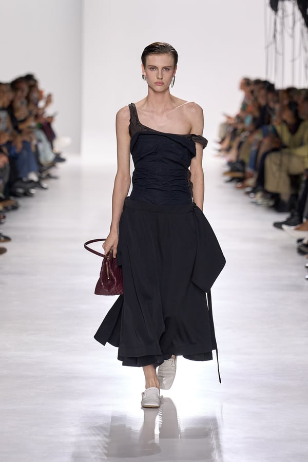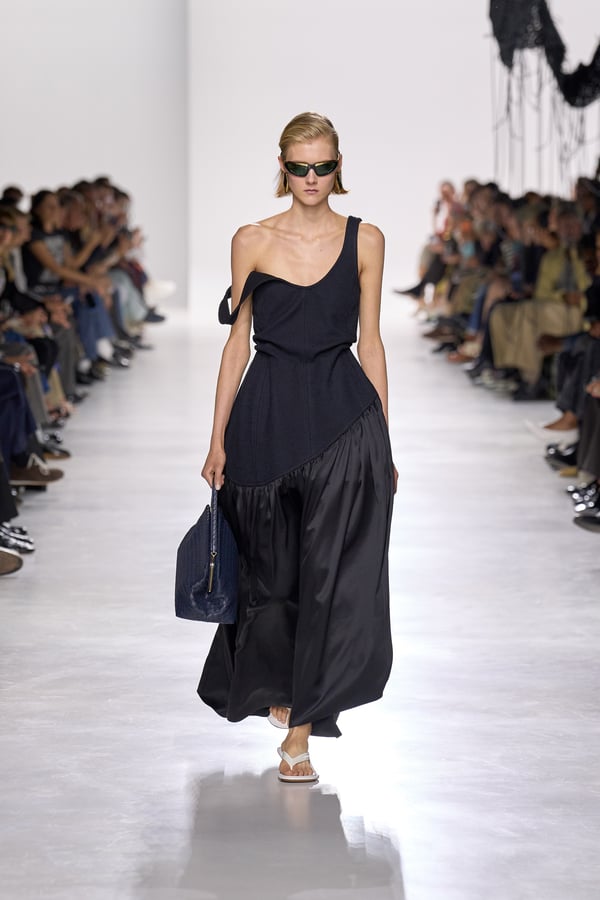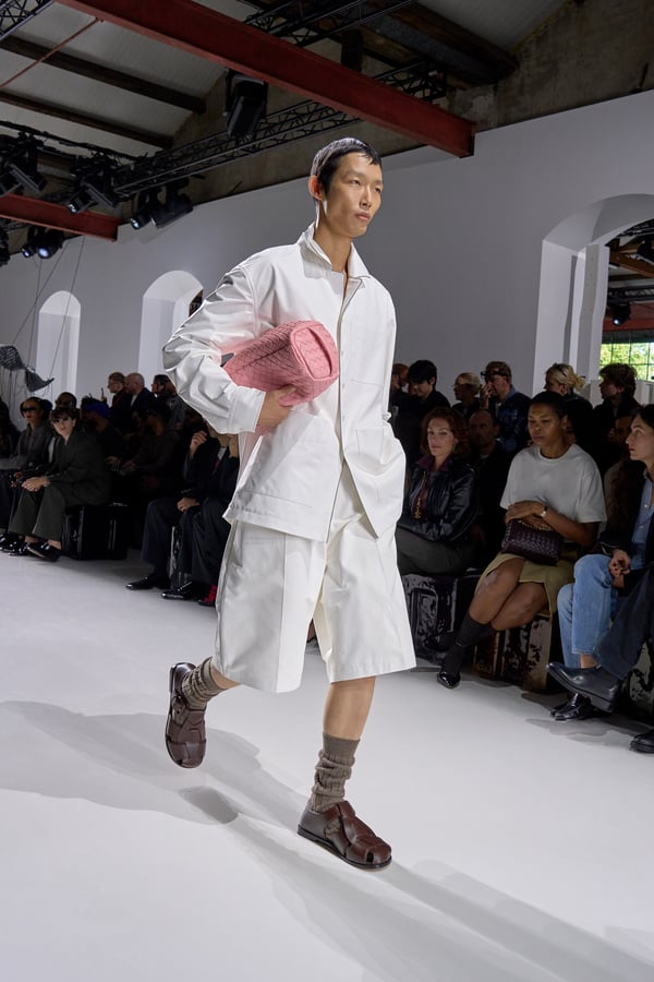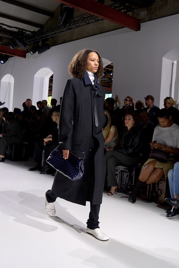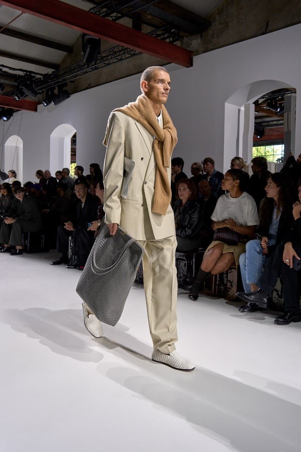 ショーは、ヴェネツィアの華やかさ、ニューヨークのエネルギー、ミラノの本質主義という三都市の精神性を結集。1980年代か2000年代初頭に活躍した初の女性デザイナー、ラウラ?ブラジオンの足跡と、共同創業者レンツォ?ゼンジアーロの「ソフト?ファンクショナリティ」の哲学を現代的に再解釈した。クラシックな9mm/12mmスケールのイントレチャート技法は、現代的なアレンジを加えつつ、コレクション全体を貫く統一要素となり、夏向けの軽量テーラリング素材を中心に、ナッパレザーのトレンチコートやコットン裏地付きイブニングドレスなど、伝統的メンズテーラリングの規律と柔軟性が融合した作品が並んだ。