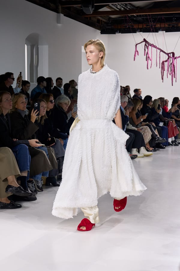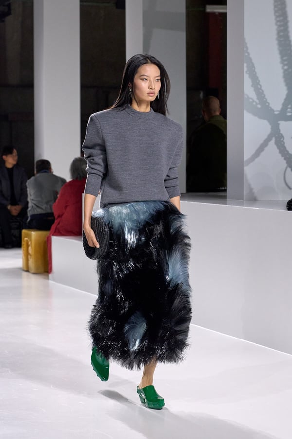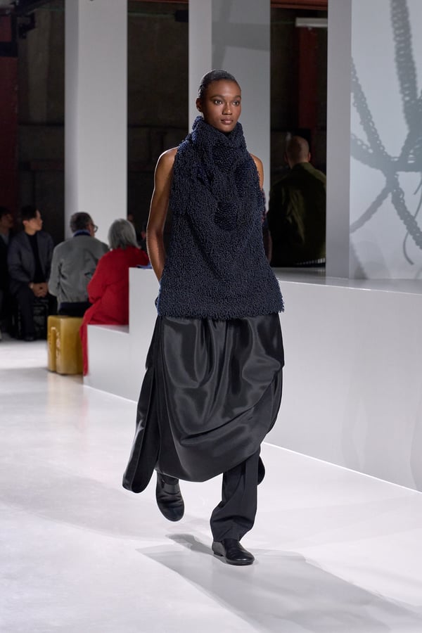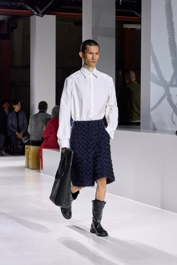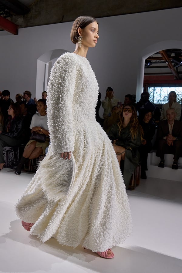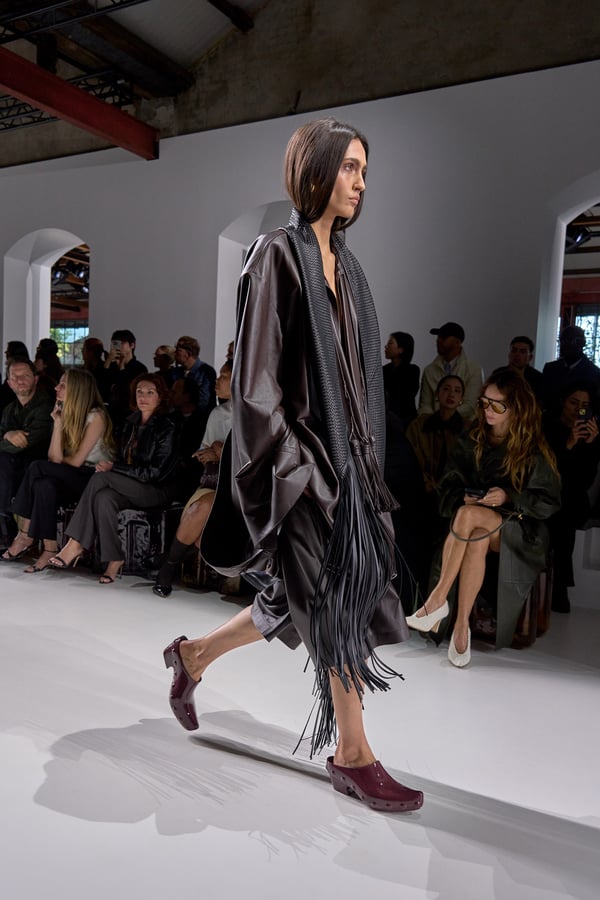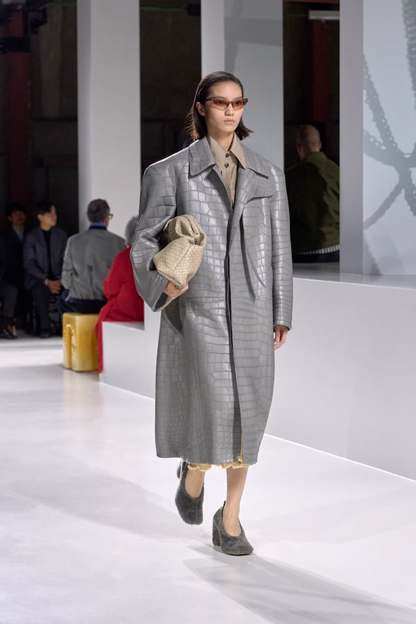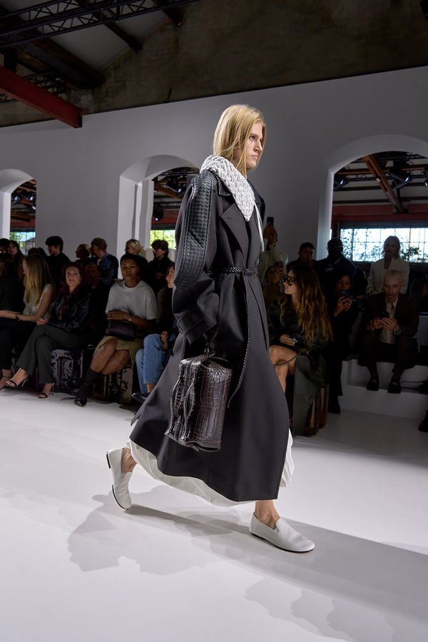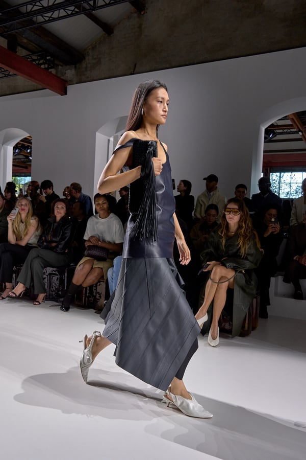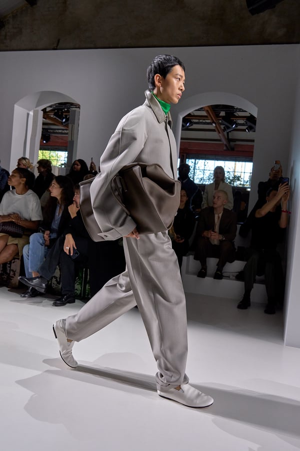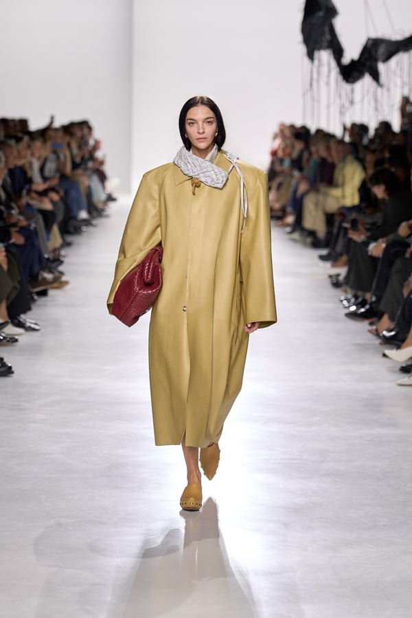 バッグコレクションでは、「ローレン」が縦型の新プロポーションで復活し、ノットは柔らかな構造へと進化。新作スカッシュやフレームトート、クラフティバスケットなど、伝統を尊重したアイテムを披露した。