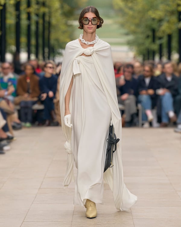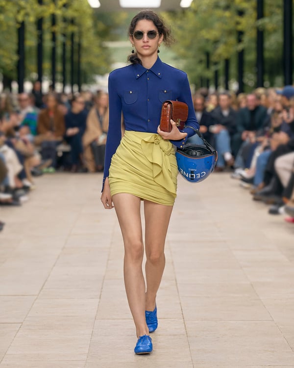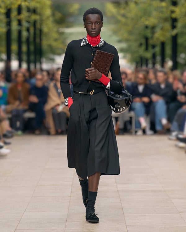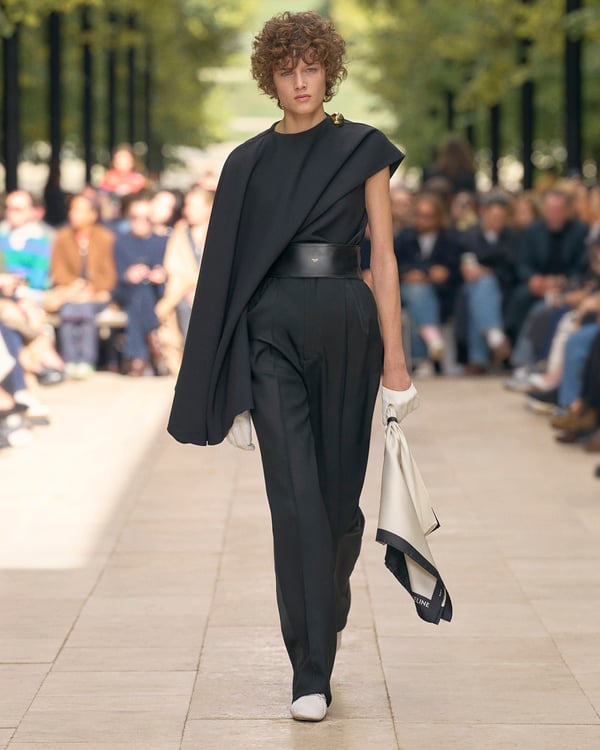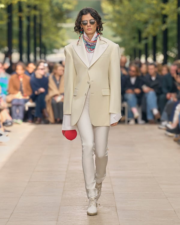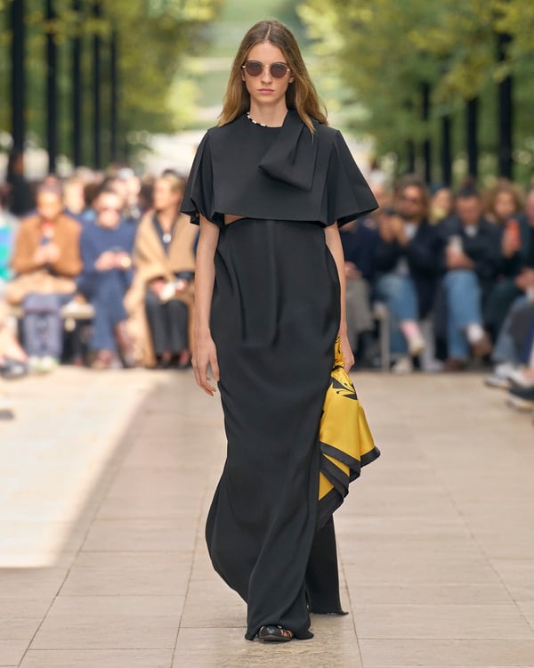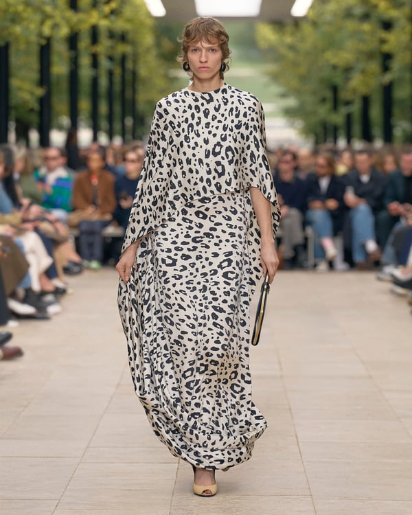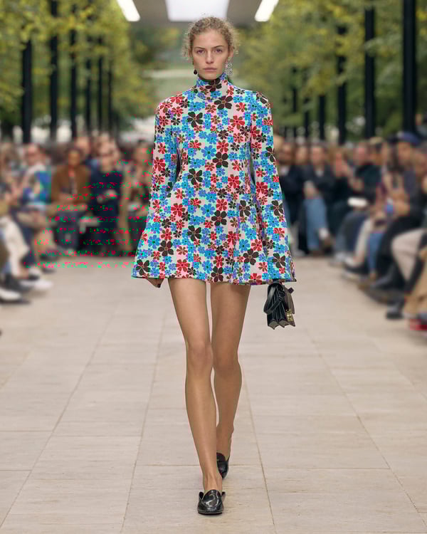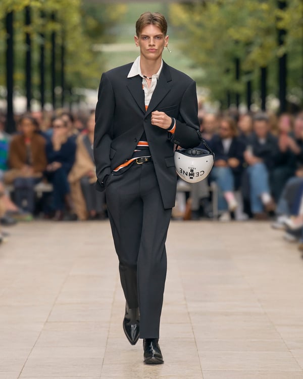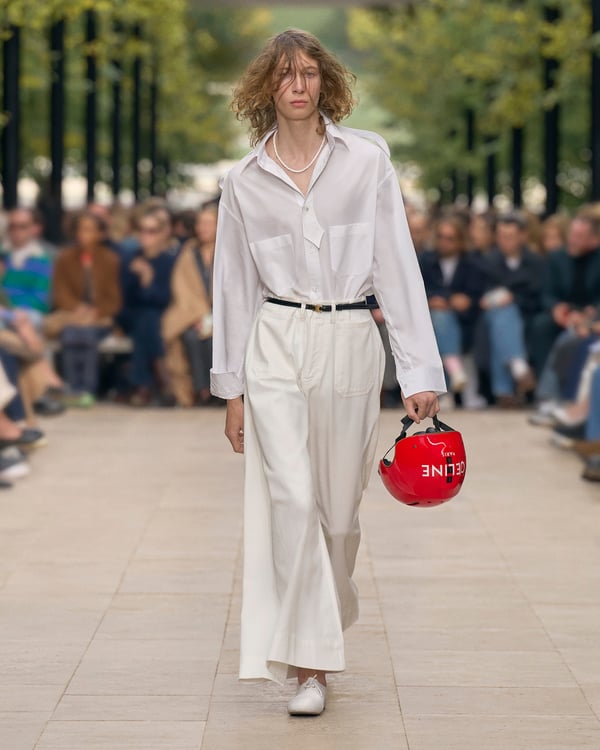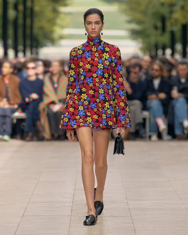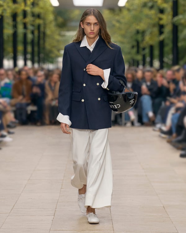 マイケル?ライダー(Michael Rider)による「セリーヌ(CELINE)」2026年サマーコレクションは、秋色に染まり始めた木々が揺れるパリ郊外のサン=クルー公園で披露された。前回7月に発表したデビューシーズンのスプリングコレクションからの“継続”とし、シルクスカーフや自転車のヘルメットなど、ブランドを象徴するアイテムが新たな解釈で登場。60年代風の花柄ミニドレスやショルダーパッドを効かせたジャケット、シルキーな素材のラグビーシャツなどが並び、鮮やかなスカーフをアクセントに都会的で洗練されたウェアラブルスタイルが披露された。