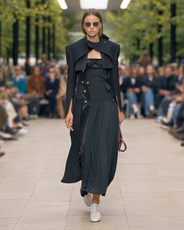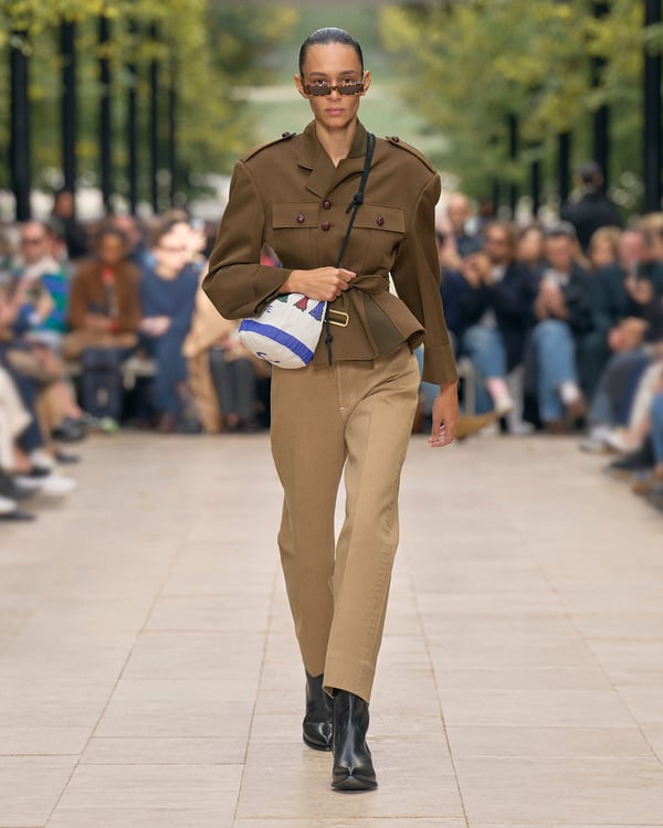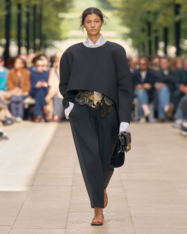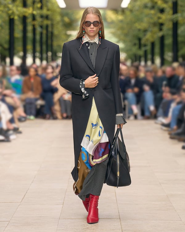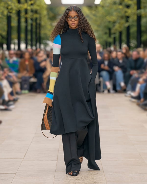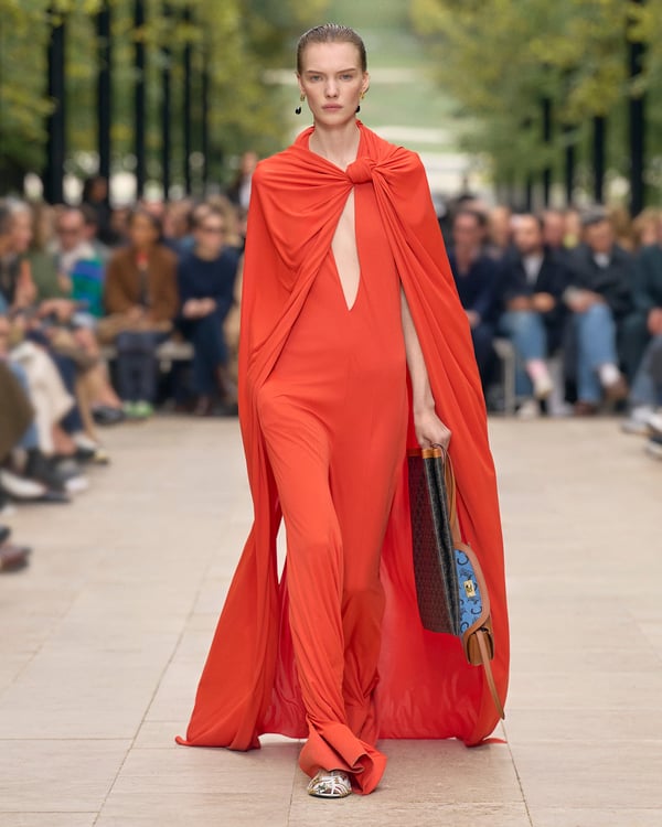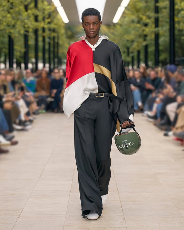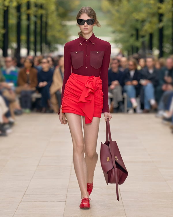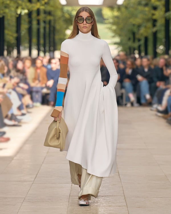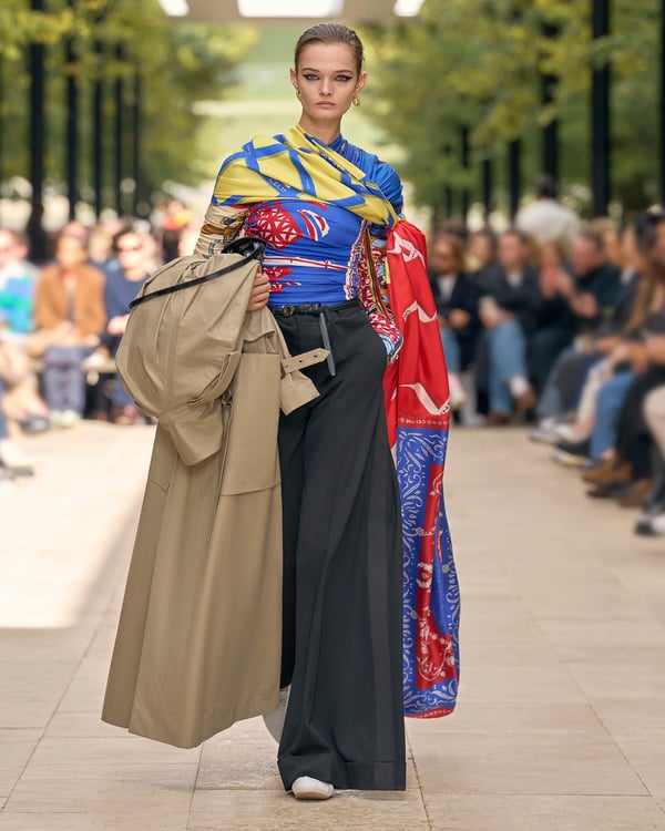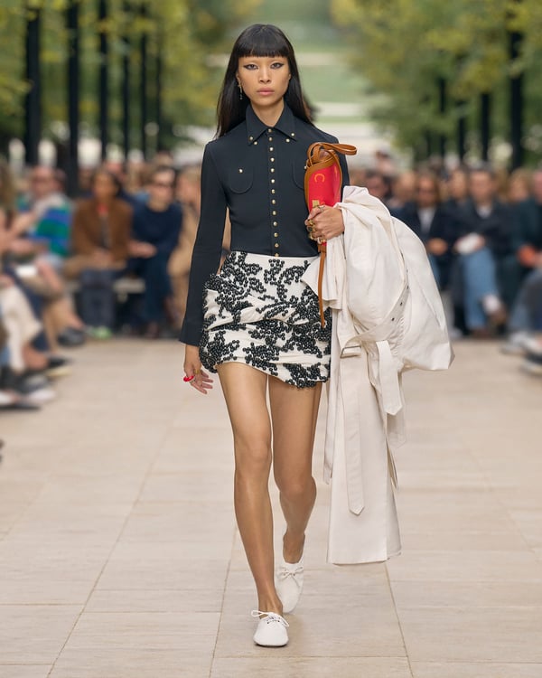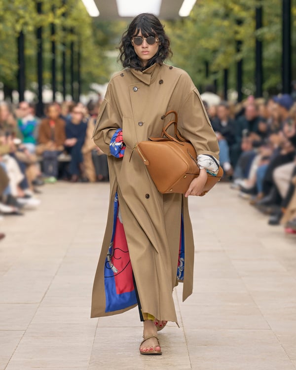 マイケル?ライダー(Michael Rider)による「セリーヌ(CELINE)」2026年サマーコレクションは、秋色に染まり始めた木々が揺れるパリ郊外のサン=クルー公園で披露された。前回7月に発表したデビューシーズンのスプリングコレクションからの“継続”とし、シルクスカーフや自転車のヘルメットなど、ブランドを象徴するアイテムが新たな解釈で登場。60年代風の花柄ミニドレスやショルダーパッドを効かせたジャケット、シルキーな素材のラグビーシャツなどが並び、鮮やかなスカーフをアクセントに都会的で洗練されたウェアラブルスタイルが披露された。