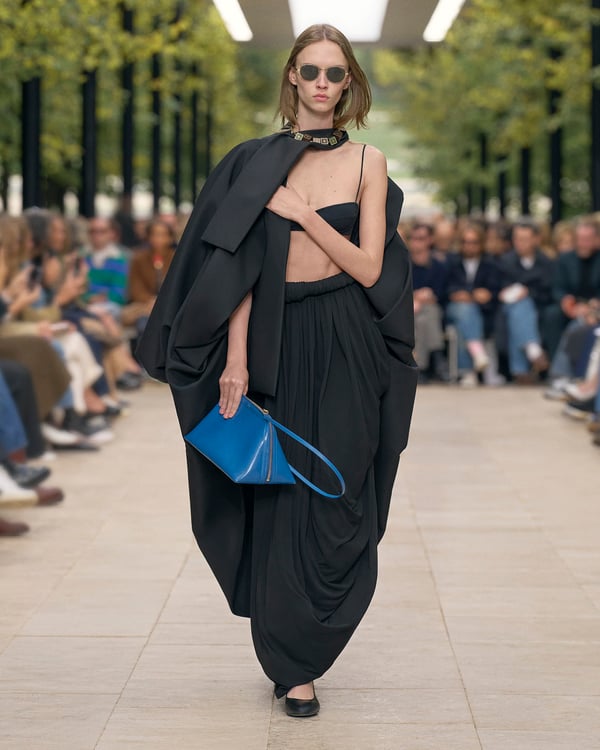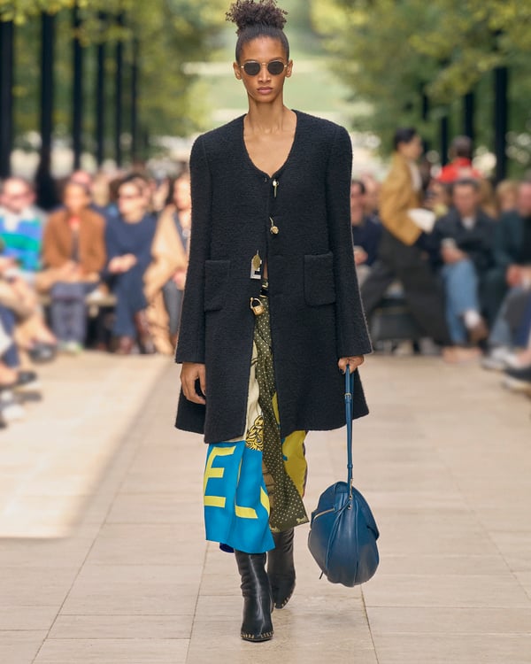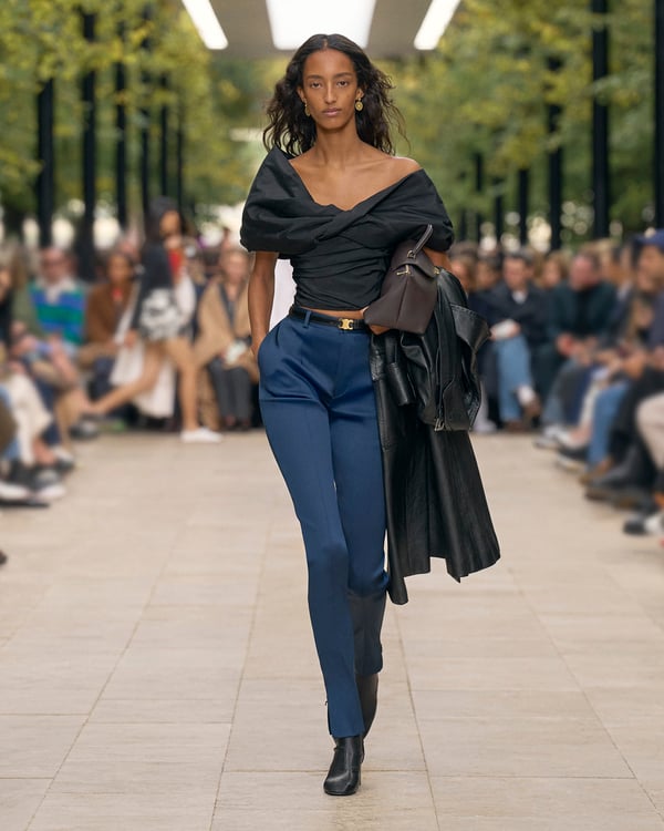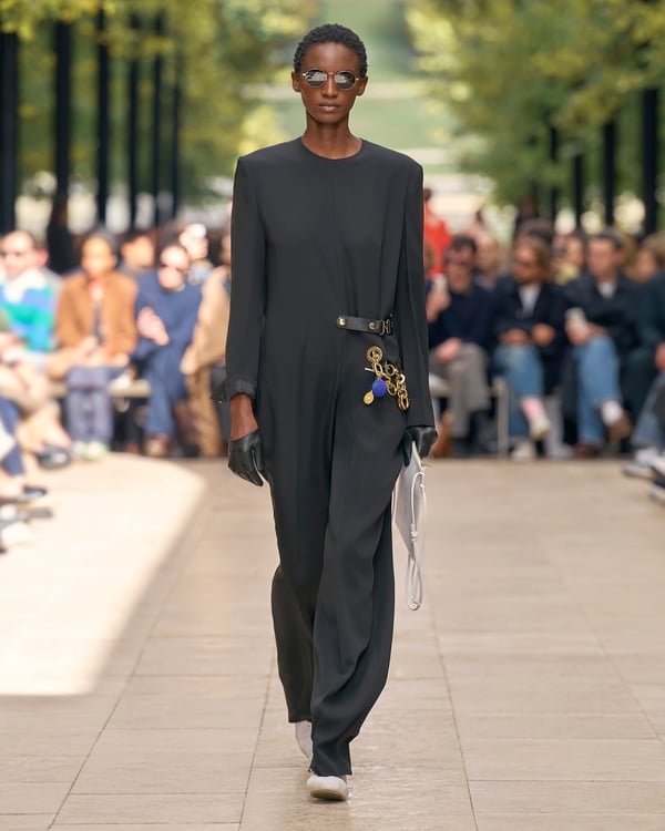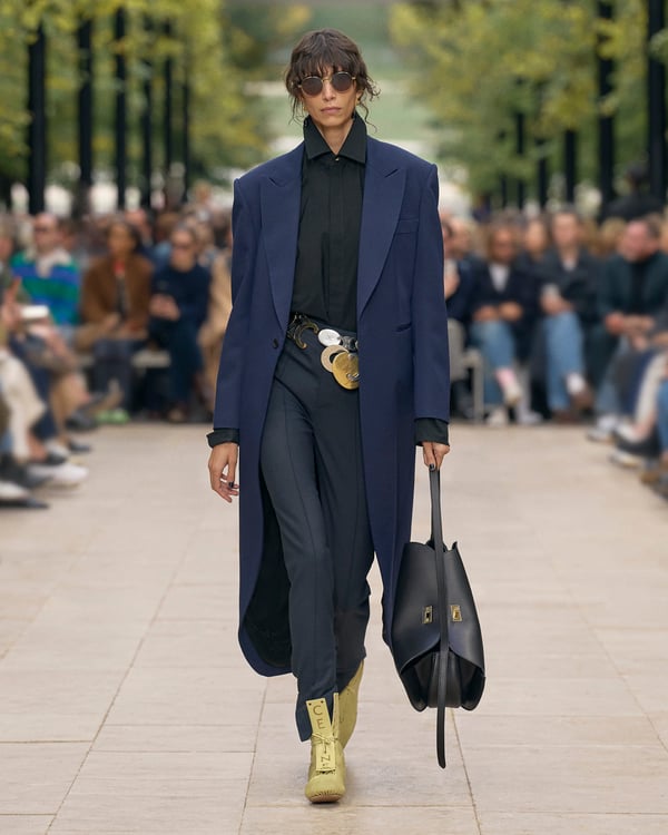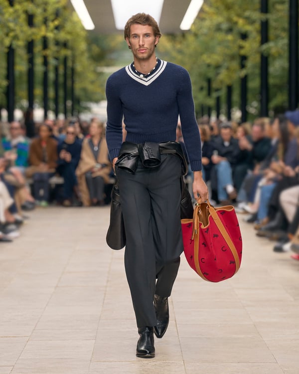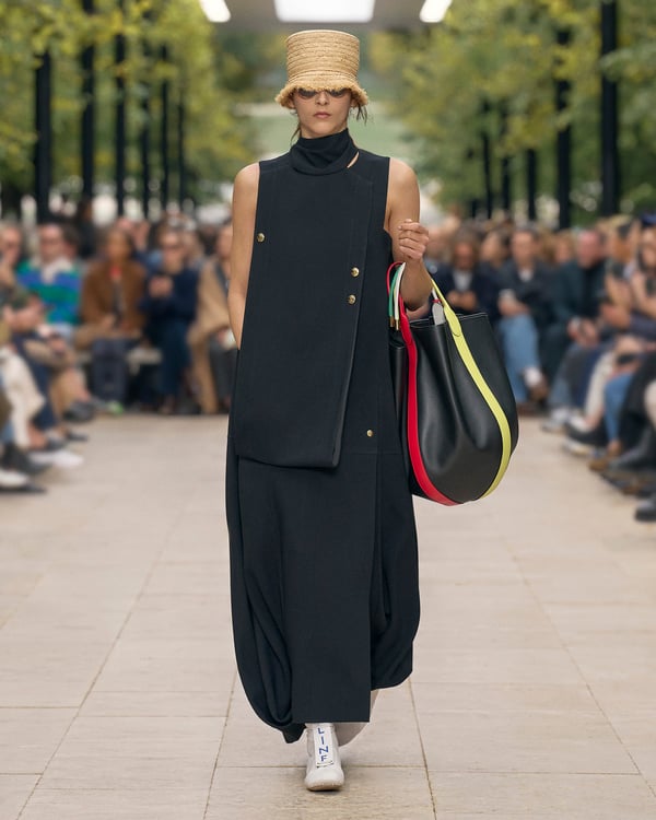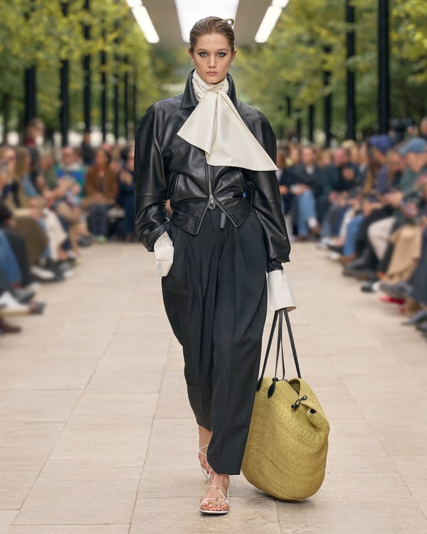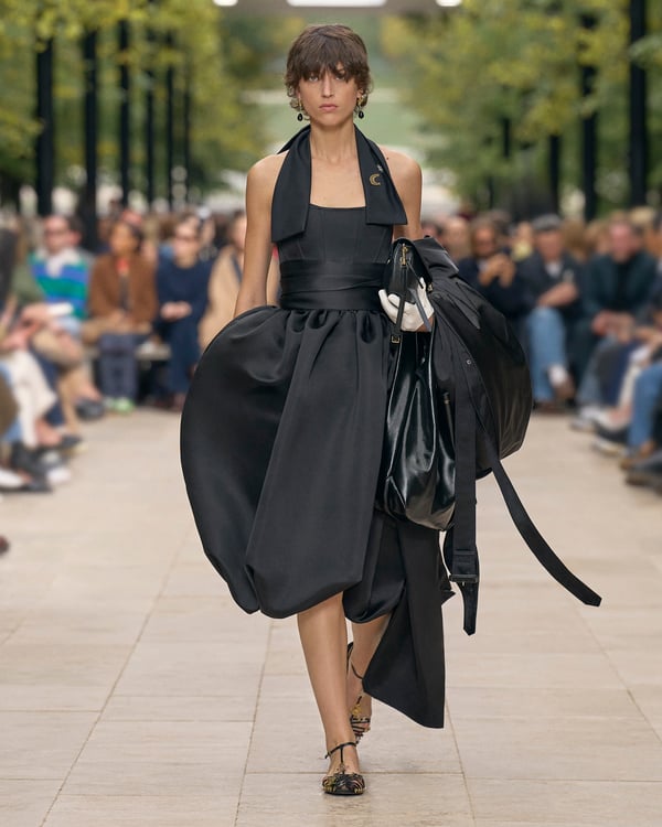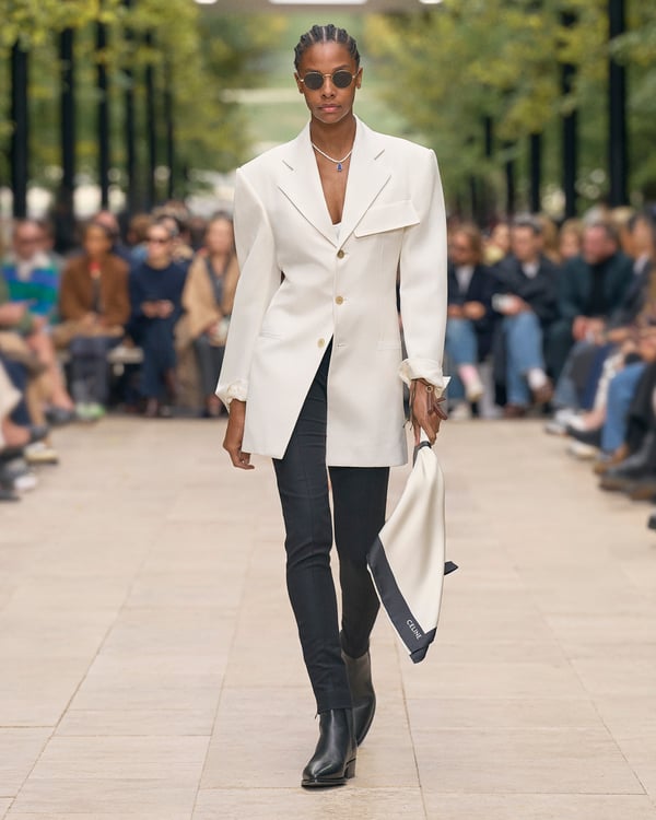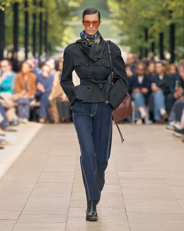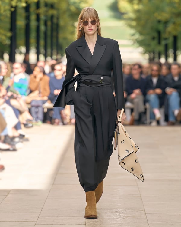 マイケル?ライダー(Michael Rider)による「セリーヌ(CELINE)」2026年サマーコレクションは、秋色に染まり始めた木々が揺れるパリ郊外のサン=クルー公園で披露された。前回7月に発表したデビューシーズンのスプリングコレクションからの“継続”とし、シルクスカーフや自転車のヘルメットなど、ブランドを象徴するアイテムが新たな解釈で登場。60年代風の花柄ミニドレスやショルダーパッドを効かせたジャケット、シルキーな素材のラグビーシャツなどが並び、鮮やかなスカーフをアクセントに都会的で洗練されたウェアラブルスタイルが披露された。
