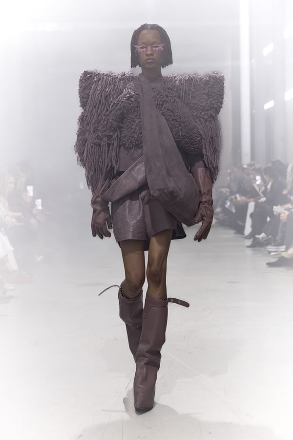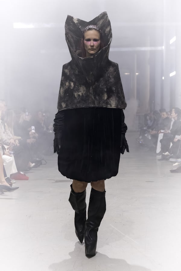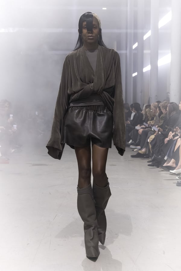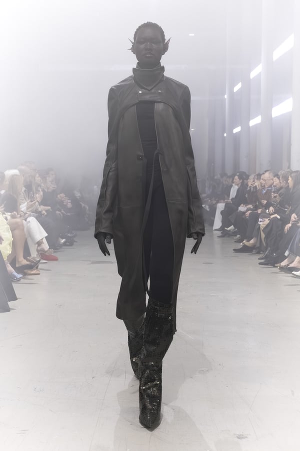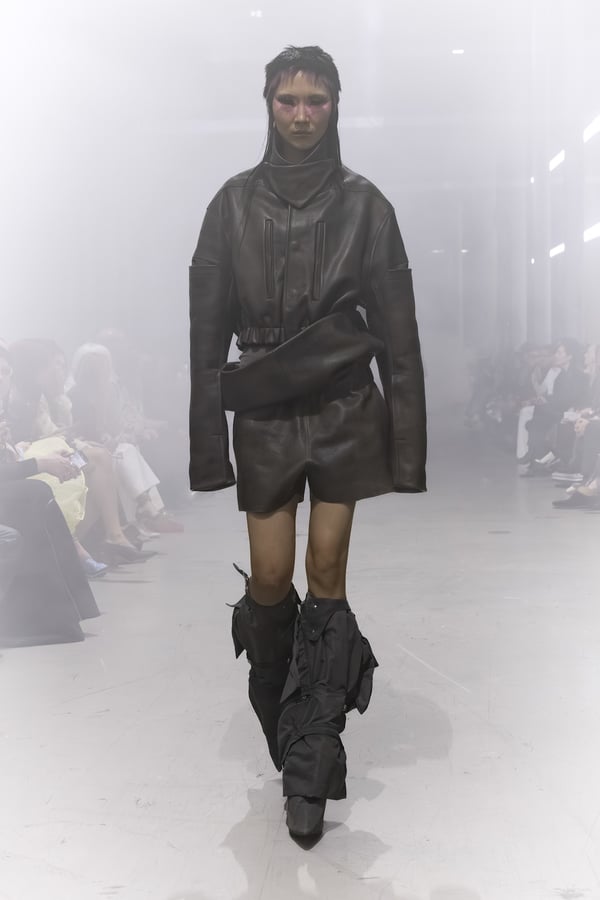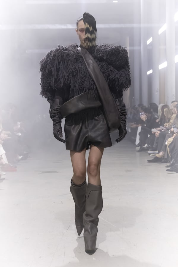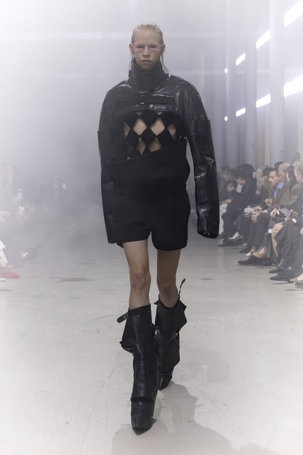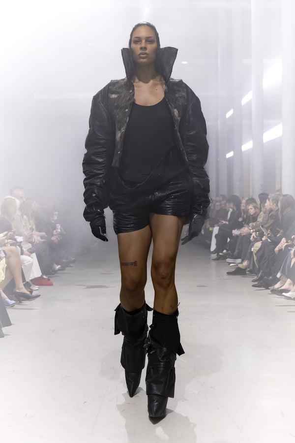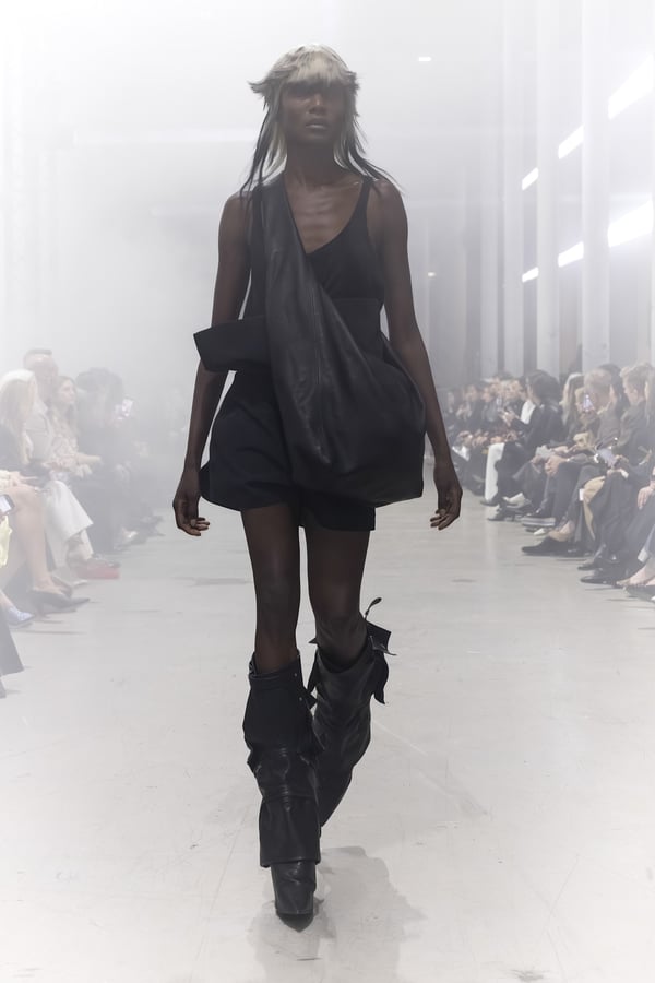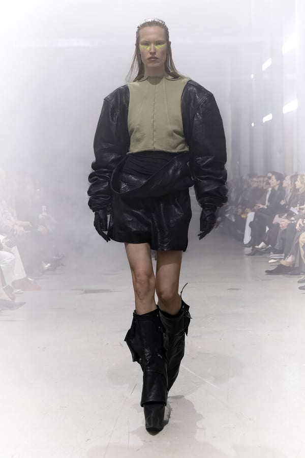 冒頭に披露されたベアトップのドレスは、光沢のあるブルレザーやボイルドウール、スチールの5倍の強度を持つケブラー繊維といった素材のバリエーションを展開した。クロップド丈のジャケットは、同素材のロングベストとレイヤードすることで「タワー」のようなシルエットをつくる。素材には、トスカーナ産の牛革、やわらかなアルパカ、ボイルドウールを使用。山羊革を繋ぎ合わせたルックは、俳優で歌手のマレーネ?ディートリヒ(Marlene Dietrich)が晩年のキャバレー時代に着用していたスワンズダウン(白鳥の羽毛)コートを建築的に解釈して表現した。リック?オウエンスは「彼女の、道徳心と人工美が混ざり合った魅力、そして強い責任感と気概にいつも心を打たれるのです」と説明している。メンズコレクションと同様に、ハンドクロシェのニットトップスやマクラメのドレス、タフティングジャケットといったロンドンやパリのローカルクリエイターとのコラボレーションによるハンドメイドのテクニックを用いたアイテムも登場した。差し色となったヴィヴィッドな色彩のヘア&メイクは、ベルリンを拠点とするデジタルクリエイターのFIGA.LINKが手掛けた。