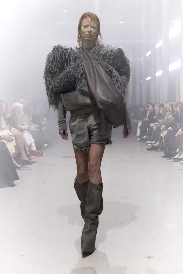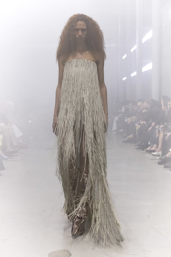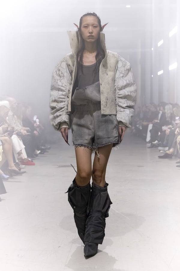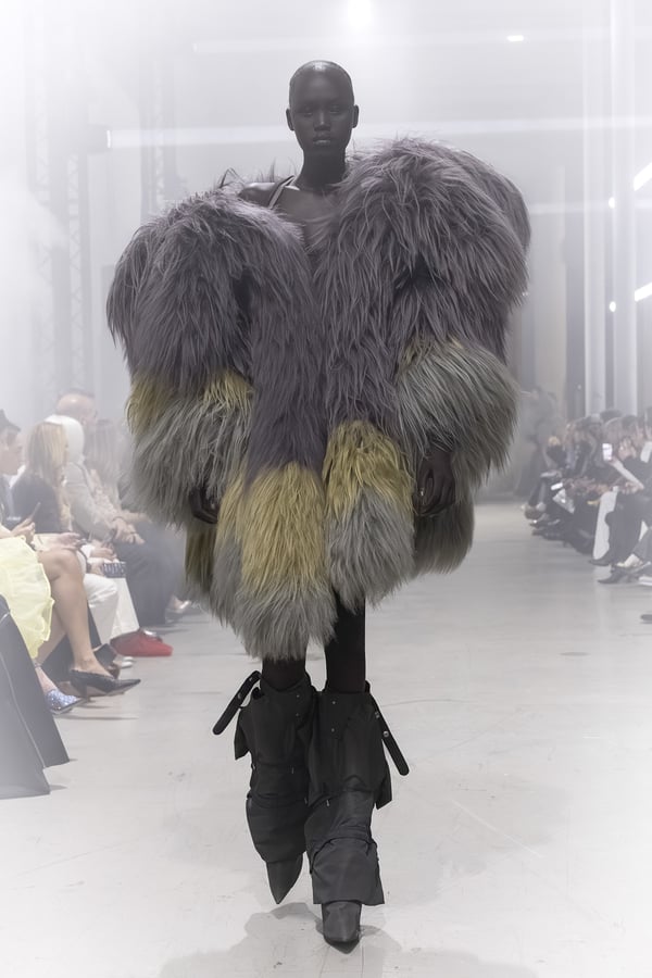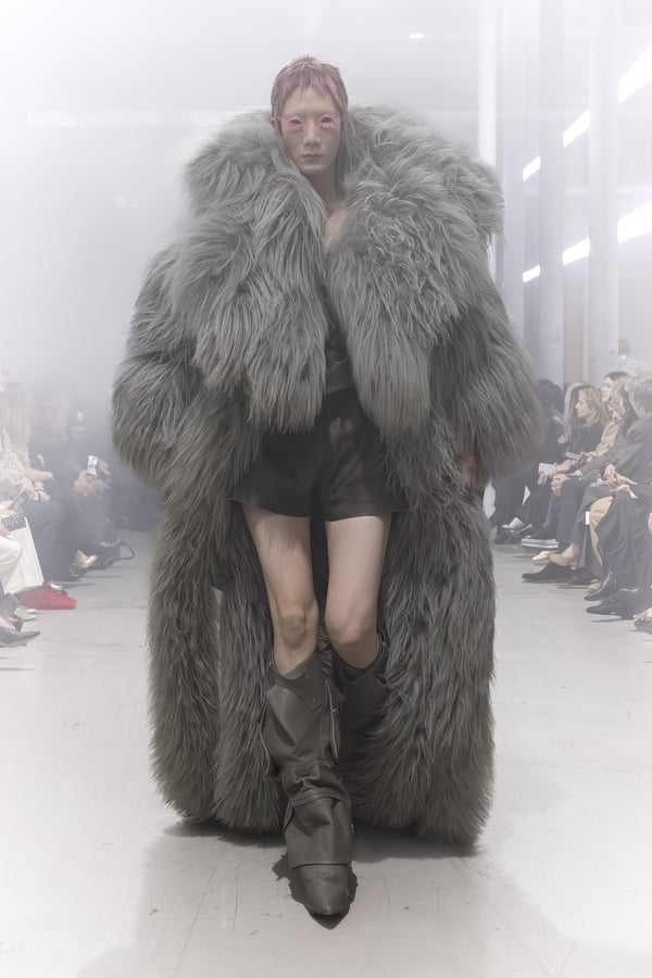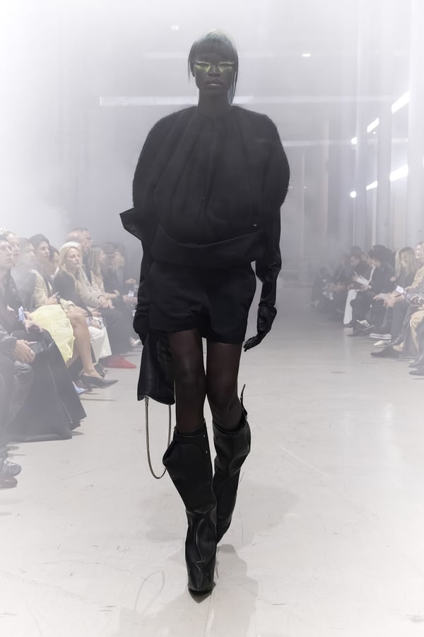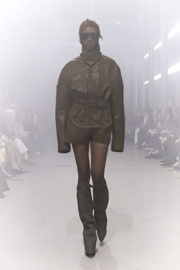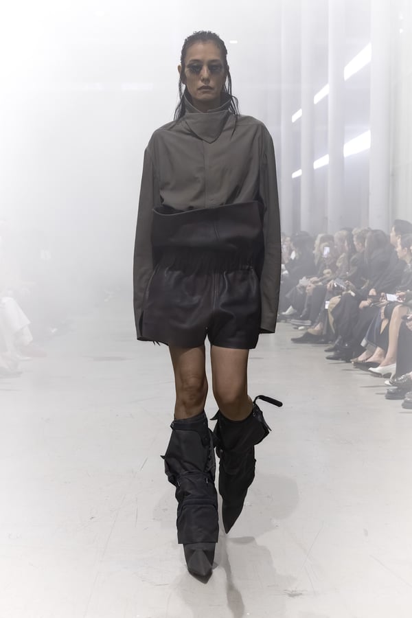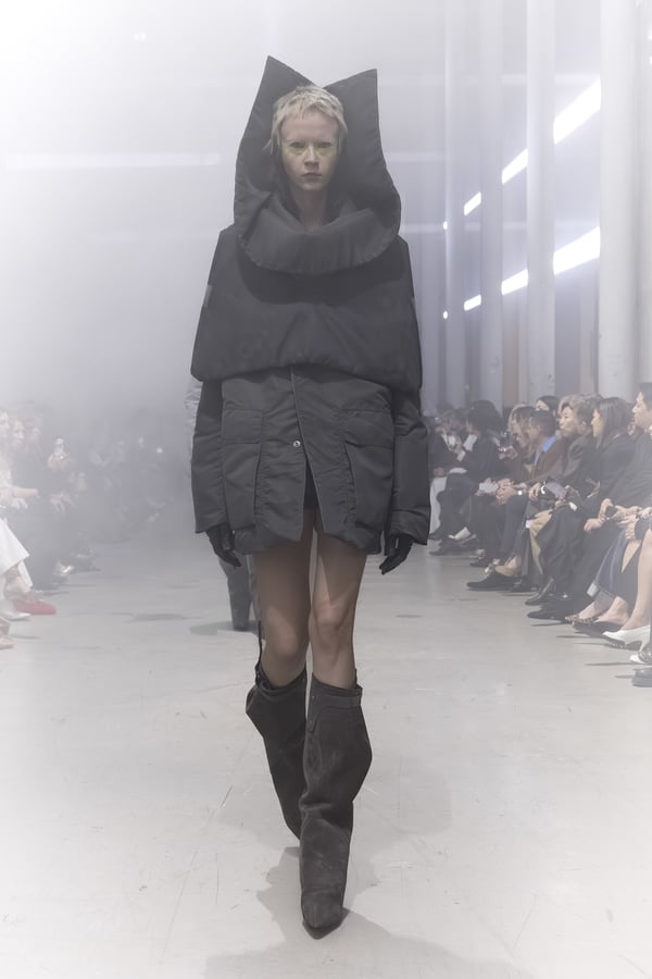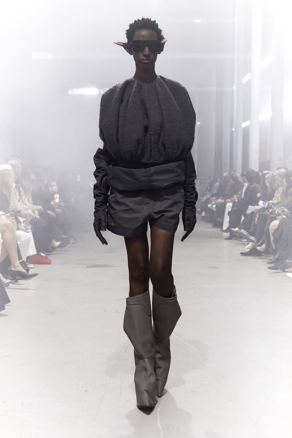 冒頭に披露されたベアトップのドレスは、光沢のあるブルレザーやボイルドウール、スチールの5倍の強度を持つケブラー繊維といった素材のバリエーションを展開した。クロップド丈のジャケットは、同素材のロングベストとレイヤードすることで「タワー」のようなシルエットをつくる。素材には、トスカーナ産の牛革、やわらかなアルパカ、ボイルドウールを使用。山羊革を繋ぎ合わせたルックは、俳優で歌手のマレーネ?ディートリヒ(Marlene Dietrich)が晩年のキャバレー時代に着用していたスワンズダウン(白鳥の羽毛)コートを建築的に解釈して表現した。リック?オウエンスは「彼女の、道徳心と人工美が混ざり合った魅力、そして強い責任感と気概にいつも心を打たれるのです」と説明している。メンズコレクションと同様に、ハンドクロシェのニットトップスやマクラメのドレス、タフティングジャケットといったロンドンやパリのローカルクリエイターとのコラボレーションによるハンドメイドのテクニックを用いたアイテムも登場した。差し色となったヴィヴィッドな色彩のヘア&メイクは、ベルリンを拠点とするデジタルクリエイターのFIGA.LINKが手掛けた。