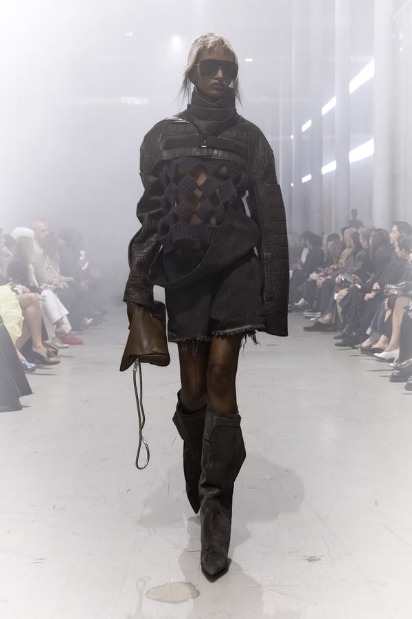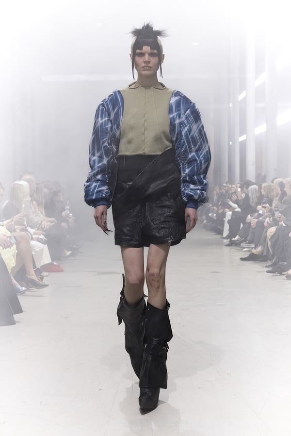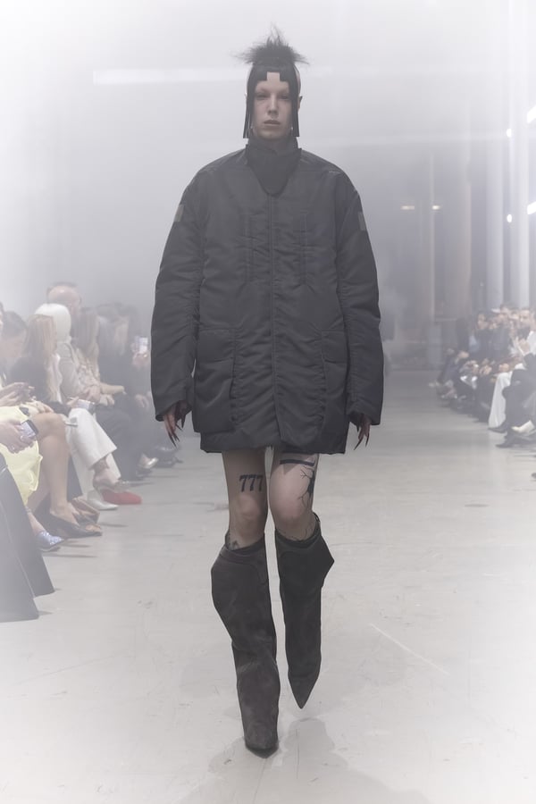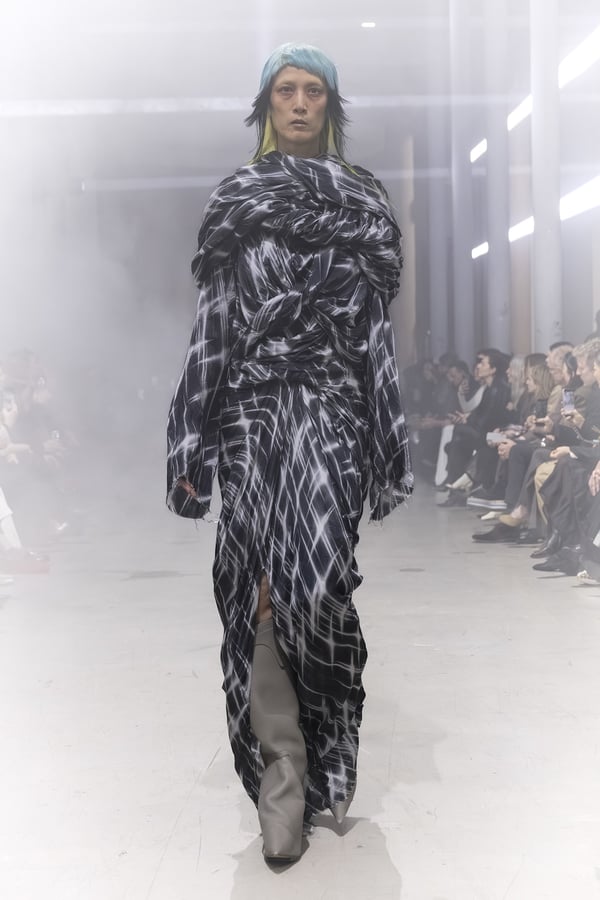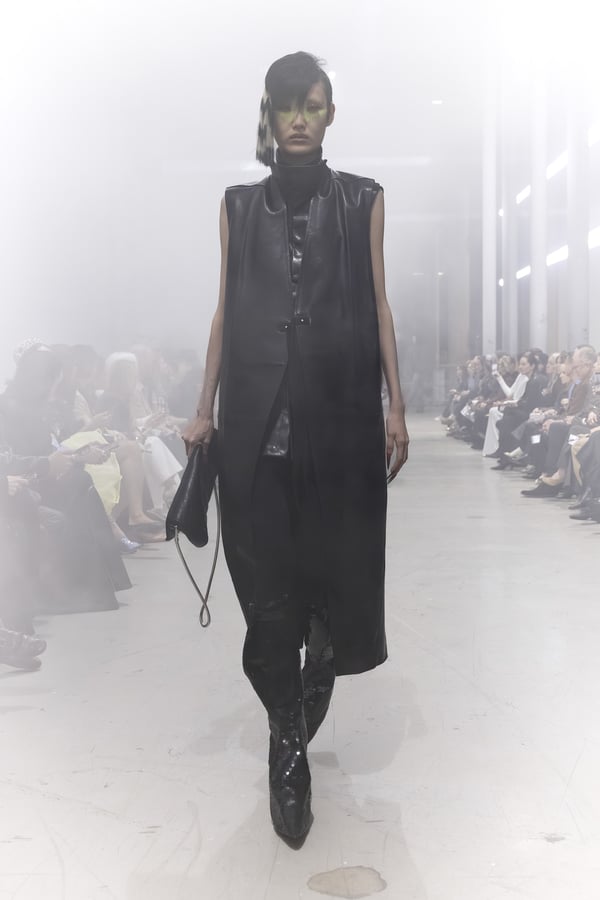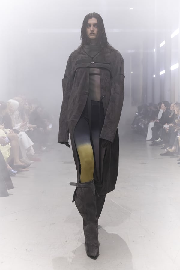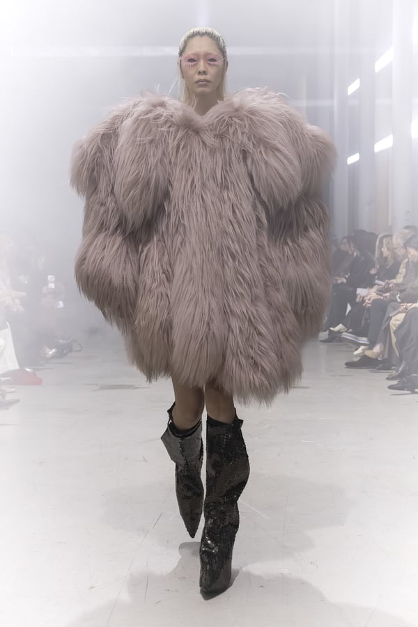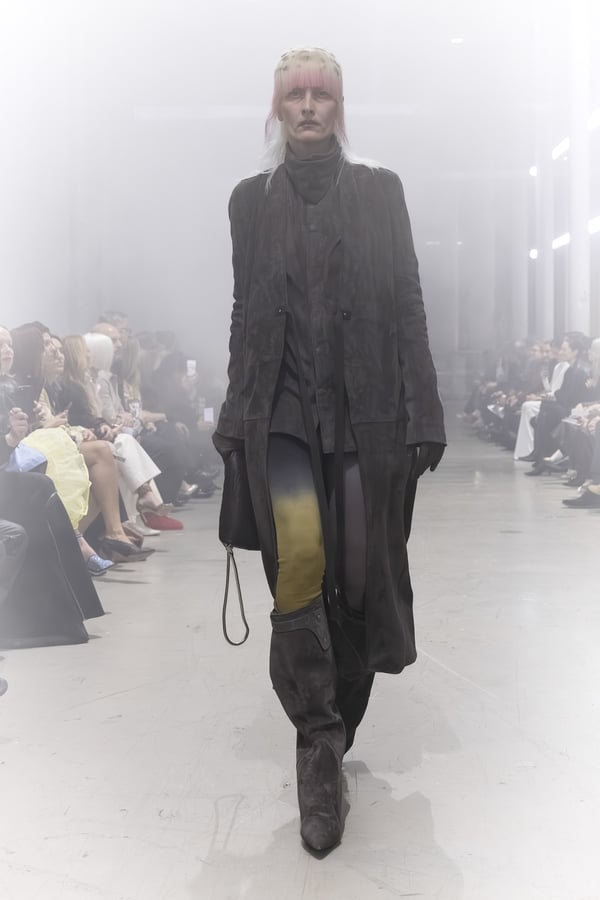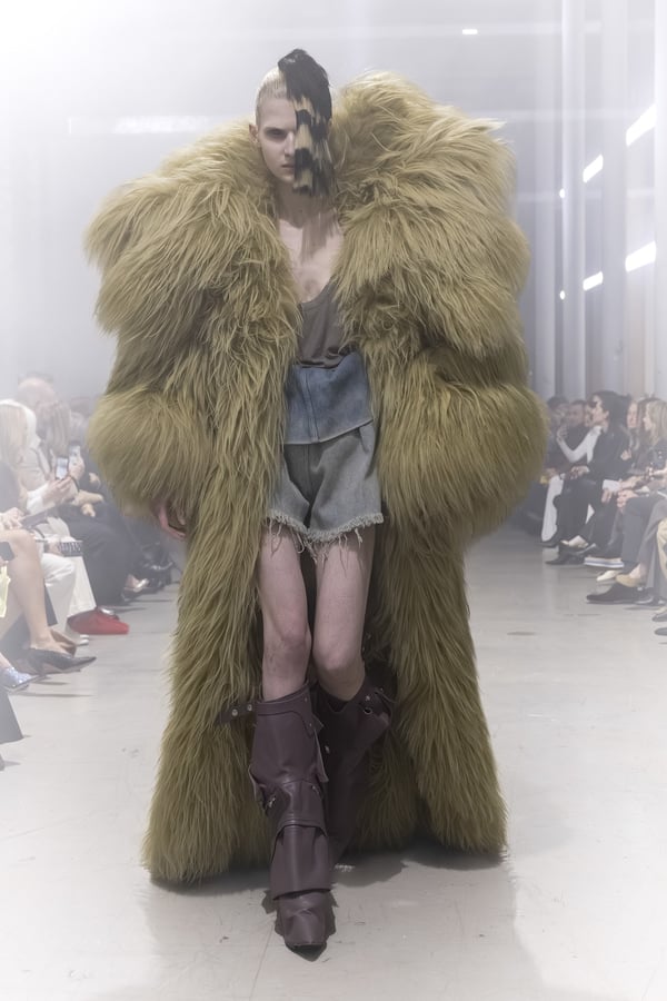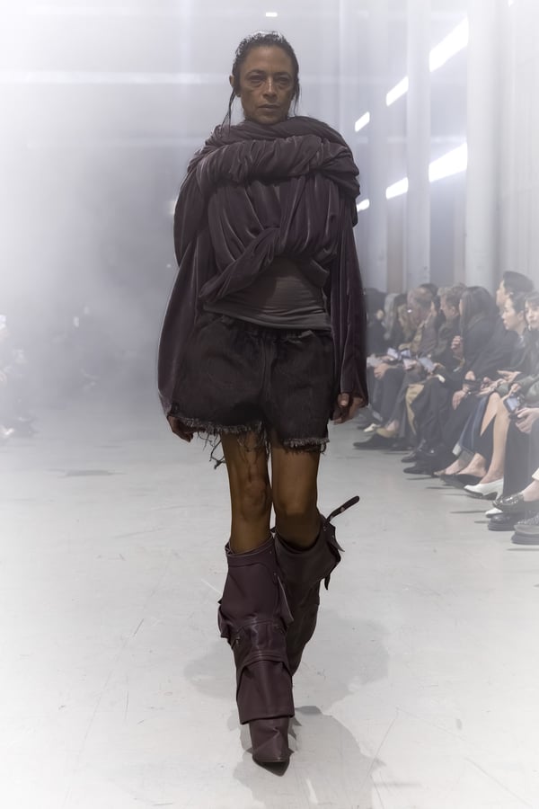 冒頭に披露されたベアトップのドレスは、光沢のあるブルレザーやボイルドウール、スチールの5倍の強度を持つケブラー繊維といった素材のバリエーションを展開した。クロップド丈のジャケットは、同素材のロングベストとレイヤードすることで「タワー」のようなシルエットをつくる。素材には、トスカーナ産の牛革、やわらかなアルパカ、ボイルドウールを使用。山羊革を繋ぎ合わせたルックは、俳優で歌手のマレーネ?ディートリヒ(Marlene Dietrich)が晩年のキャバレー時代に着用していたスワンズダウン(白鳥の羽毛)コートを建築的に解釈して表現した。リック?オウエンスは「彼女の、道徳心と人工美が混ざり合った魅力、そして強い責任感と気概にいつも心を打たれるのです」と説明している。メンズコレクションと同様に、ハンドクロシェのニットトップスやマクラメのドレス、タフティングジャケットといったロンドンやパリのローカルクリエイターとのコラボレーションによるハンドメイドのテクニックを用いたアイテムも登場した。差し色となったヴィヴィッドな色彩のヘア&メイクは、ベルリンを拠点とするデジタルクリエイターのFIGA.LINKが手掛けた。
