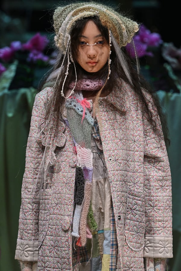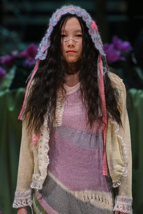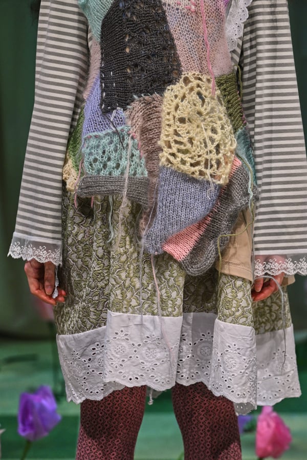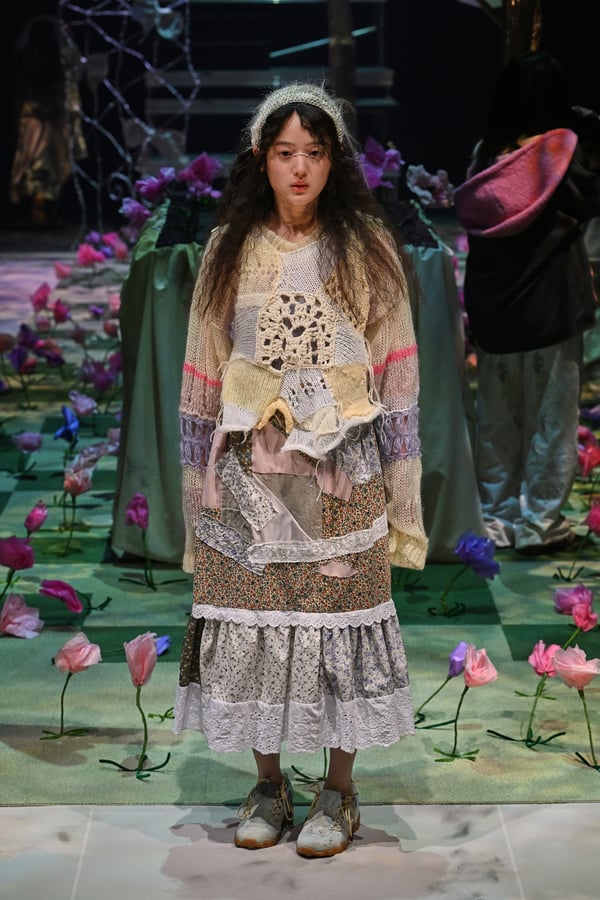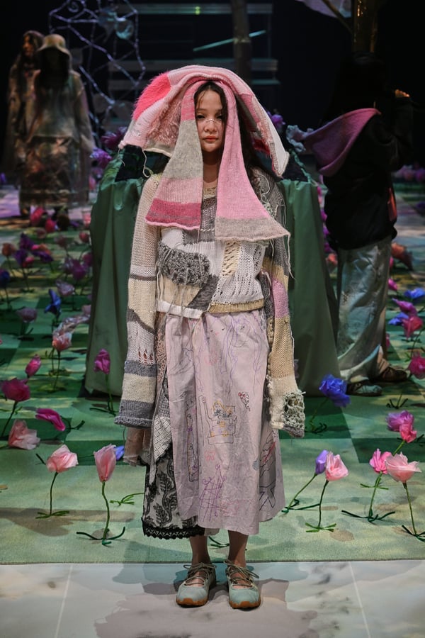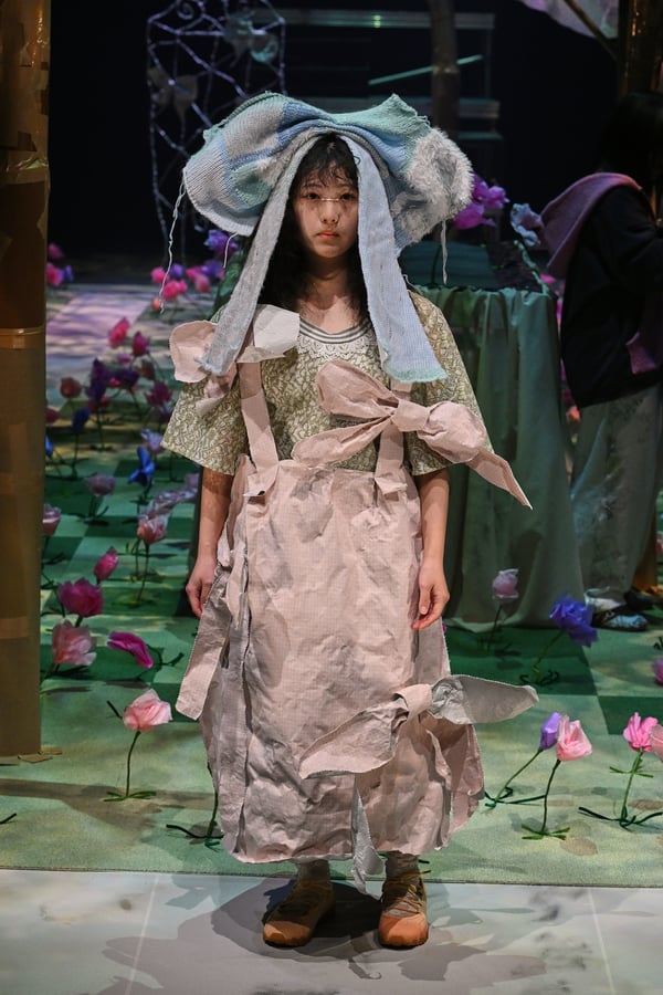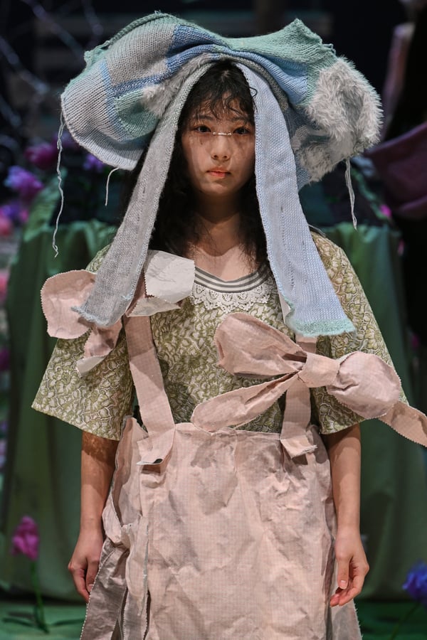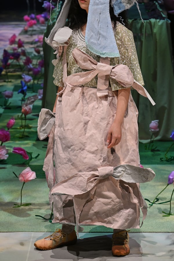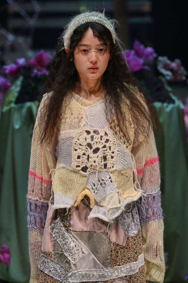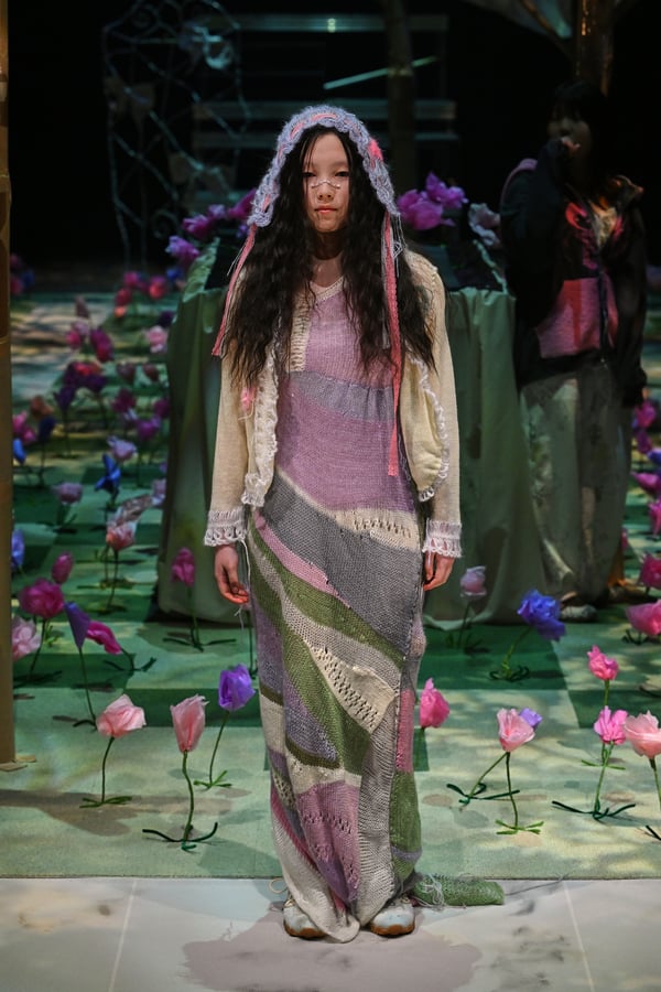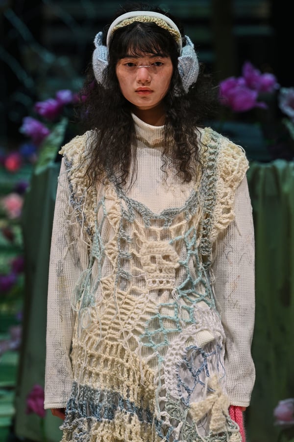 コレクションでは、ブランドのシグネチャーであるハンドニットやパッチワークを巧みに用いて、「誰かの記憶の中の家」を思わせる温かみのある空間を表現。カーテンを縫い合わせたスカートやワンピースからは、生活の気配や日常の記憶がにじみ出ていた。コレクションの随所に散りばめたどこか退廃的な印象のリボンは、可愛らしさと同時に脆さや儚さを想起させるモチーフとして機能。頭を覆い隠すほど大きなヘッドピースは、「キジマ タカユキ(KIJIMA TAKAYUKI)」とコラボレーションし製作した。