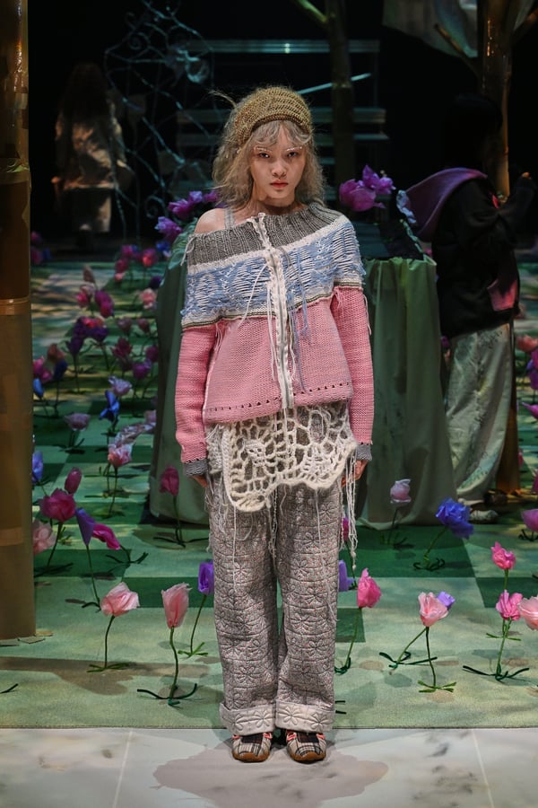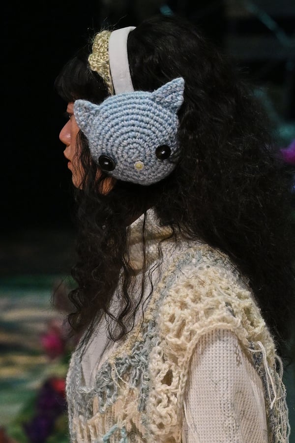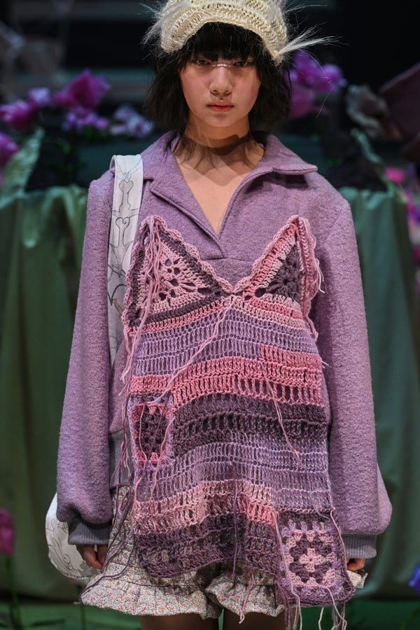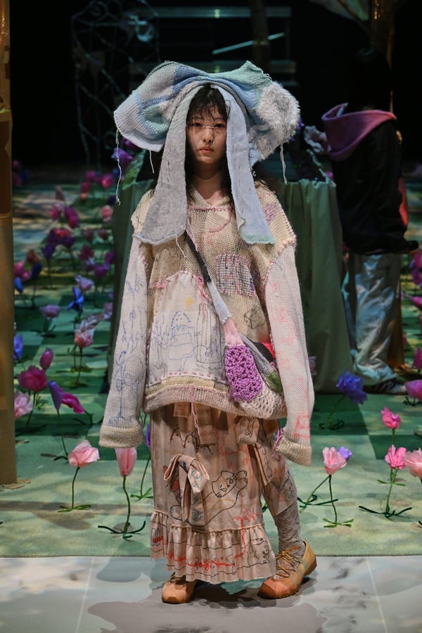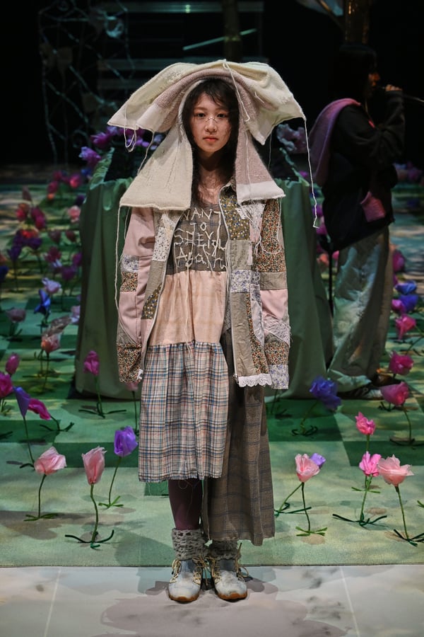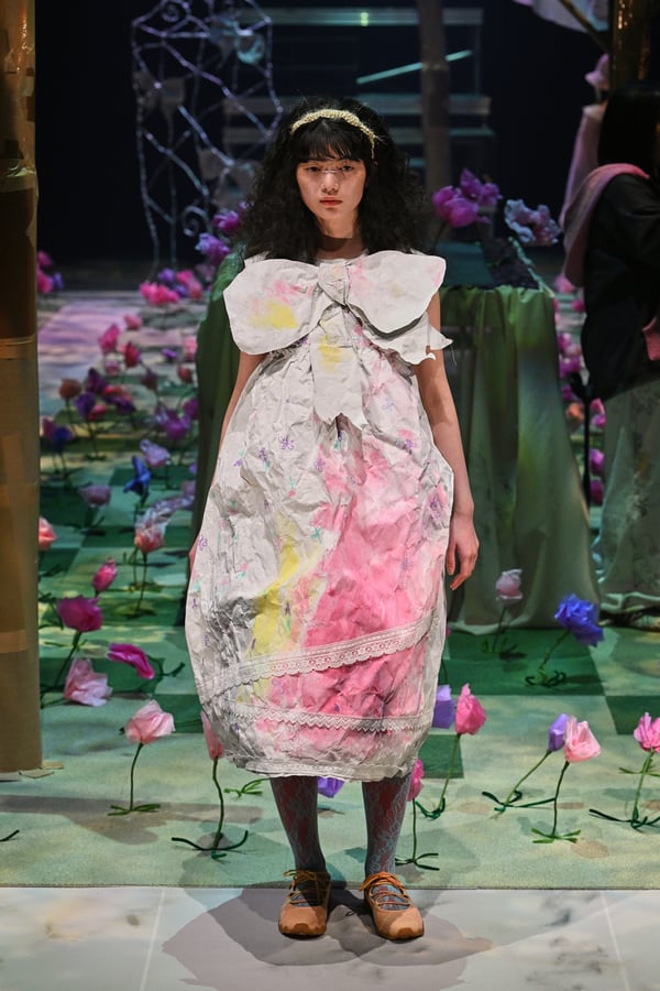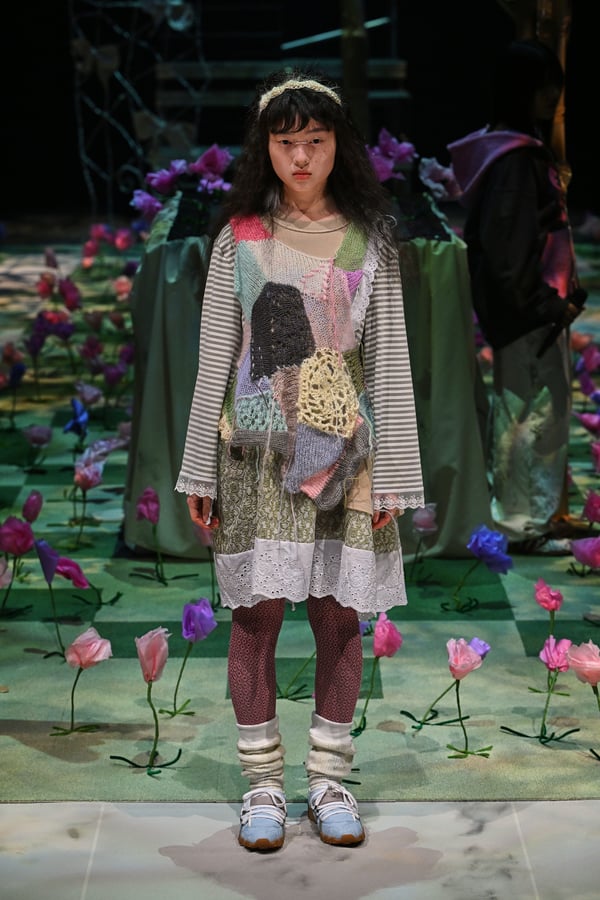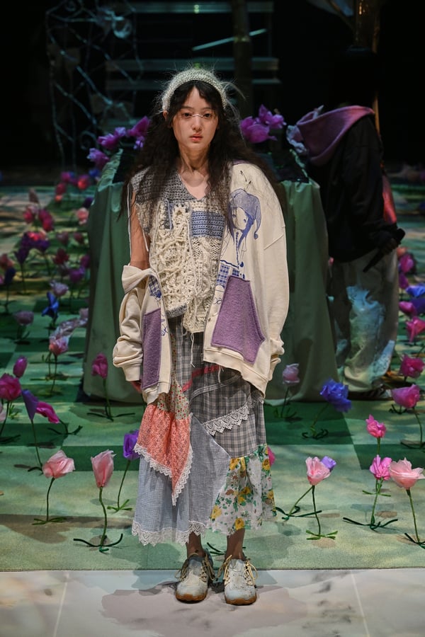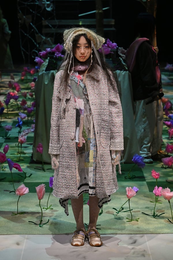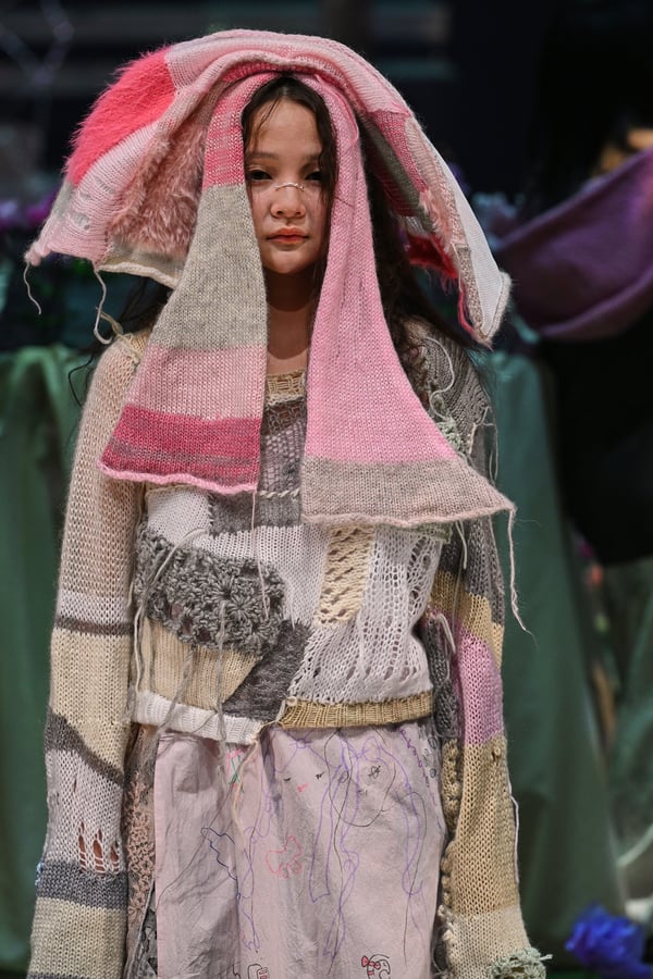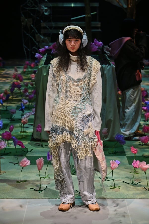 コレクションでは、ブランドのシグネチャーであるハンドニットやパッチワークを巧みに用いて、「誰かの記憶の中の家」を思わせる温かみのある空間を表現。カーテンを縫い合わせたスカートやワンピースからは、生活の気配や日常の記憶がにじみ出ていた。コレクションの随所に散りばめたどこか退廃的な印象のリボンは、可愛らしさと同時に脆さや儚さを想起させるモチーフとして機能。頭を覆い隠すほど大きなヘッドピースは、「キジマ タカユキ(KIJIMA TAKAYUKI)」とコラボレーションし製作した。