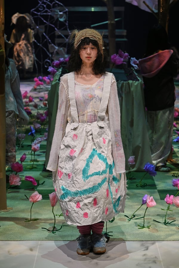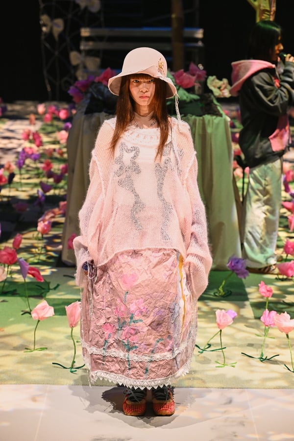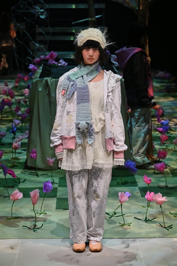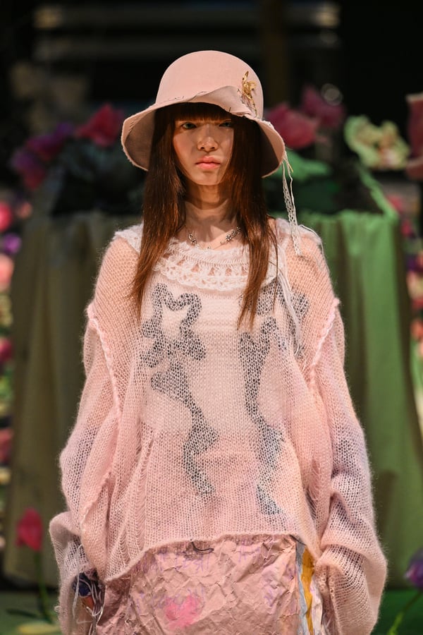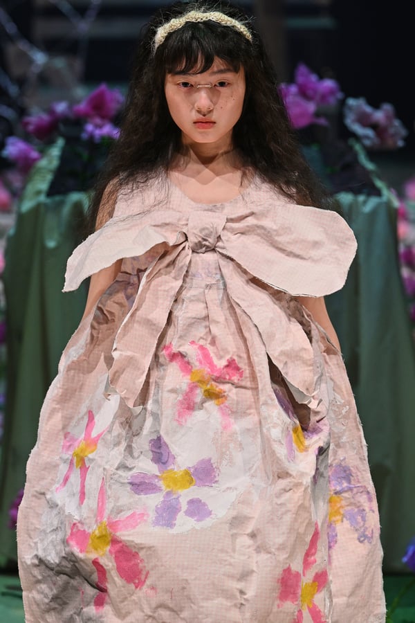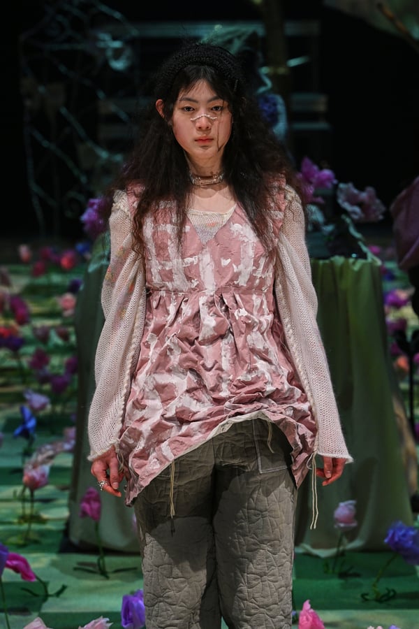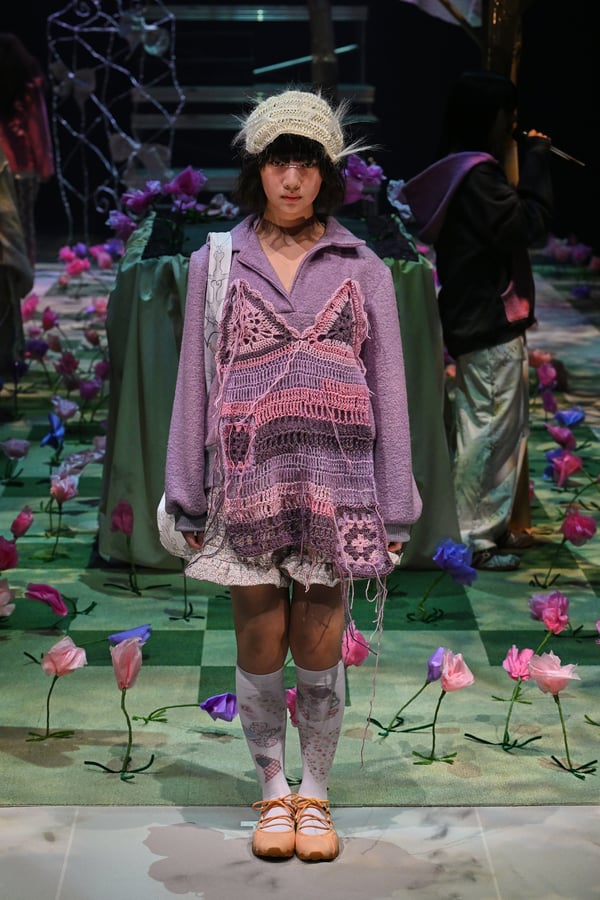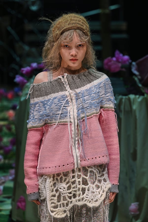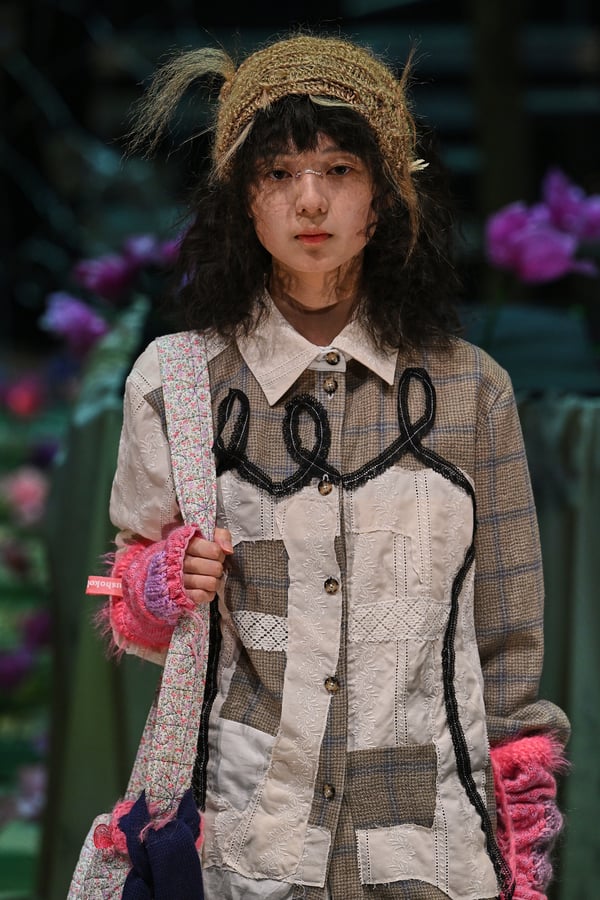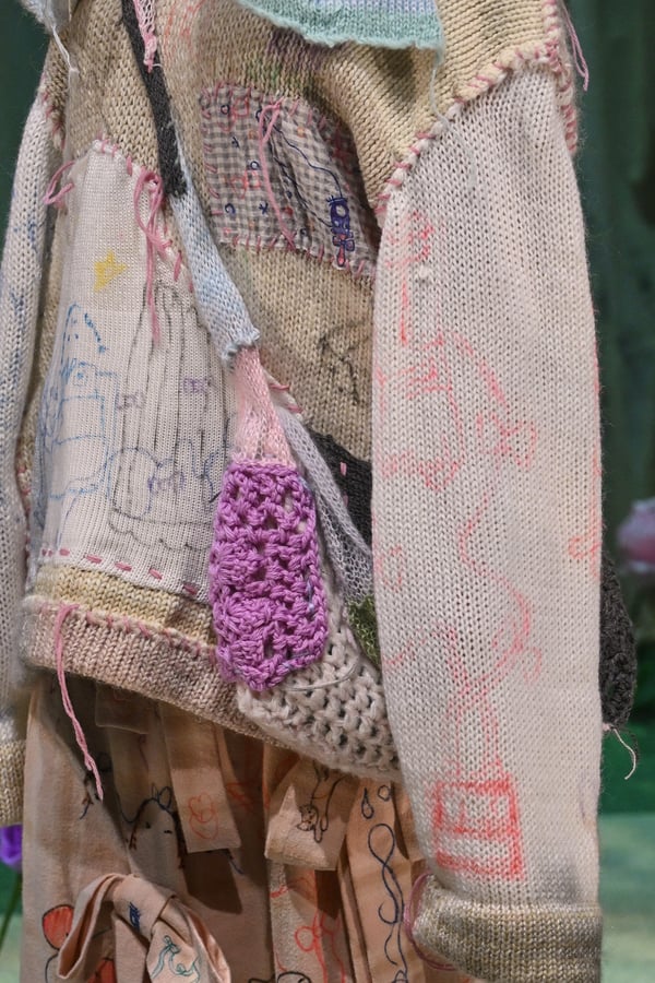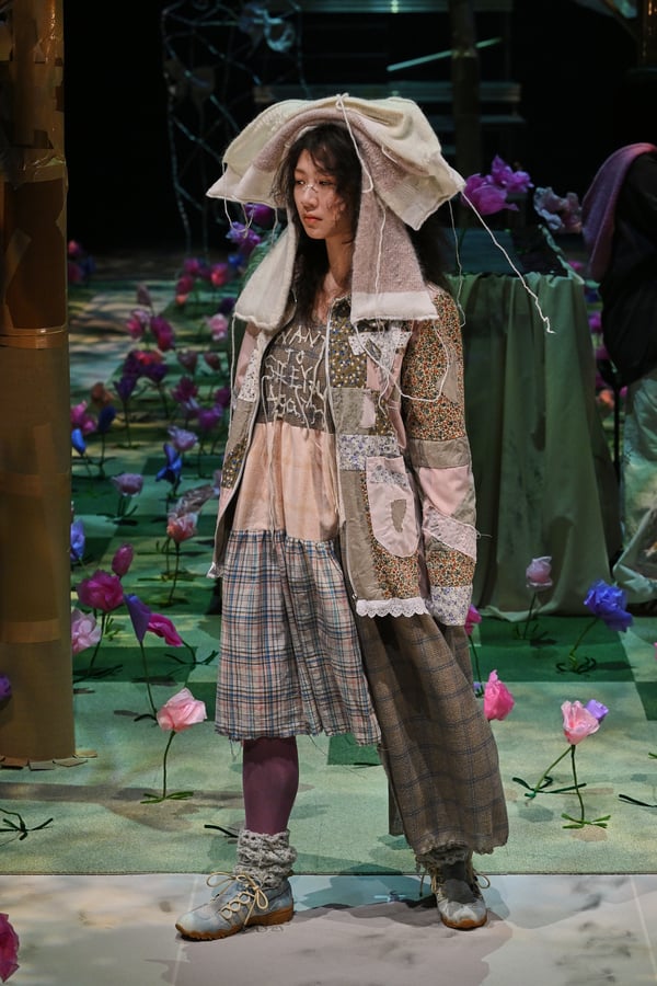 コレクションでは、ブランドのシグネチャーであるハンドニットやパッチワークを巧みに用いて、「誰かの記憶の中の家」を思わせる温かみのある空間を表現。カーテンを縫い合わせたスカートやワンピースからは、生活の気配や日常の記憶がにじみ出ていた。コレクションの随所に散りばめたどこか退廃的な印象のリボンは、可愛らしさと同時に脆さや儚さを想起させるモチーフとして機能。頭を覆い隠すほど大きなヘッドピースは、「キジマ タカユキ(KIJIMA TAKAYUKI)」とコラボレーションし製作した。