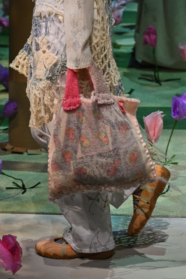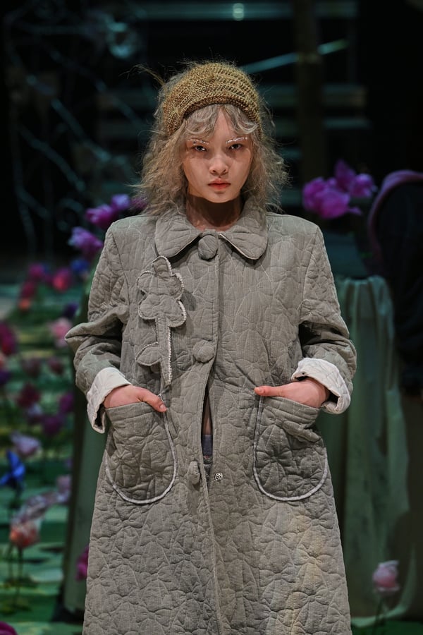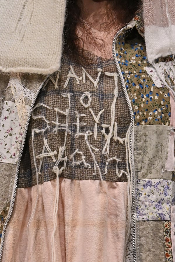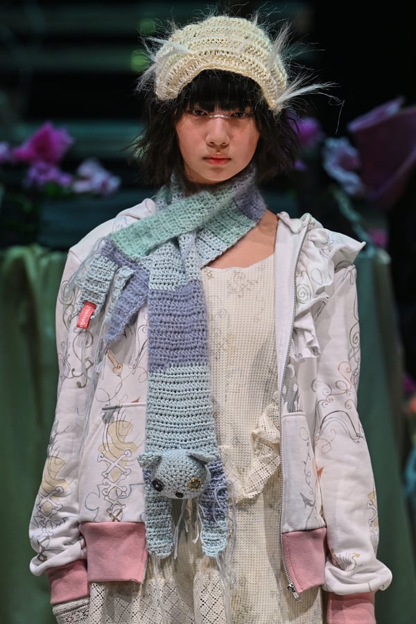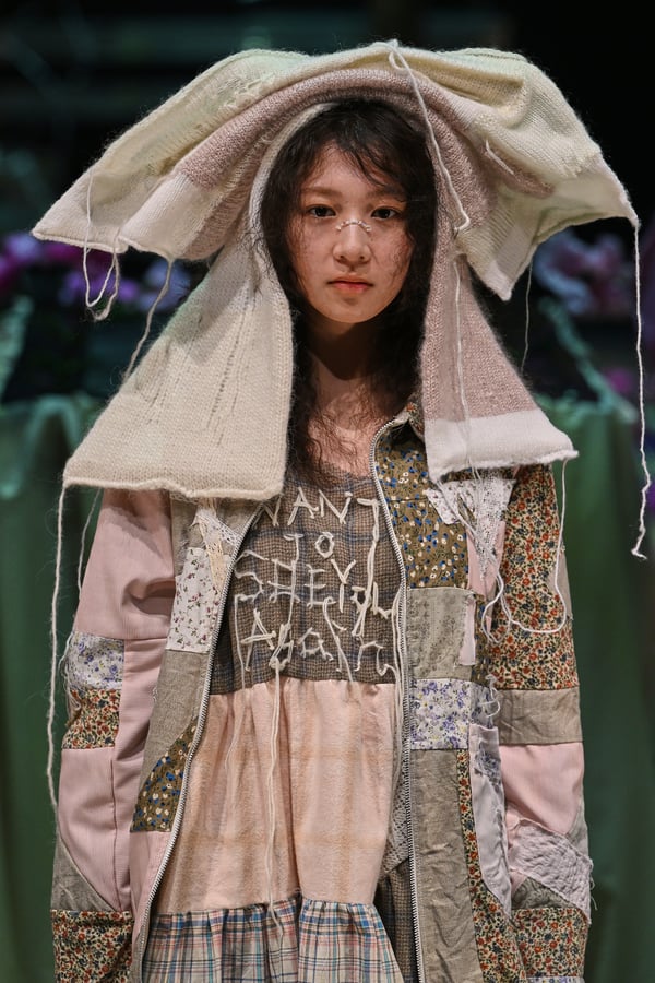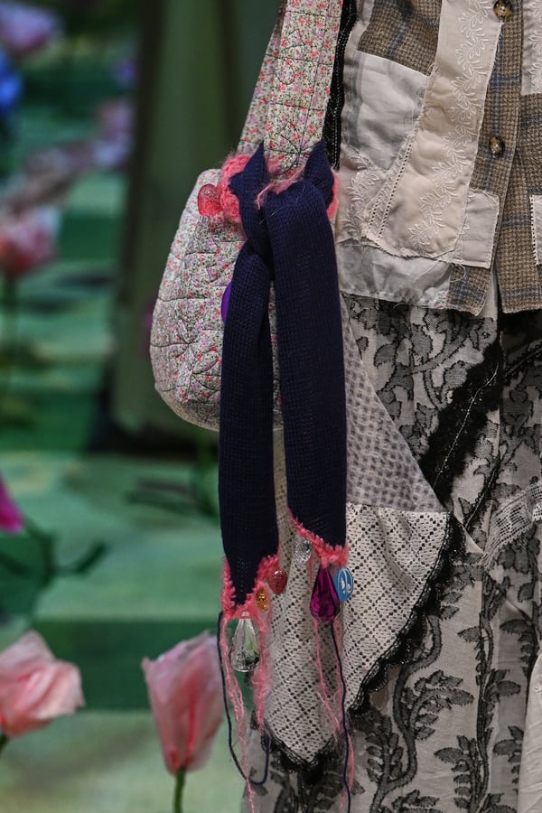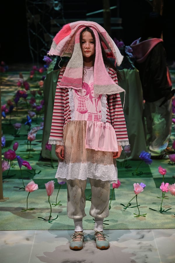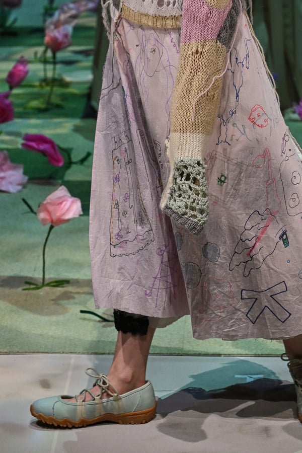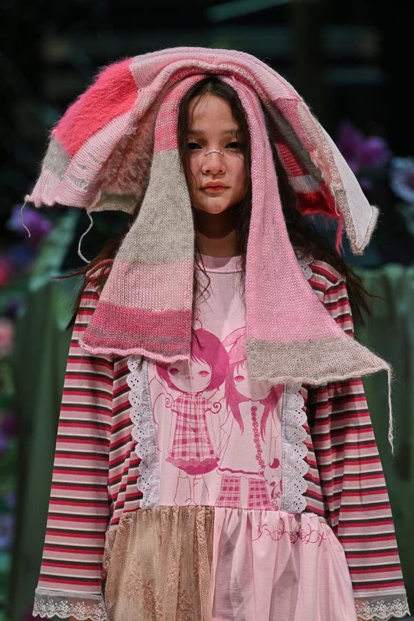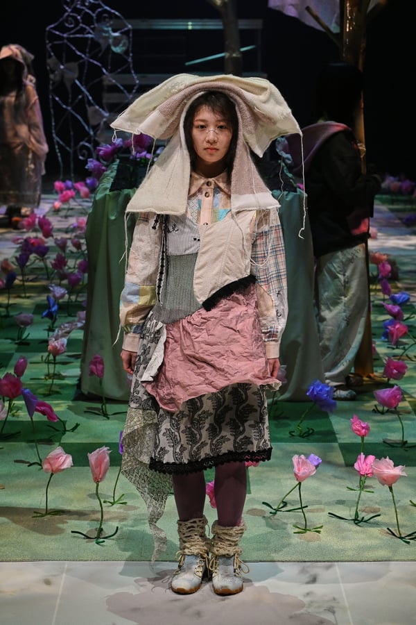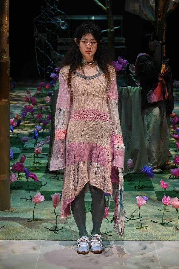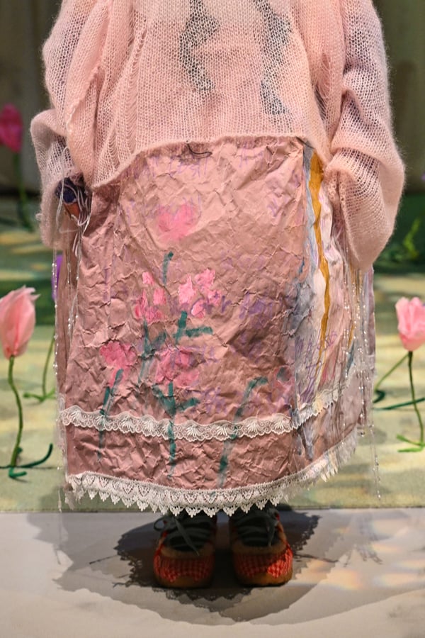 コレクションでは、ブランドのシグネチャーであるハンドニットやパッチワークを巧みに用いて、「誰かの記憶の中の家」を思わせる温かみのある空間を表現。カーテンを縫い合わせたスカートやワンピースからは、生活の気配や日常の記憶がにじみ出ていた。コレクションの随所に散りばめたどこか退廃的な印象のリボンは、可愛らしさと同時に脆さや儚さを想起させるモチーフとして機能。頭を覆い隠すほど大きなヘッドピースは、「キジマ タカユキ(KIJIMA TAKAYUKI)」とコラボレーションし製作した。