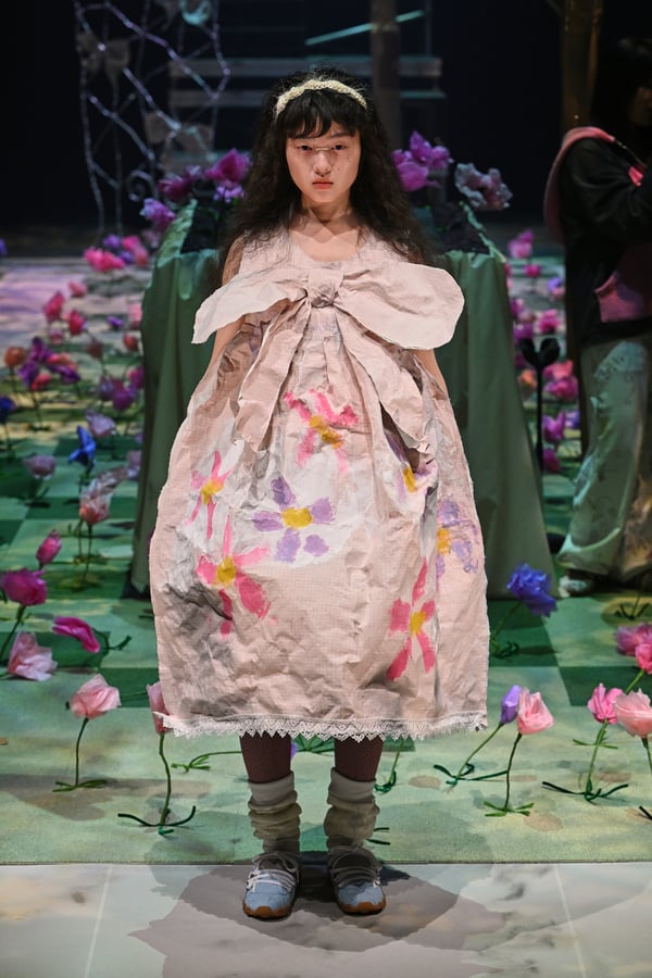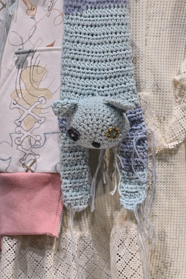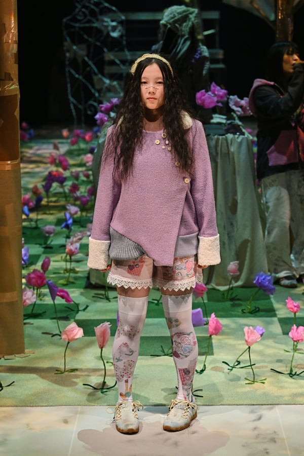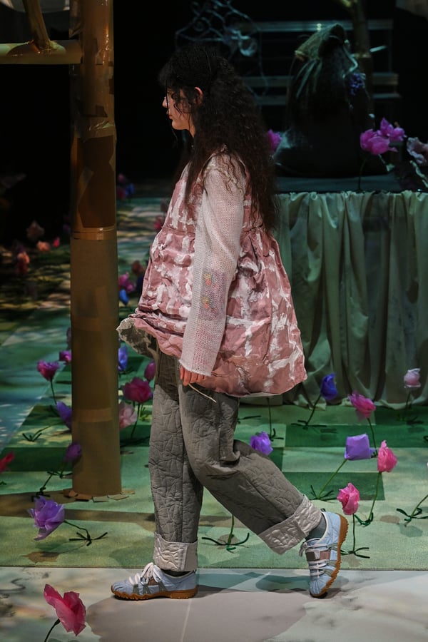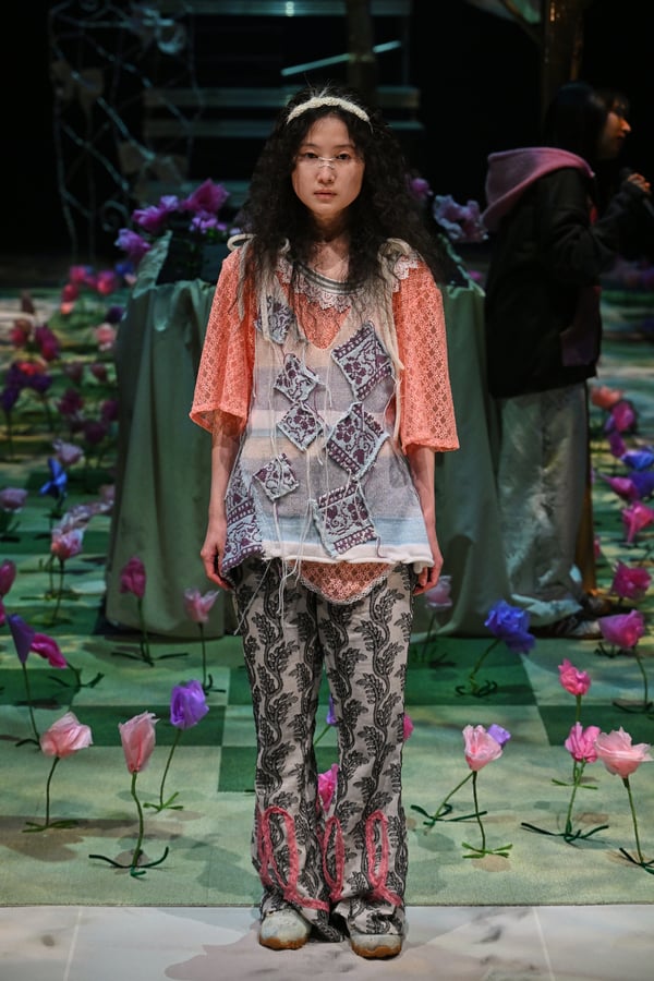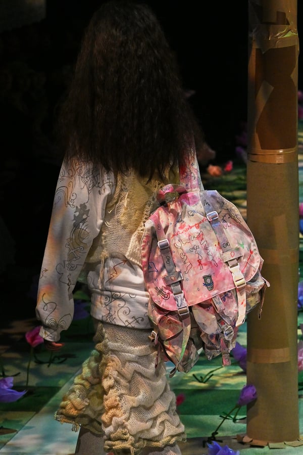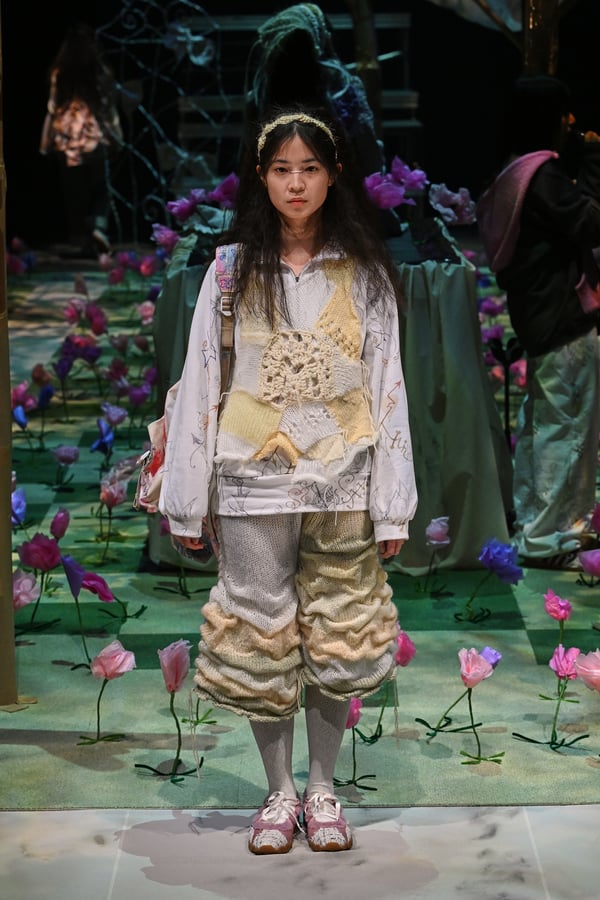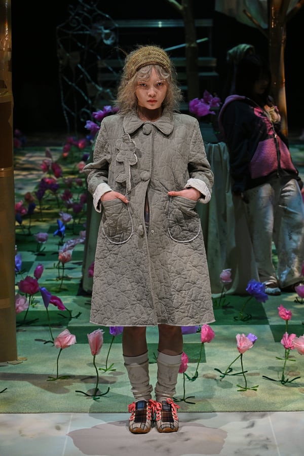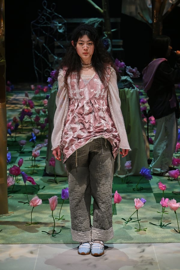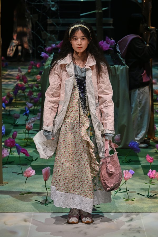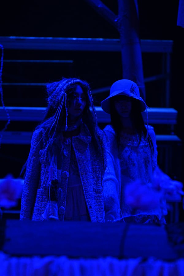 コレクションでは、ブランドのシグネチャーであるハンドニットやパッチワークを巧みに用いて、「誰かの記憶の中の家」を思わせる温かみのある空間を表現。カーテンを縫い合わせたスカートやワンピースからは、生活の気配や日常の記憶がにじみ出ていた。コレクションの随所に散りばめたどこか退廃的な印象のリボンは、可愛らしさと同時に脆さや儚さを想起させるモチーフとして機能。頭を覆い隠すほど大きなヘッドピースは、「キジマ タカユキ(KIJIMA TAKAYUKI)」とコラボレーションし製作した。