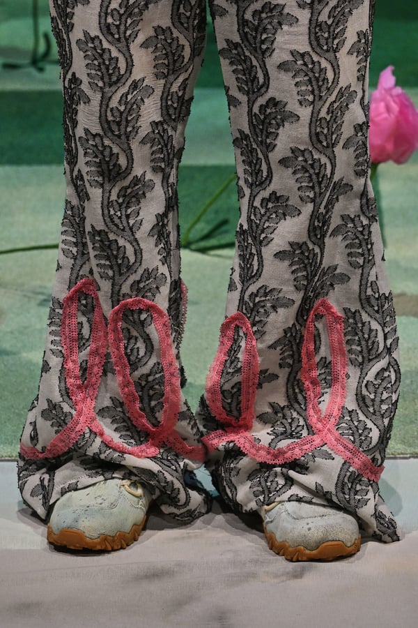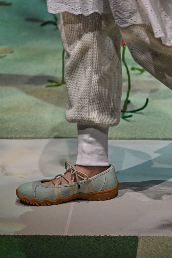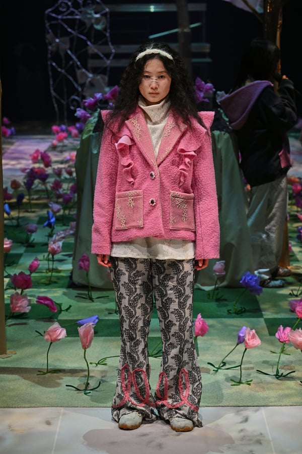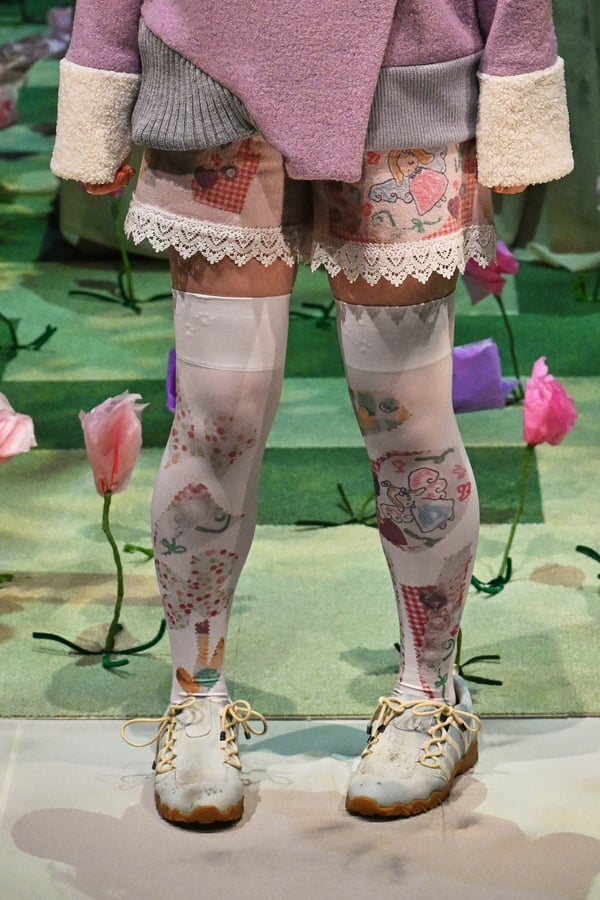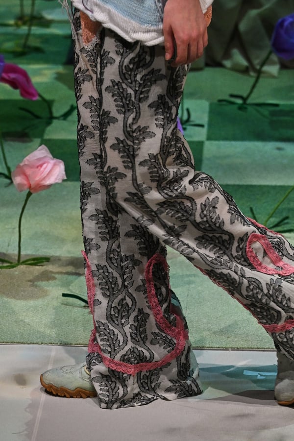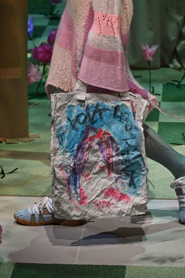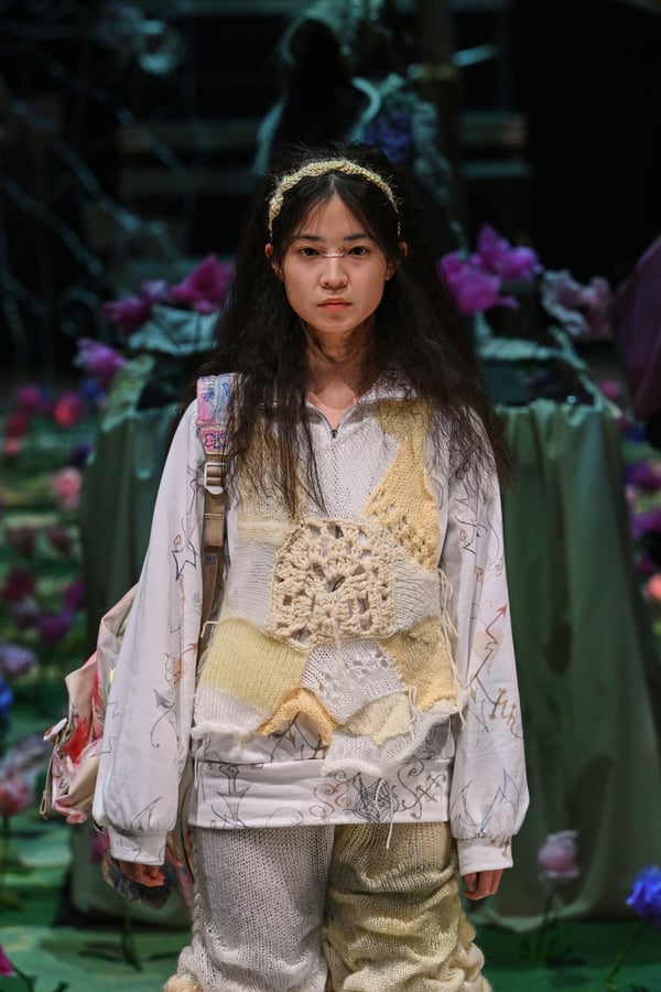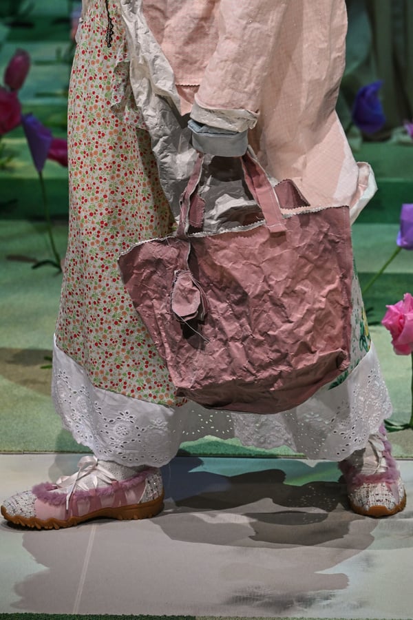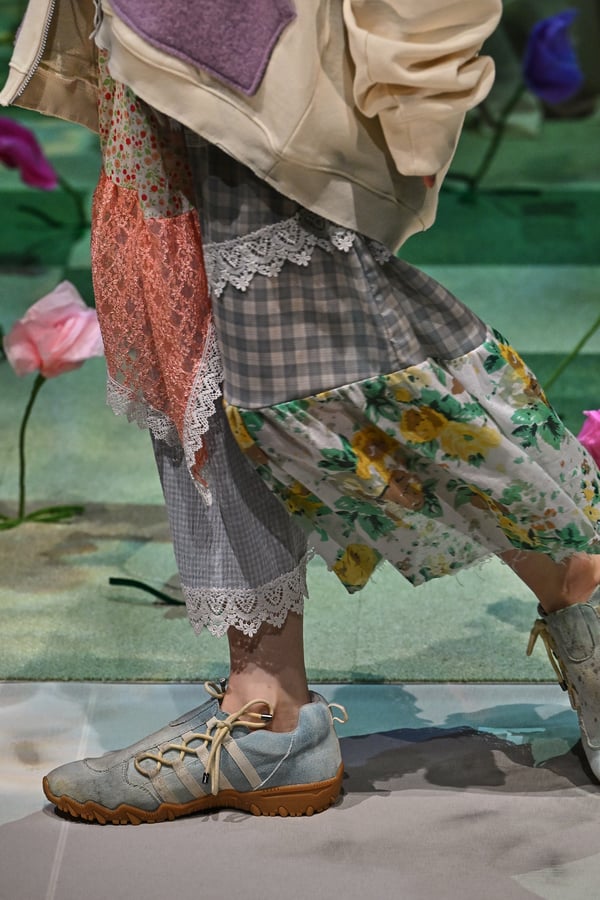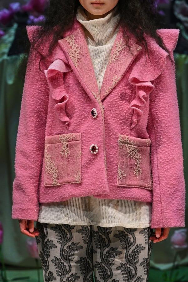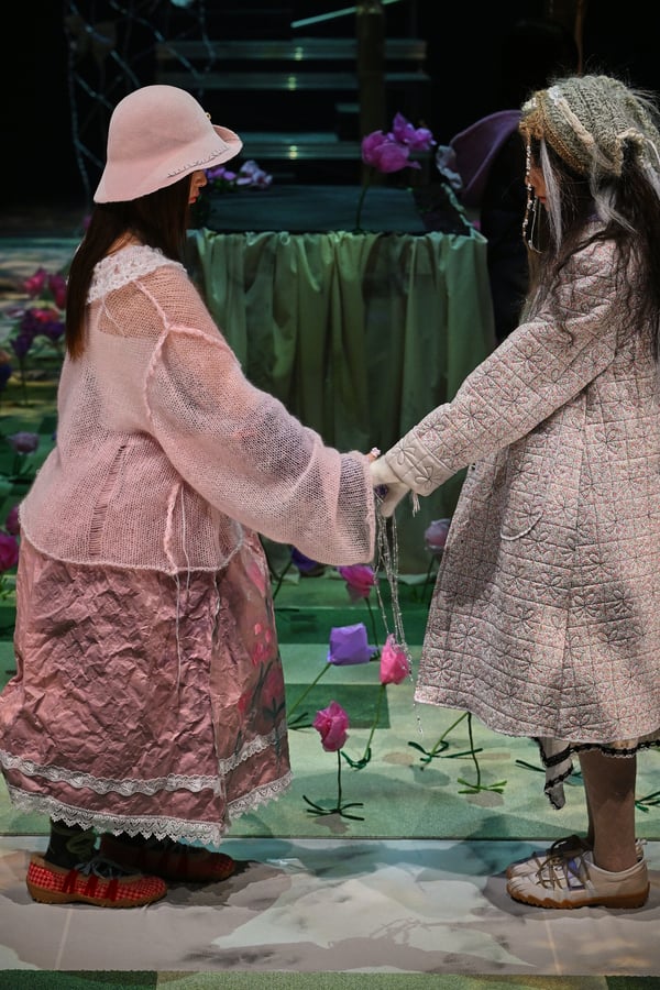 コレクションでは、ブランドのシグネチャーであるハンドニットやパッチワークを巧みに用いて、「誰かの記憶の中の家」を思わせる温かみのある空間を表現。カーテンを縫い合わせたスカートやワンピースからは、生活の気配や日常の記憶がにじみ出ていた。コレクションの随所に散りばめたどこか退廃的な印象のリボンは、可愛らしさと同時に脆さや儚さを想起させるモチーフとして機能。頭を覆い隠すほど大きなヘッドピースは、「キジマ タカユキ(KIJIMA TAKAYUKI)」とコラボレーションし製作した。