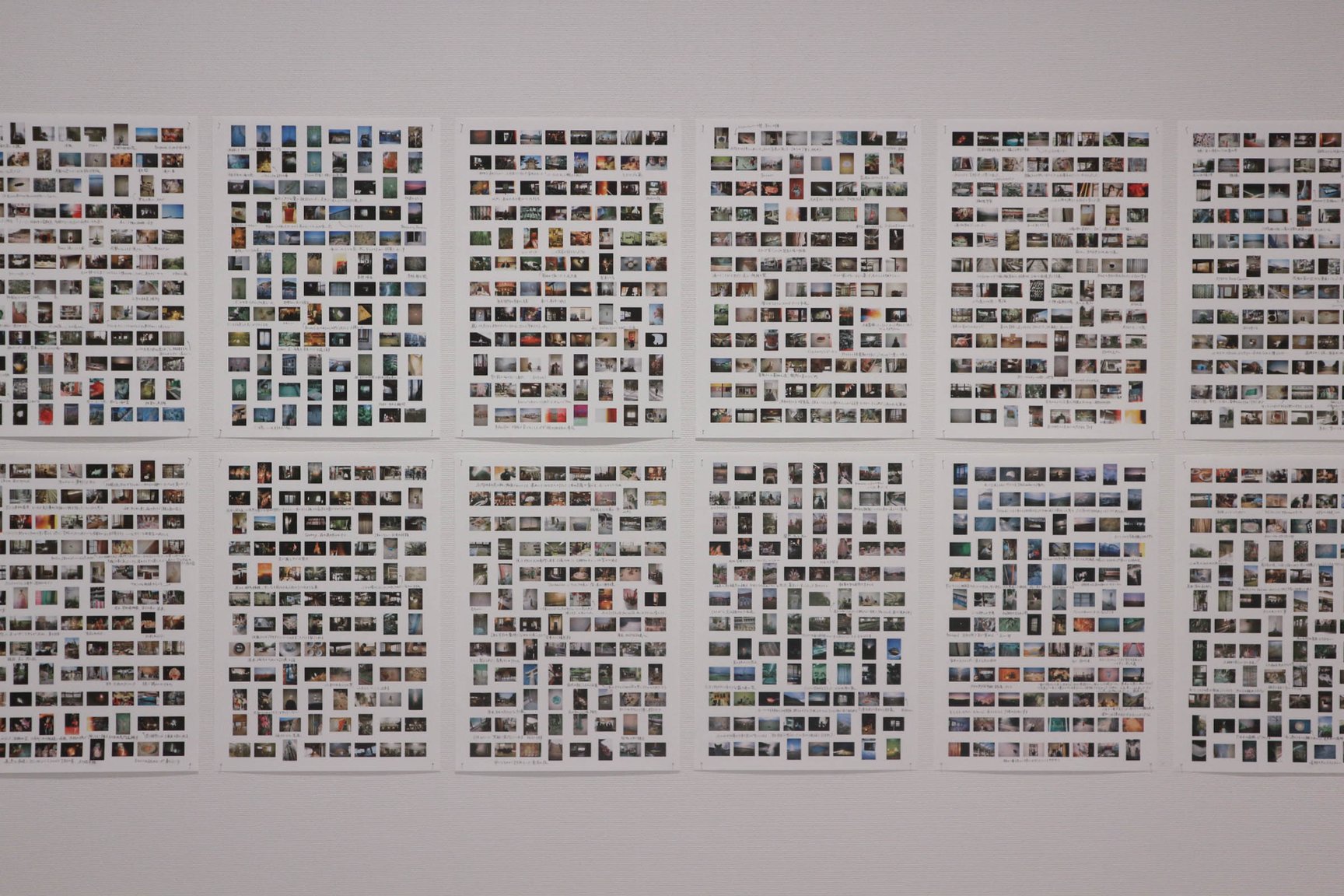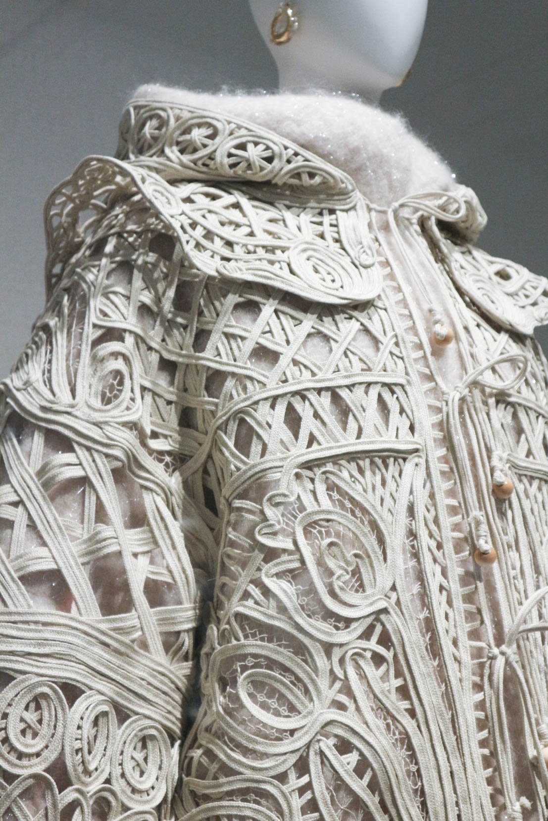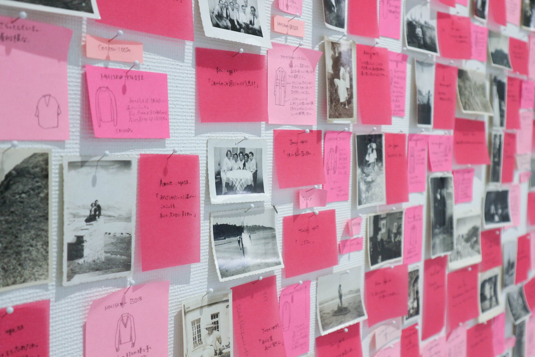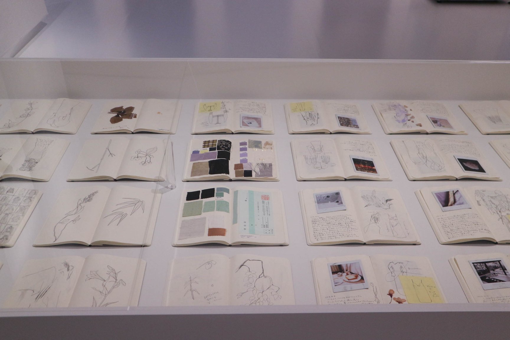 展示室3のスペースに並ぶのは、時系列ではなく「ノート」「曲線」「刺繍」「長野」「色」「クラフト」「私小説」「夢」「テクスチャー」「旅」といったブランドを構成する10の要素からキュレーションされた展示品の数々。服だけではなく、黒河内が見た映画や出会った人など何気ない日常生活での気づきや、コレクションのブレインストーミングなど、ブランド創立前から綴ってきた約20冊に及ぶ直筆のパーソナルなダイアリーから抜粋したページを覗くことができるほか、刺繍工場とのやり取りを記した図案、旅行中に撮影したスナップなど、アイデア段階から「マメ クロゴウチ」の服が出来るまでの一連のプロセスを見ることができる。