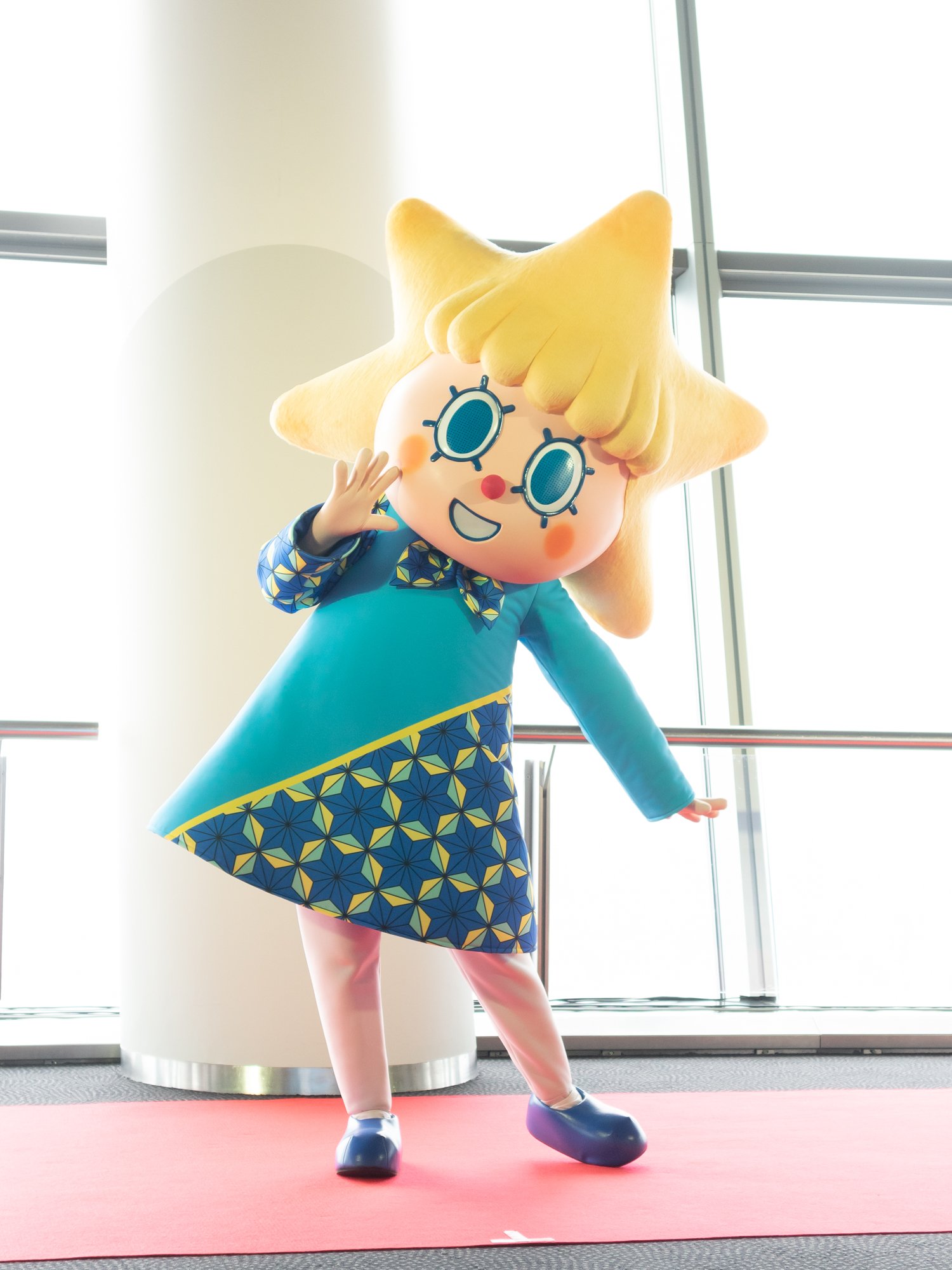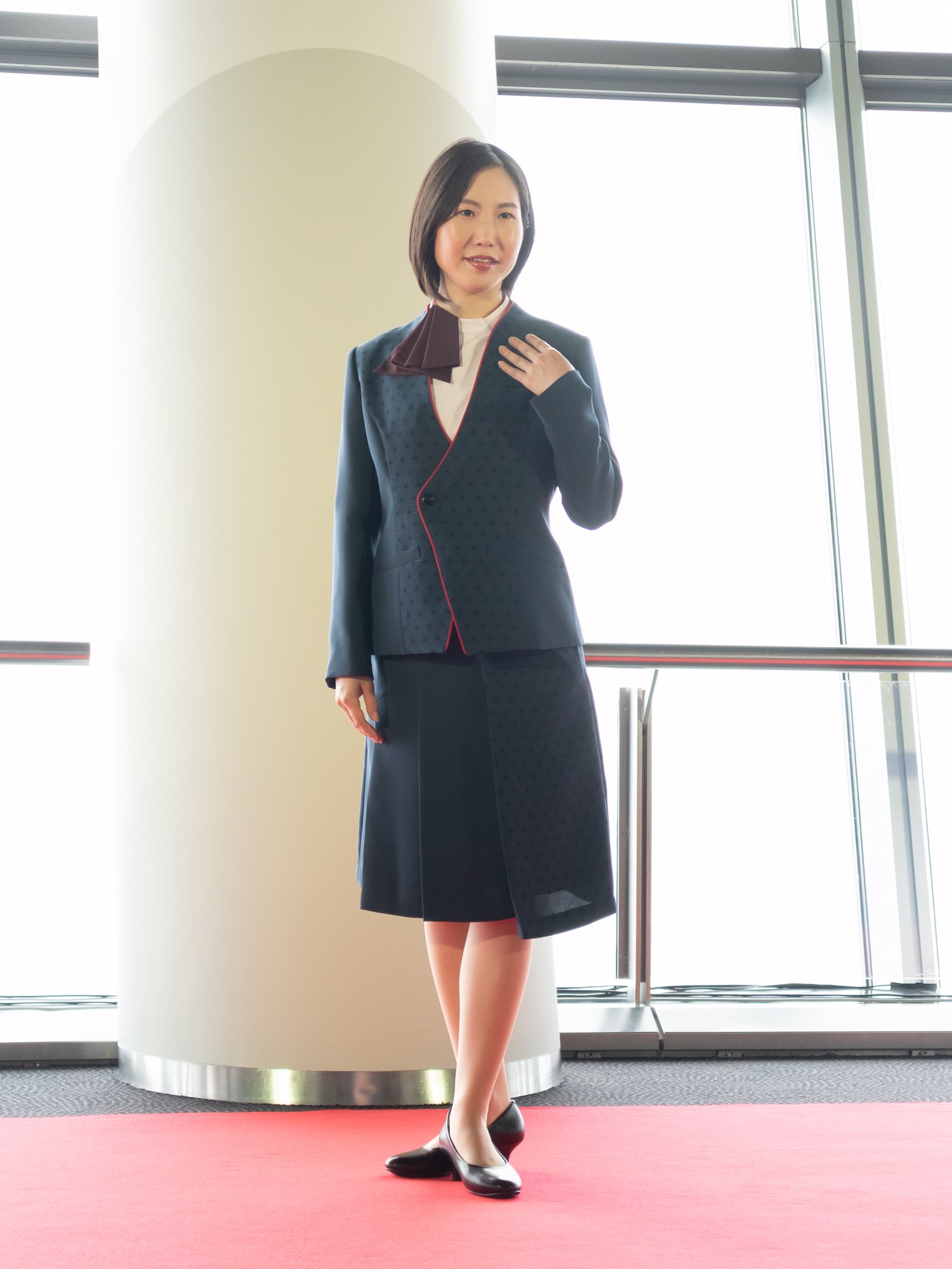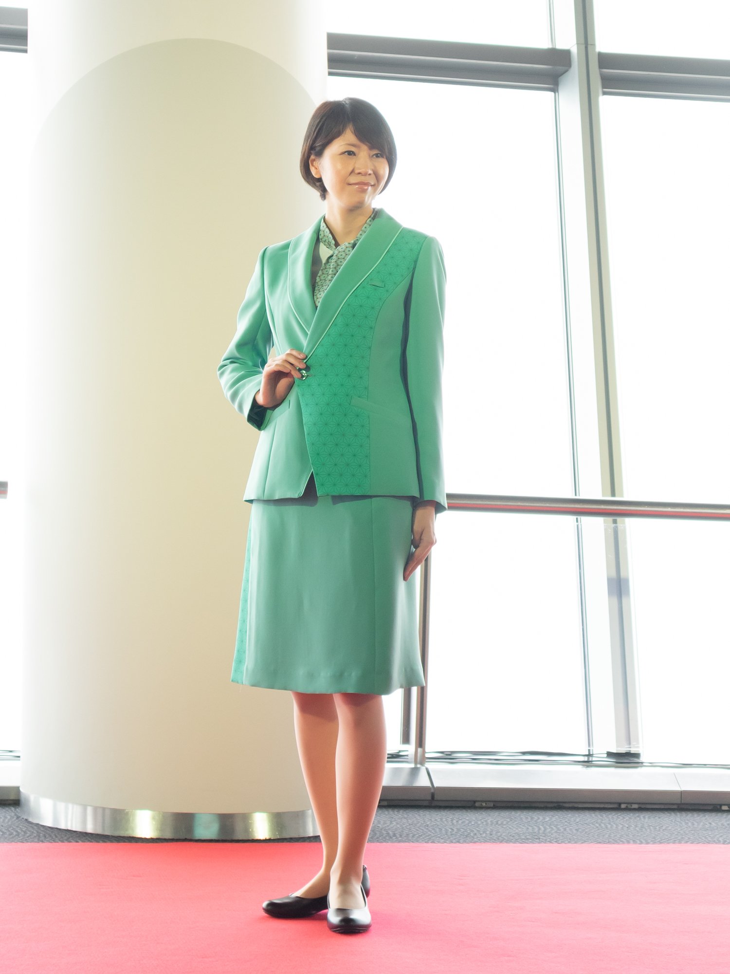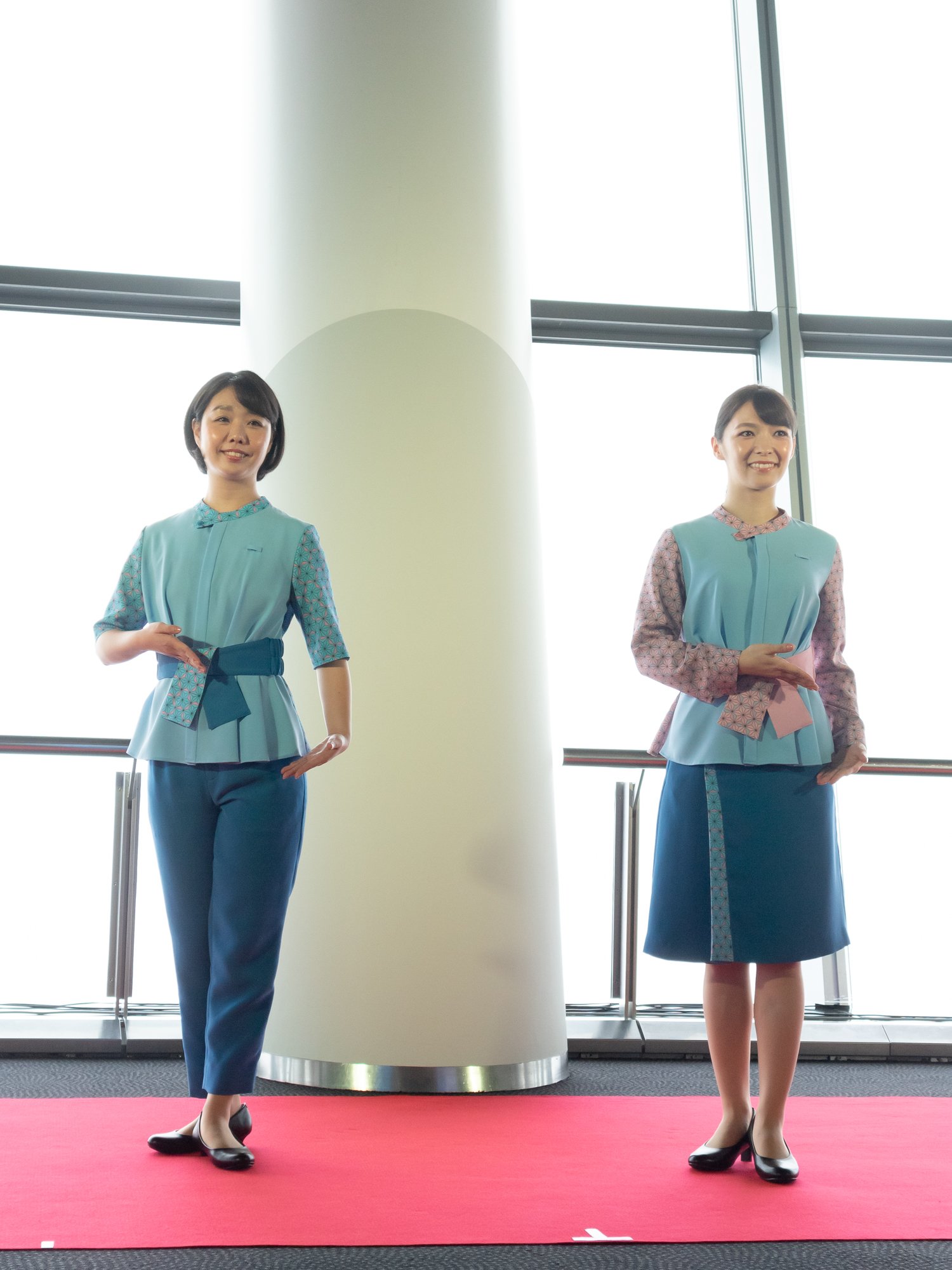 写真左から)東京スカイツリーオフィシャルショップスタッフ、外国人のお客さま対応カウンタースタッフ、インフォメーションスタッフ、ソラカラちゃん、チケットカウンター?誘導案内スタッフ(女性?秋冬)、チケットカウンター?誘導案内スタッフ(女性?春夏)、チケットカウンター?誘導案内スタッフ(男性?秋冬)