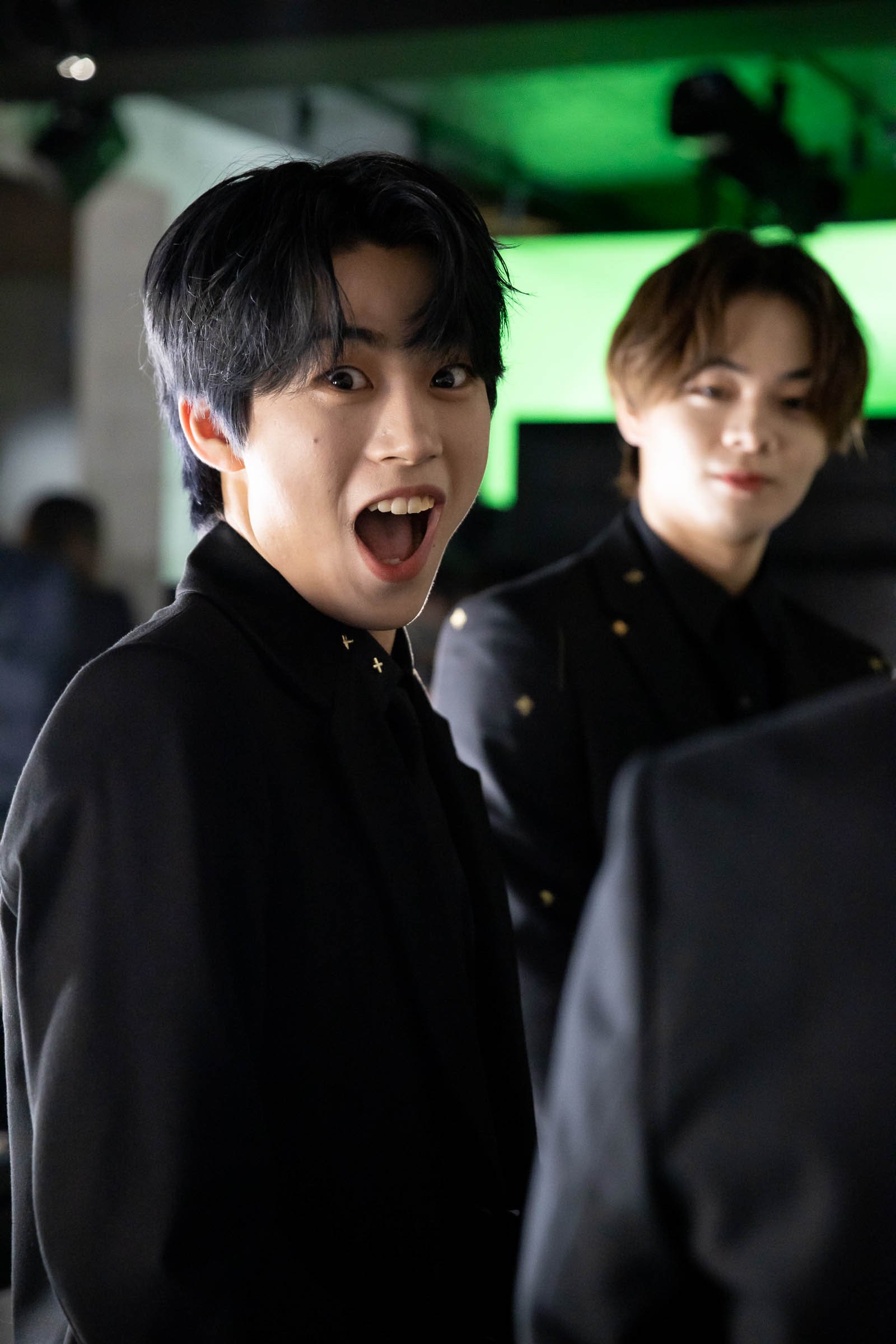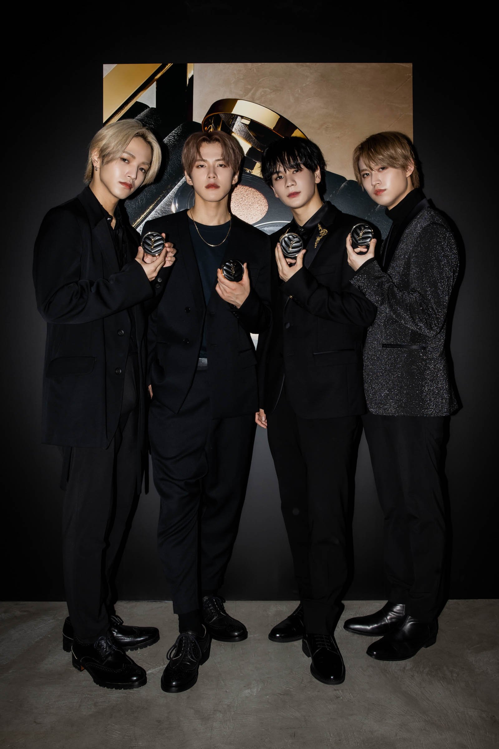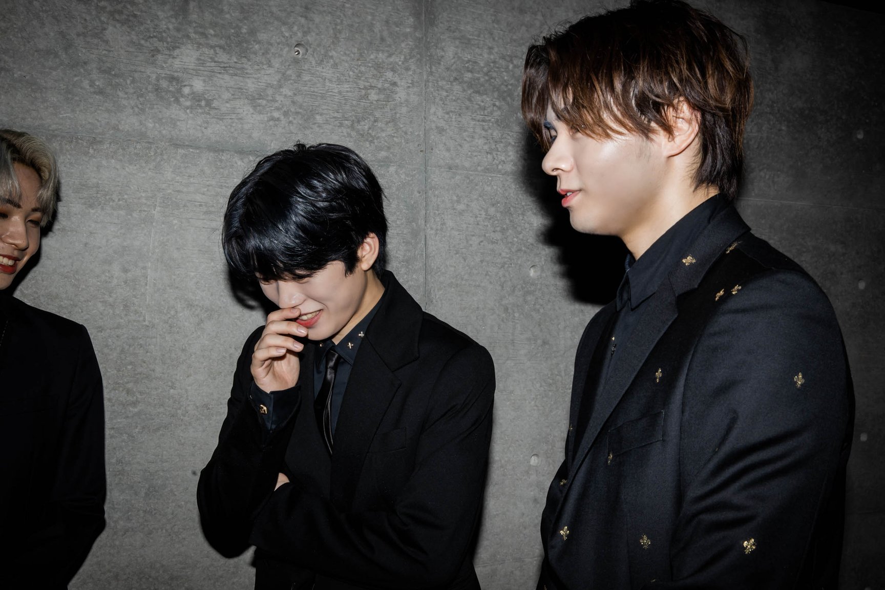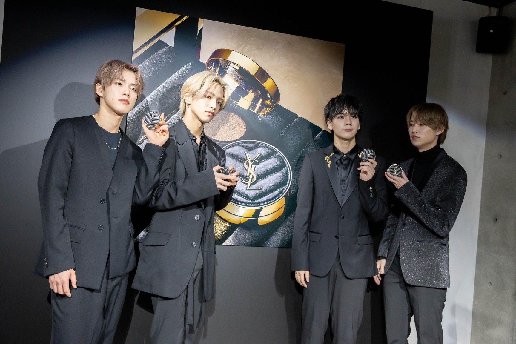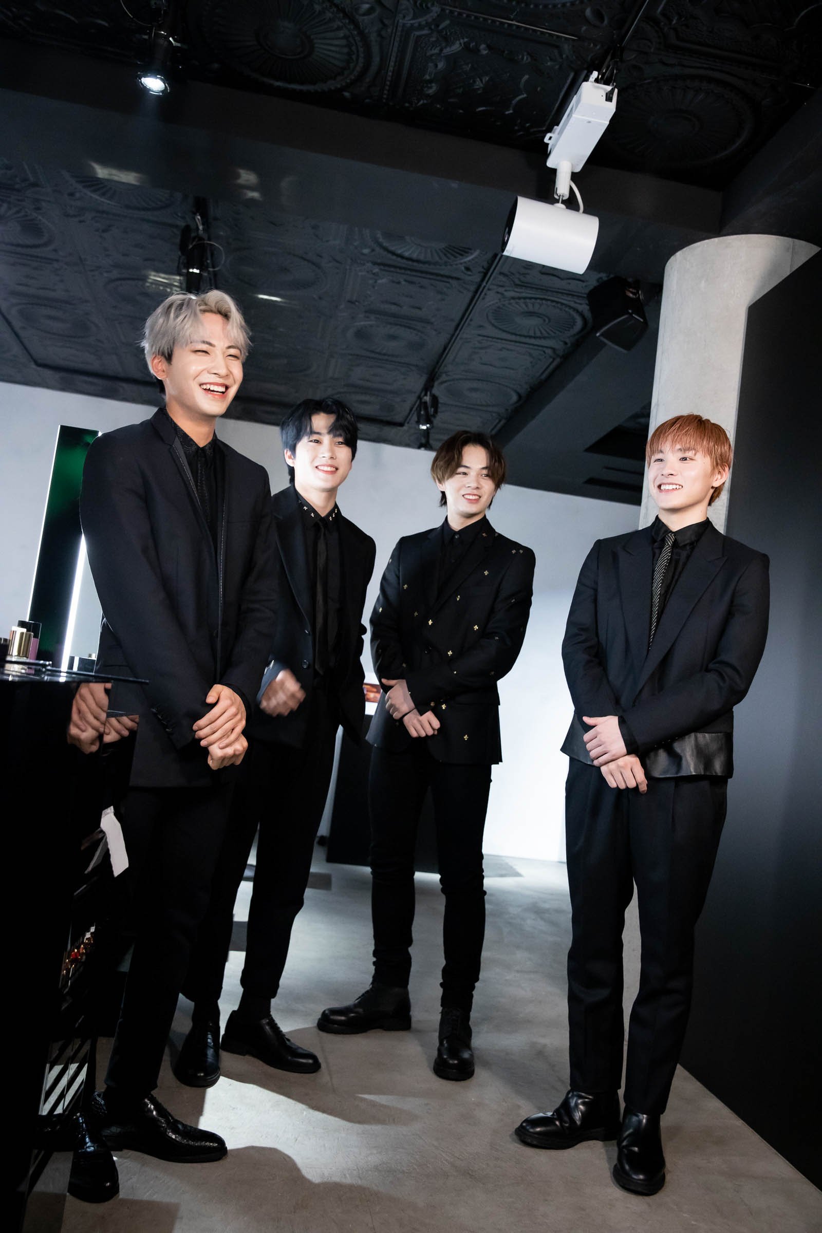 イベント会場には、タッチアップスペースやCG動画を作れるコーナー、商品をイメージした空間で撮影できるフォトブースなどを設置。メンバーは全員、新製品のパッケージのブラックを基調に、アクセサリーなどにゴールドを取り入れたスーツスタイルで来場した。白岩瑠姫は初のビューティイベント来場について聞かれると「僕たちは常識を打ち破るようなチャレンジに挑戦していくグループなので、新しくこのような場に招待いただけて嬉しいです。最近では男性のメイクも広がってきましたが、僕たちがそれを引っ張り、新たな常識を作っていきたいと思っています」とコメント。また、以前からブランドのベースアイテムを使用していたという佐藤景瑚は「今までのファンデーションも使い心地が良かったので、新作も楽しみにしていました。カバー力があるのに重たくならないので“買い“ですね」と新作の感想を述べた。川西拓実は「ヴィーガンレザーのパッケージデザインが男性が持っていてもカッコいい。レザーバッグからこれを取り出して使うと凄く様になりそうですよね」とデザインについて触れた。