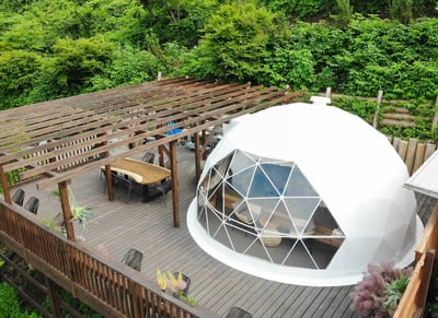 施設概要:ドームテント2台(1テントあたりダブルベット2台を設置し、大人4人まで宿泊可能)