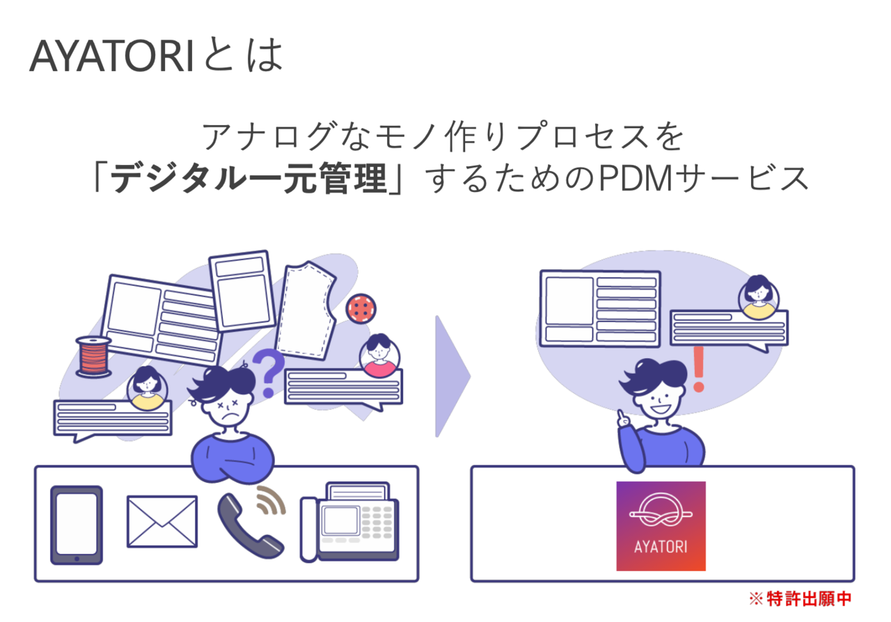 AYATORIは、一言で言うとアパレルものづくりのためのGitHub、あるいはものづくり用のLINEのような、業者間のコミュニケーションや情報の一元管理を支援するコラボレーションツールです。