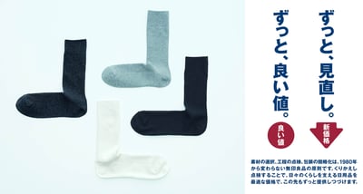 2020年秋冬シーズンは新型コロナウイルス感染拡大の影響で経済が停滞していることを受けて、日常生活に最も必要な「くらしの基本」となる衣料品を消費者が買いやすい価格設定にしているという。また、オーガニックコットンやノンミュールジングウール、夏に自然に抜け替わる冬毛を採取したヤクといった自然素材を用いたサステナブルなアイテムも価格改定の対象となっている。毎年人気の「ヤク混ウールクルーネックセーター」(4990円→3990円)、「脇に縫い目のないフランネルパジャマ」(4990円→3990円)、「首のチクチクをおさえた 洗えるワイドリブ編みタートルネック」(4990円→3990円)などが対象で、最大1000円の値下げを実施。顧客からの反応も良く、9月から価格を引き下げている「えらべる?足なり直角靴下シリーズ(大人、子供)」(大人 3足790円→3足690円、子ども 2足490円?→?3足690円)は特に売上が好調だという。