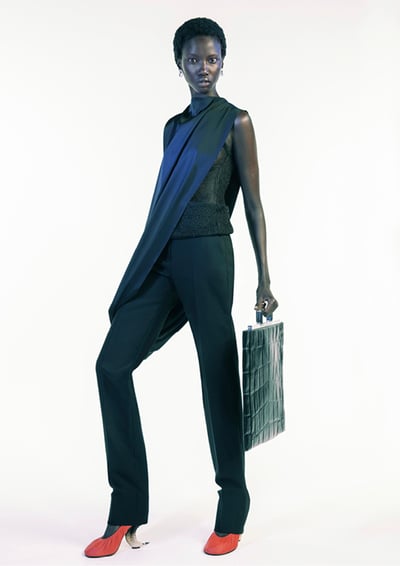 アクセサリーでは極太のチェーンが目立ち、再解釈された「アンティゴナバッグ」や新作の「カットアウトバッグ」は幅広いサイズと素材で展開されている。ウィリアムズならではのスポーティーなボディバッグはレザー素材でラグジュアリーに。シューズでは、3本指の動物の足(=tripedal)を模したという「トライプ??トゥシューズ」とストッキング、そしてソールに厚みのある「マシュマロ?スライド」といったアイコニックなアイテムが揃う。