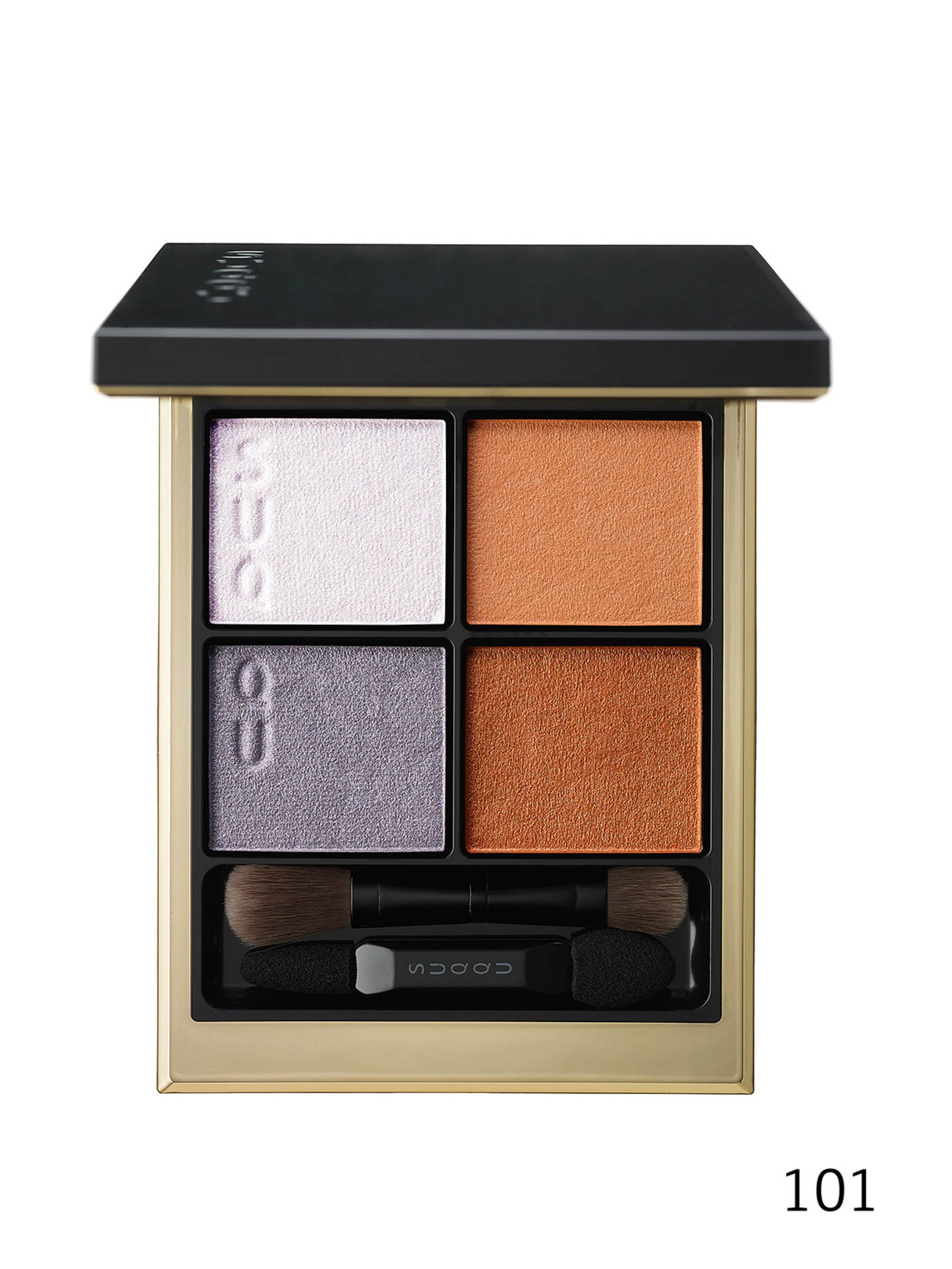 カラーラインナップは、モーヴトープ×セピアグレーが知性と個性を引き出す「01 瑞花-MIZUHANA-」、オレンジコーラル×トープが品のいい温かみを感じさせる「02 陽香色-YOUKOUIRO」、ベーシックでありながらモダンな印象のサンドベージュ×ゴールデンブラウン「03 光暮-HIKARIGURE」、デザイニング?カラー?アイズで一番人気の「04?絢撫子-AYANADESHIKO」の進化版で凛とした女性らしさを強調したチャームピンク×サーモンピンク「04 純撫子-SUMINADESHIKO」、サフランレッド×シックブラウンがスタイリッシュで品格のある雰囲気に仕上げる「05 緋影-AKEKAGE」、モードカーキ×ヌーディブラウンが程よい甘さとエッジなニュアンスを生む「06 深奏-FUKAKANADE」の6色を定番のラインナップとして用意。春の朝にたなびく雲のような濃淡の紫と陽だまりのようなオレンジでフレッシュかつモード感のあるアイメイクを完成させる「101 春雲-HARUGUMO」は数量限定カラーとして販売する。